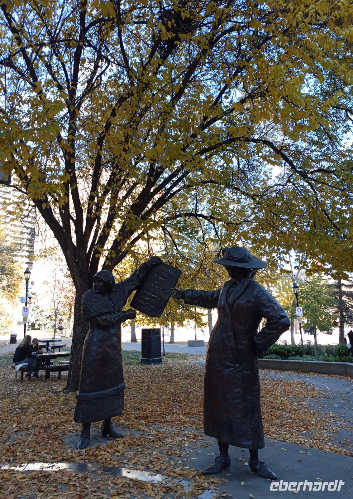 Die große Plattform vor dem „Kondiaronk Belvédèr“ ist von bunten herbstlichen Blumen umrahmt und strahlt in der Morgensonne. Auf der Rückfahrt in die Stadt machen wir noch einen Stopp auf der Rückseite des Mont Royals und blicken auf den anderen Teil der Stadt. Auf der Fahrt hinunter in die Stadt fahren wir am Monument von Sir George-Étienne Cartier, vorbei. Cartier hat eine führende Rolle im Prozess der Gründung des kanadischen Bundes gespielt.