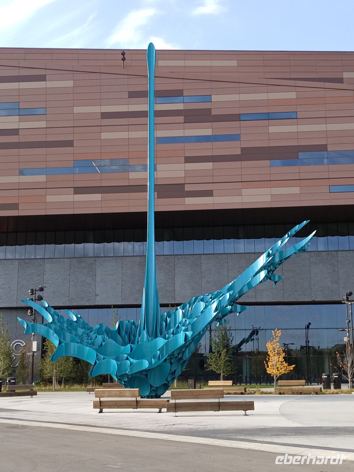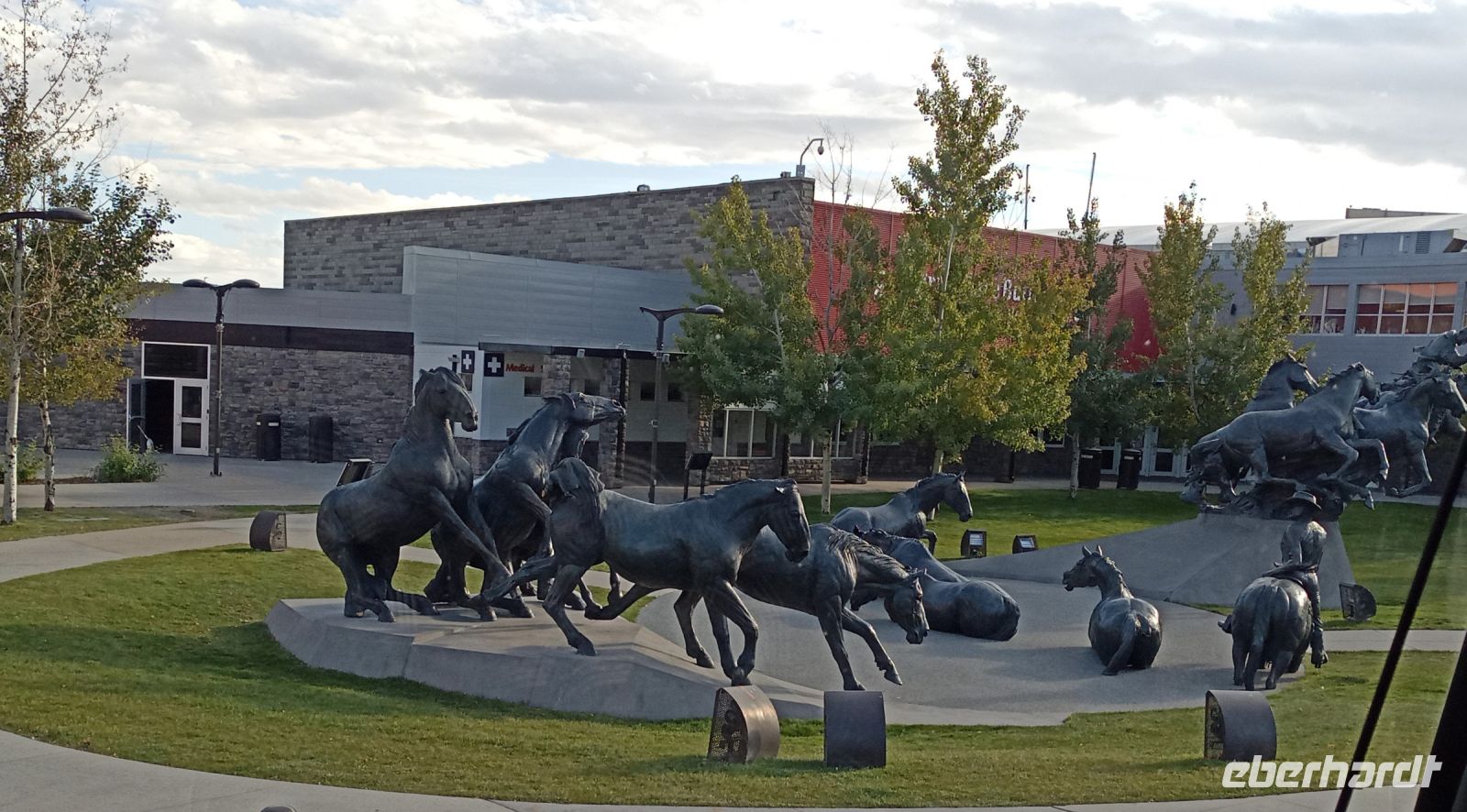 Auf dem Weg aus der Stadt machen wir noch ein Halt an „Saddledome“ – einer Mehrzweckarena für Sport- und Kulturveranstaltungen und steigen über die Holztreppe zu dem Aussichtspunkt - Scotsman’s Hill. Von hier haben wir ein wunderschönes Panorama auf die Skylines von Calgary in der Nachmittagssonne. Vor der Arena sind Statuen von fünf Pferden - die Statuen erinnern an die Bedeutung von Pferden für die frühen Siedler, Viehzüchter und die Entwicklung der Landwirtschaft in Alberta. Sie repräsentieren die Cowboy-Kultur, die in der Geschichte Calgarys verwurzelt ist und durch Veranstaltungen wie die „Calgary Stampede“- eines des der größten und berühmtesten Rodeo- und Western-Festivals der Welt, gefeiert wird.