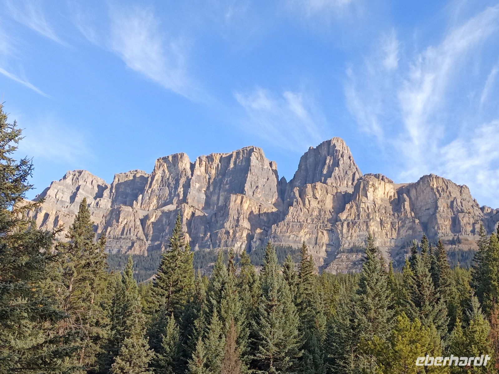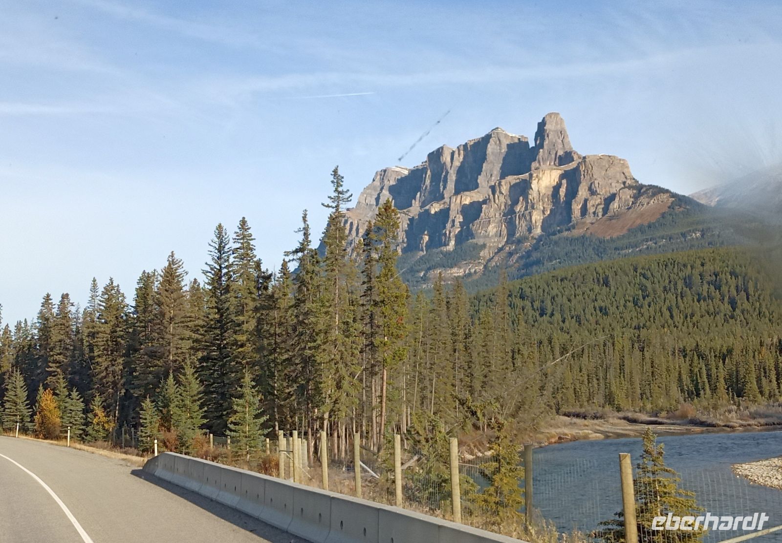 Auf der Fahrt erzählte uns Marion spannende Fakten über die Region. Die Rocky Mountains, die sich über 4.800 Kilometer erstrecken, bilden das imposante Rückgrat Nordamerikas und sind weltbekannt für ihre majestätischen Gipfel und Gletscher. Der Banff National Park, der älteste Nationalpark Kanadas, erstreckt sich über 6.641 Quadratkilometer und schützt eine Vielzahl von Tierarten und Naturlandschaften. Während wir die Bergstraßen entlangfuhren boten sich atemberaubende Ausblicke auf schneebedeckte Gipfel vor einem tiefblauen Himmel und grüner Umrandung der Kiefernwälder. Auf der rechten Seite sehen wir die Castle Mountains mit einer Höhe von 2.766 Meter, die wirklich wie eine Festung aussehen.