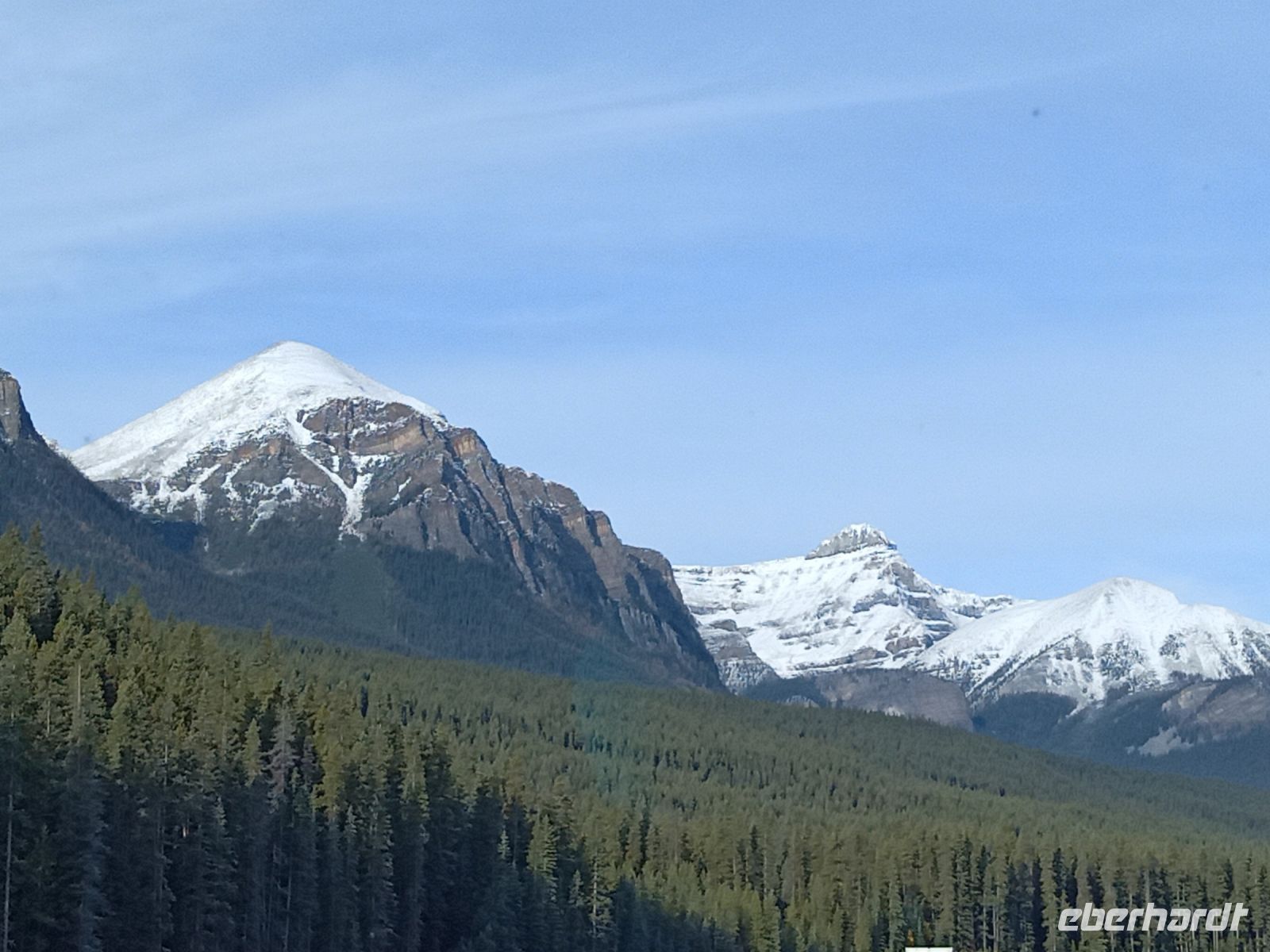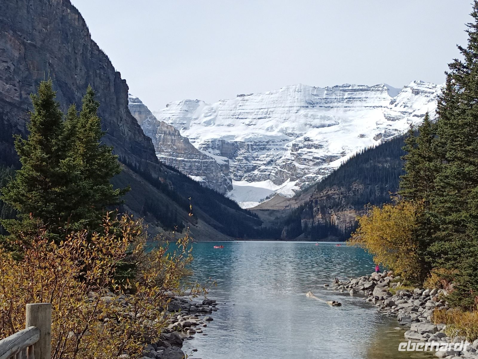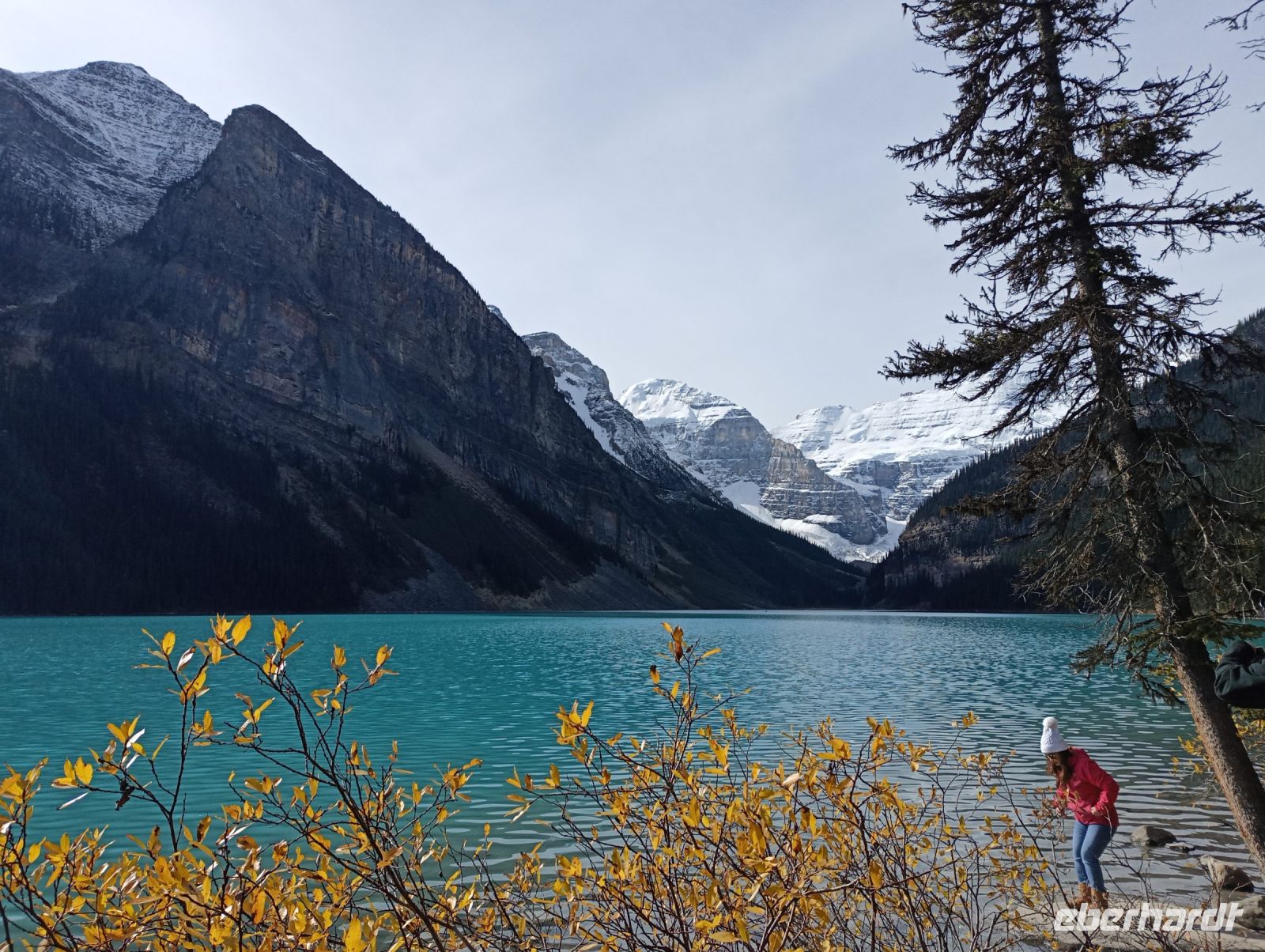 So beeindruckt fahren wir zu dem Lake Louise. Ein Gletschersee in 1.750 Meter Höhe erhielt den Namen der Princess Louise Caroline Alberta, Tochter von Königin Victoria. Der Lake Louise wird vom Victoria-Gletscher gespeist, der hoch über dem See thront. Das Panorama von Lake Louis bilden die markanten Mount Victoria (3.464) m), Fairview Mountain (2.744 m), Mount Lefroy (3.423 m) und noch einige weitere Gipfel.