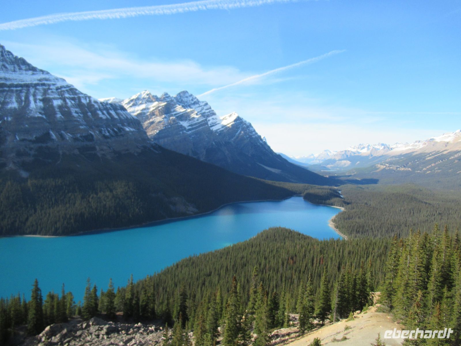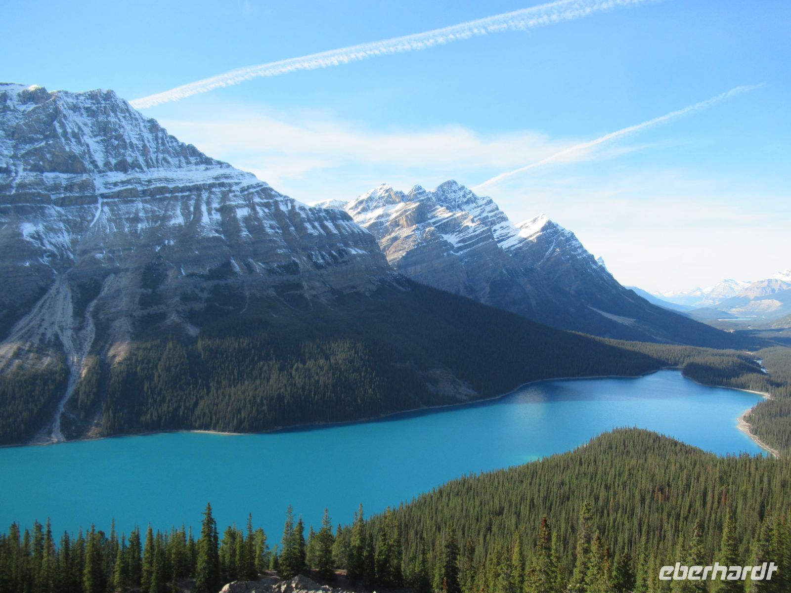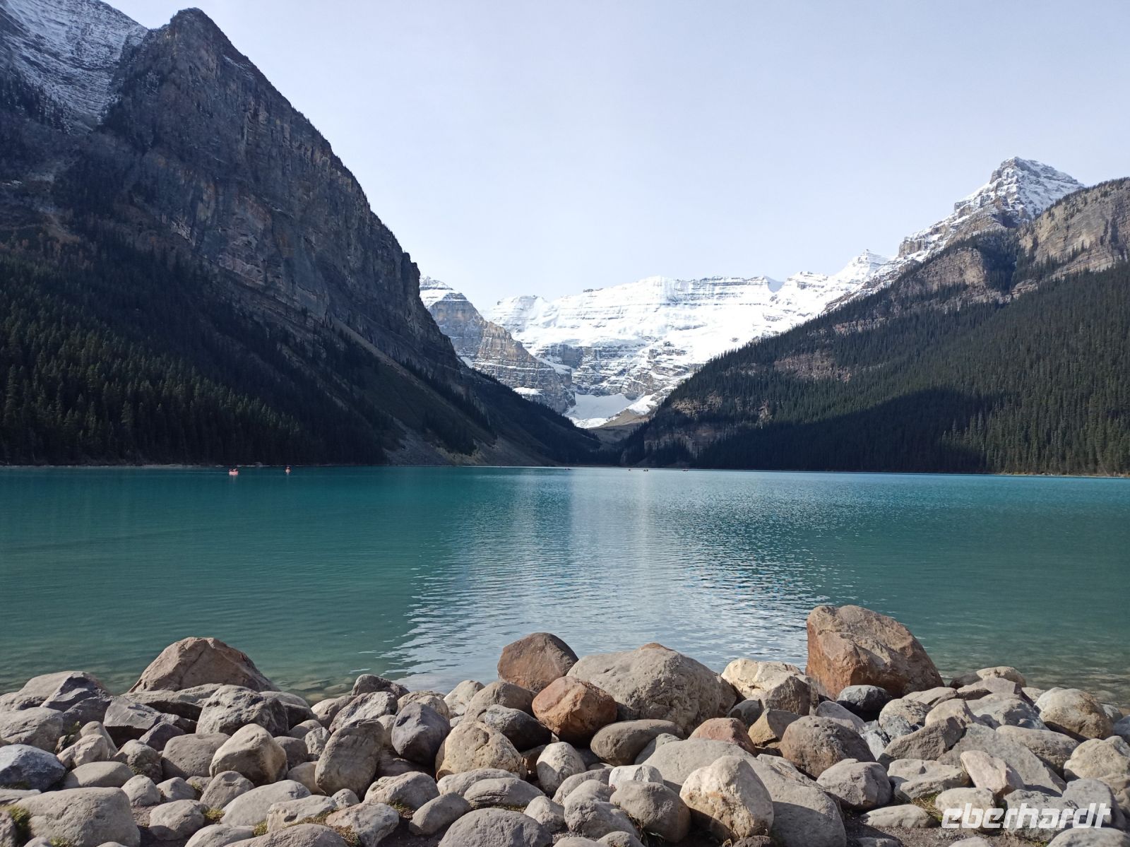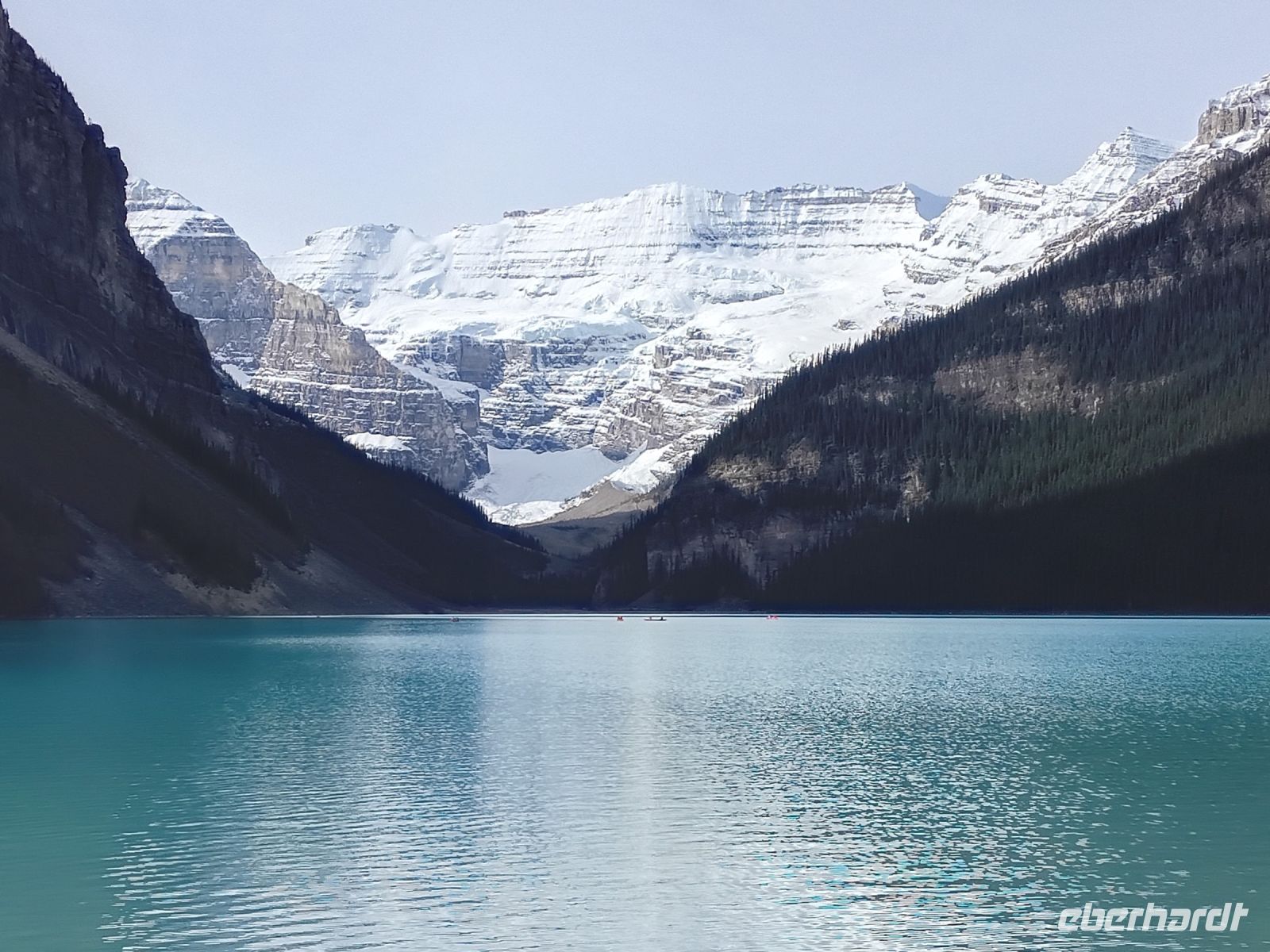 So beeindruckt fahren wir zu dem Lake Louise. Ein Gletschersee in 1.750 Meter Höhe erhielt den Namen der Princess Louise Caroline Alberta, Tochter von Königin Victoria. Der Lake Louise wird vom Victoria-Gletscher gespeist, der hoch über dem See thront. Das Panorama von Lake Louis bilden die markanten Mount Victoria (3.464) m), Fairview Mountain (2.744 m), Mount Lefroy (3.423 m) und noch einige weitere Gipfel.
