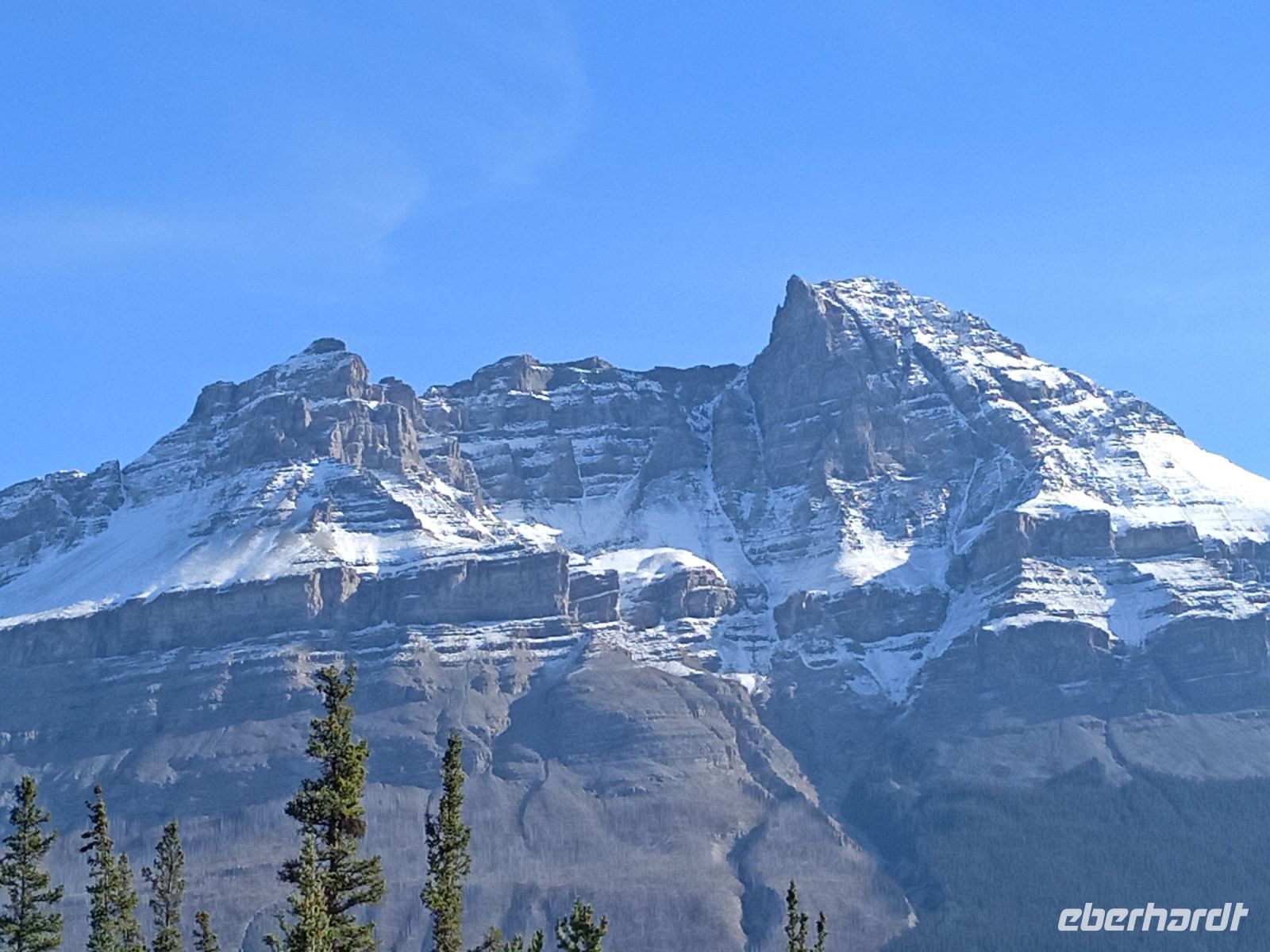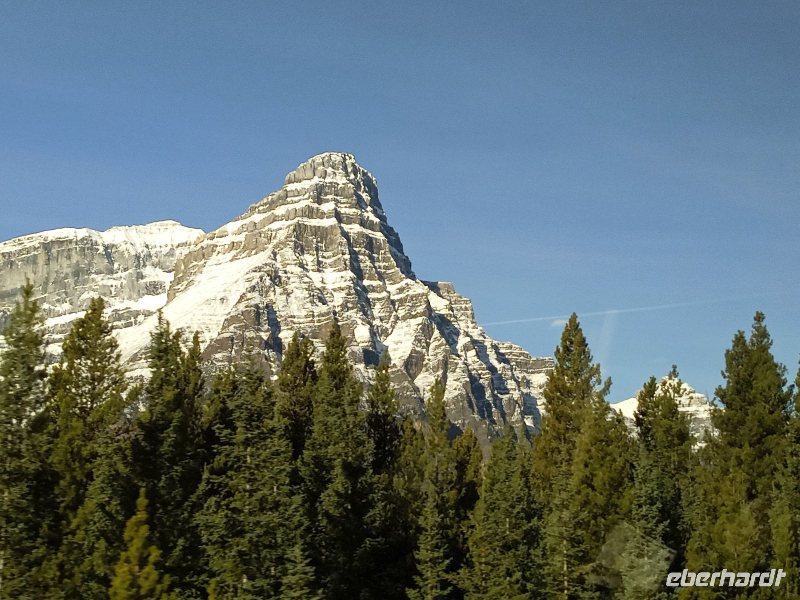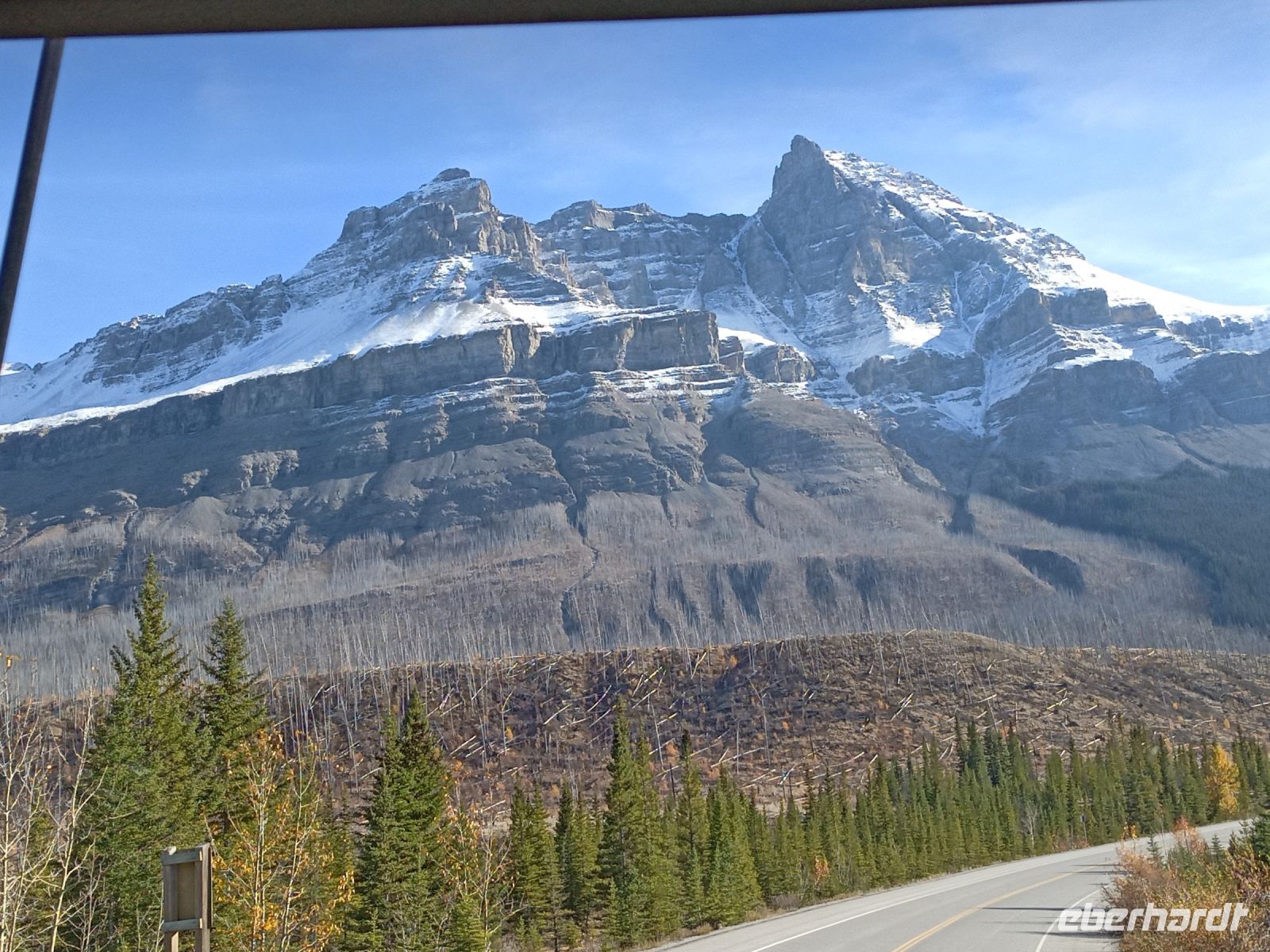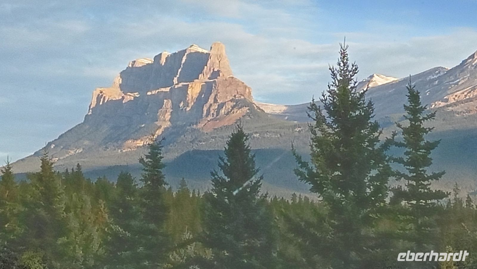 Auf der Rückfahrt haben wir jetzt genügend Zeit die Schönheit der Strecke ausgiebig zu genießen. Diesmal hielten wir an mehreren Seen und Aussichtspunkten. Unser erster Stopp ist am Waterfowl Lake. Nach dem eisigen Erlebnis des Gletschers überraschte ich die Gäste mit einer „Wärme von Innen“ und schenkte einen Ahornsirup-Whisky aus, den ich zuvor in Flachmänner umgefüllt habe. Die Geste kam bei den Gästen gut an, auch wenn der süßliche Geschmack nicht bei Allen Anklang fand. Aber Ahornsirup wird hier in verschieden Variationen eingesetzt und dass sollen wir auch ausprobieren. Weitere Stopps machen wir an Peyto Lake, Bow Lake und Hector Lake – hier kann man nur sagen, Bilder sagen mehr als tausend Worte… Vorbei an diesem markanten Gipfel von Castle Mountain, führte uns die Straße schließlich zurück nach Banff.