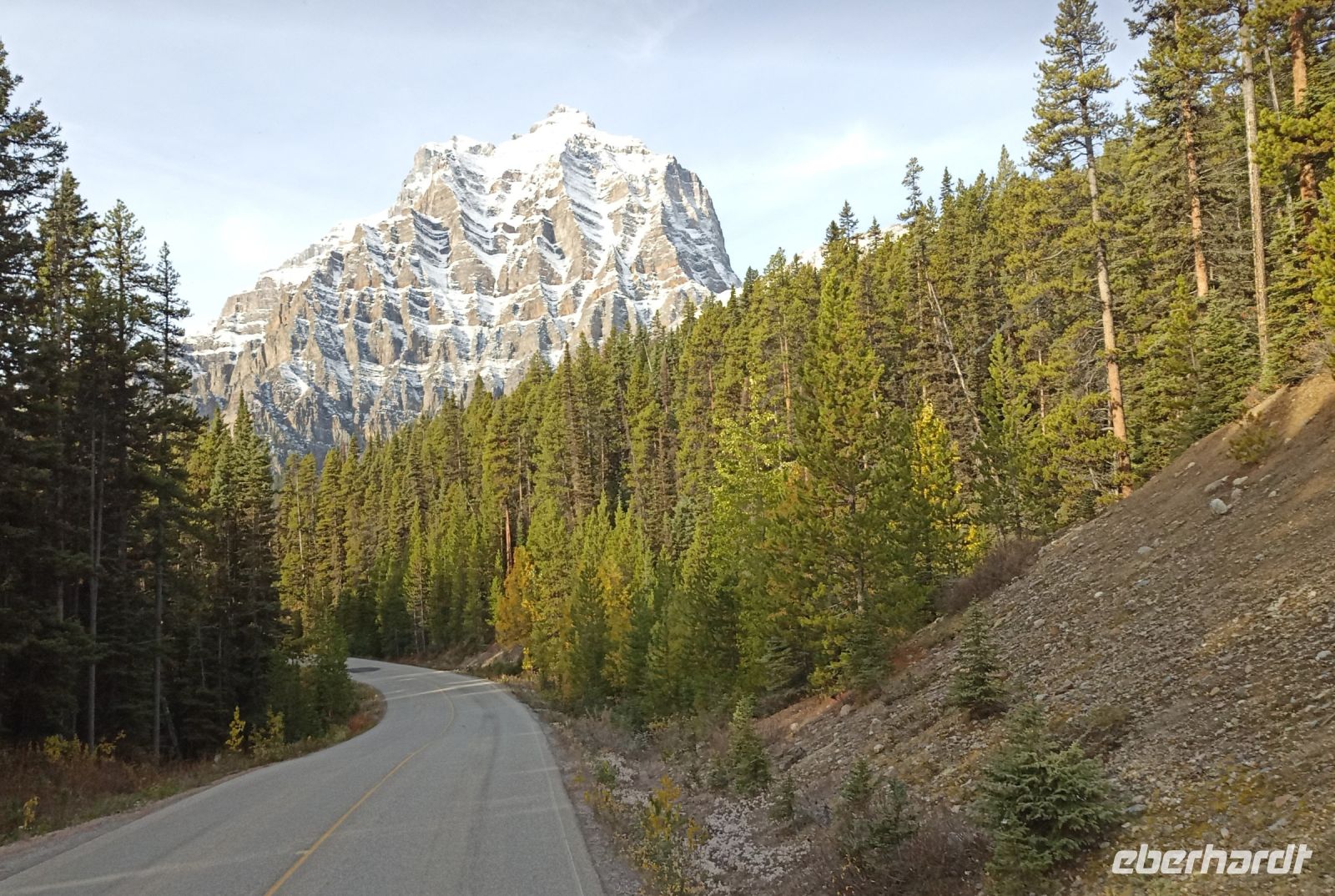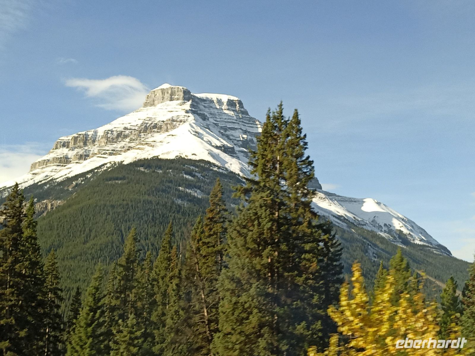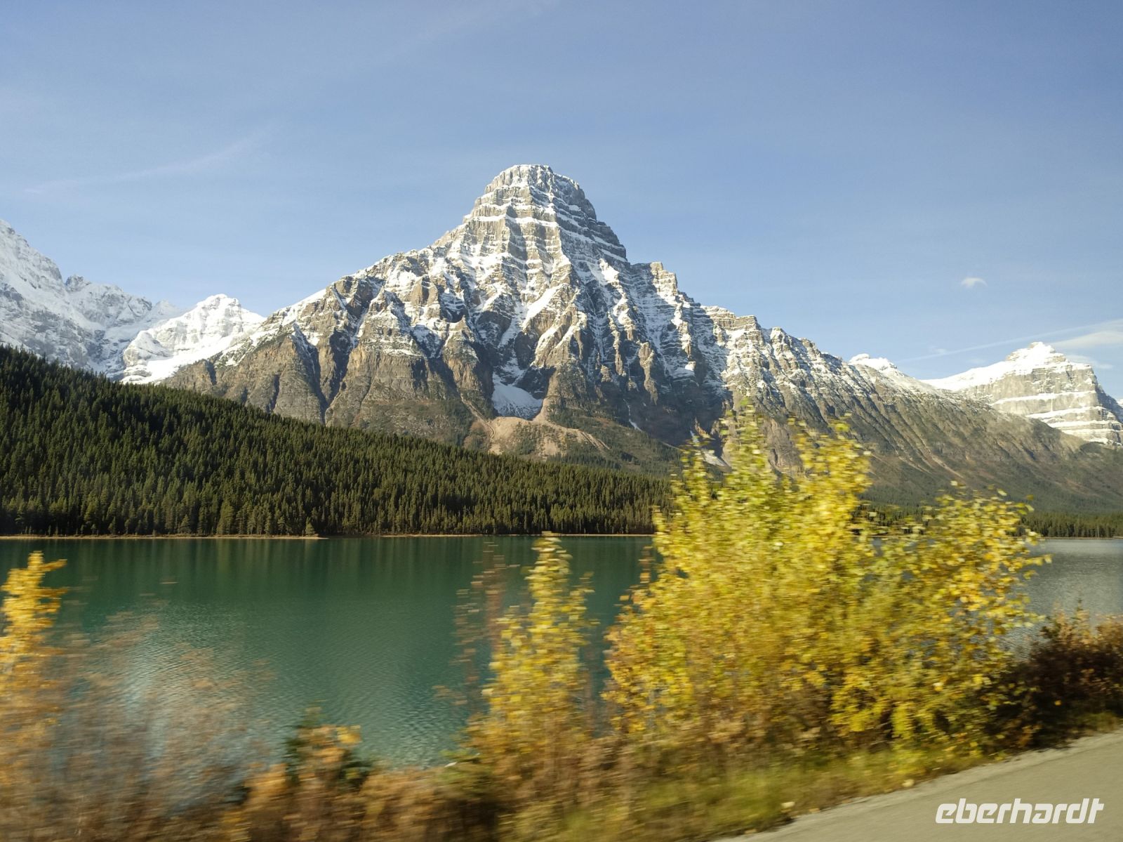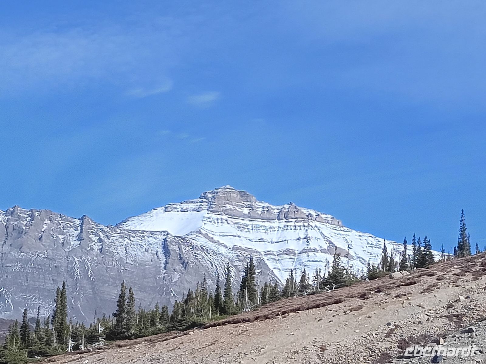 Auf der Rückfahrt haben wir jetzt genügend Zeit die Schönheit der Strecke ausgiebig zu genießen. Diesmal hielten wir an mehreren Seen und Aussichtspunkten. Unser erster Stopp ist am Waterfowl Lake. Nach dem eisigen Erlebnis des Gletschers überraschte ich die Gäste mit einer „Wärme von Innen“ und schenkte einen Ahornsirup-Whisky aus, den ich zuvor in Flachmänner umgefüllt habe. Die Geste kam bei den Gästen gut an, auch wenn der süßliche Geschmack nicht bei Allen Anklang fand. Aber Ahornsirup wird hier in verschieden Variationen eingesetzt und dass sollen wir auch ausprobieren. Weitere Stopps machen wir an Peyto Lake, Bow Lake und Hector Lake – hier kann man nur sagen, Bilder sagen mehr als tausend Worte… Vorbei an diesem markanten Gipfel von Castle Mountain, führte uns die Straße schließlich zurück nach Banff.