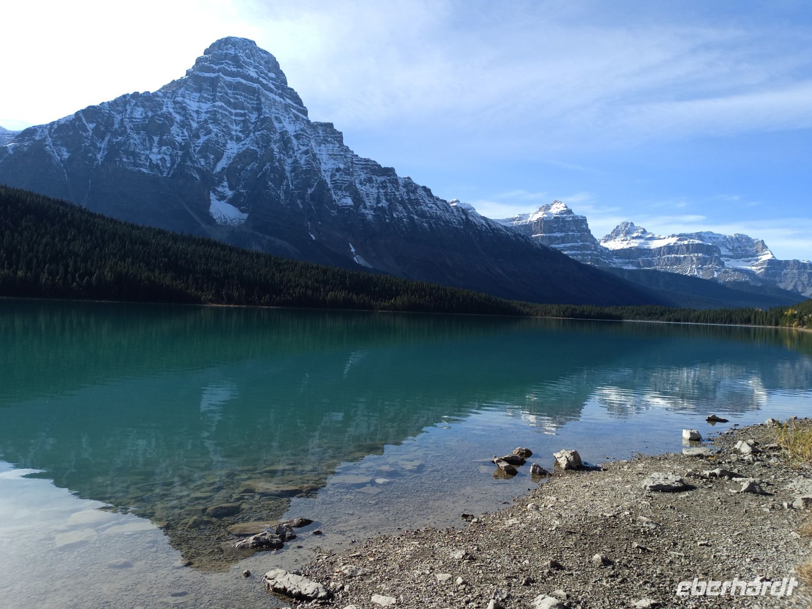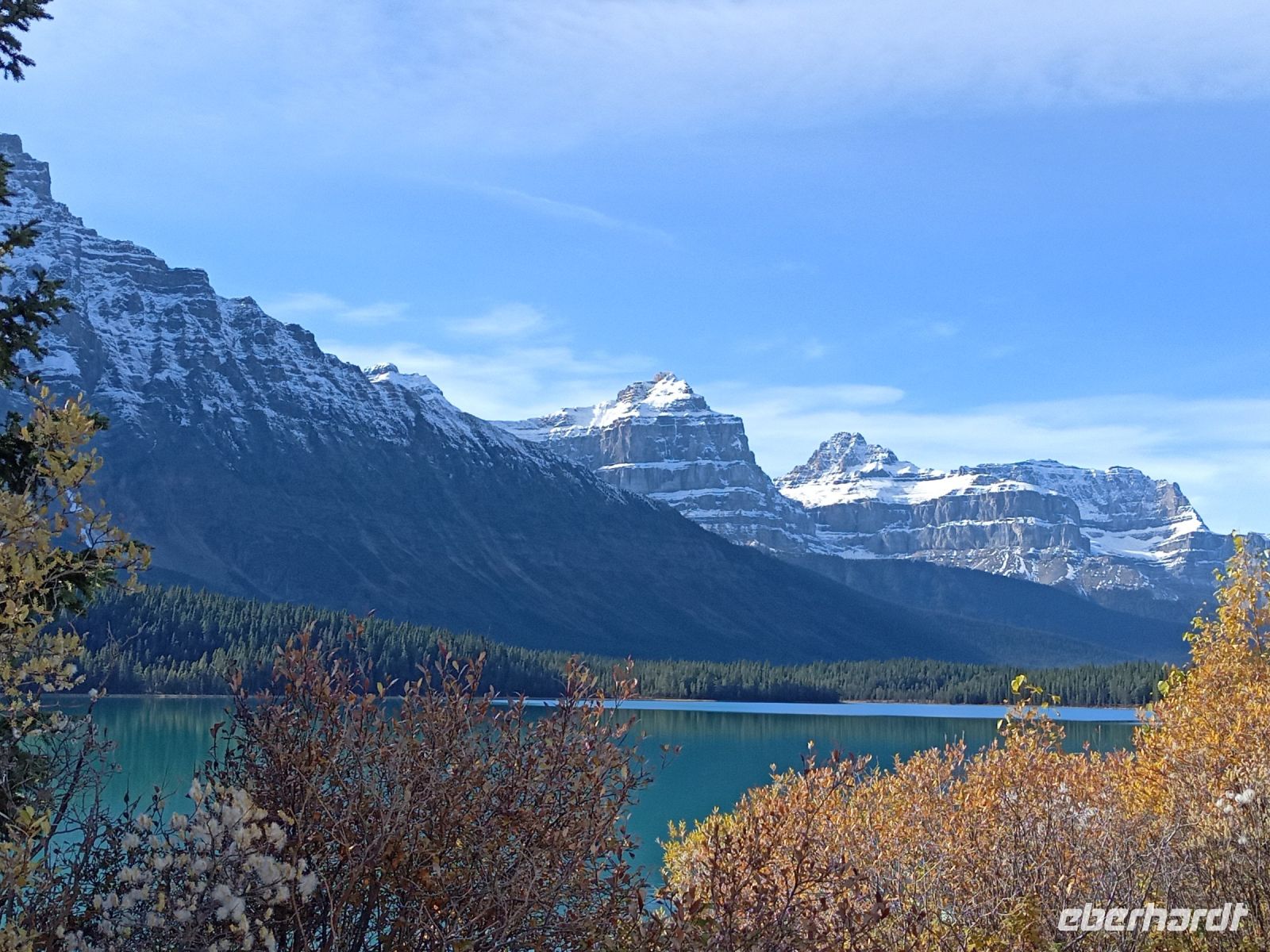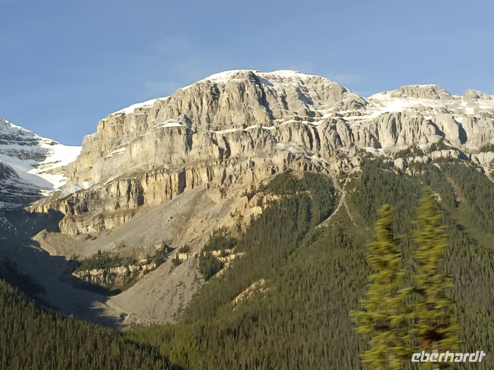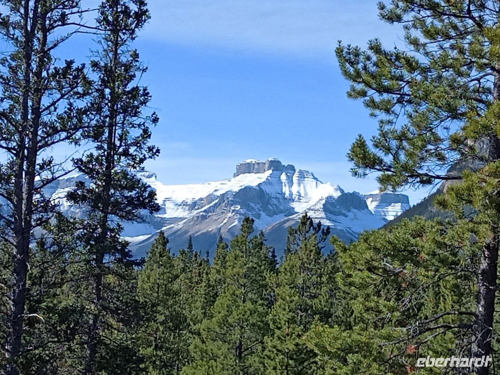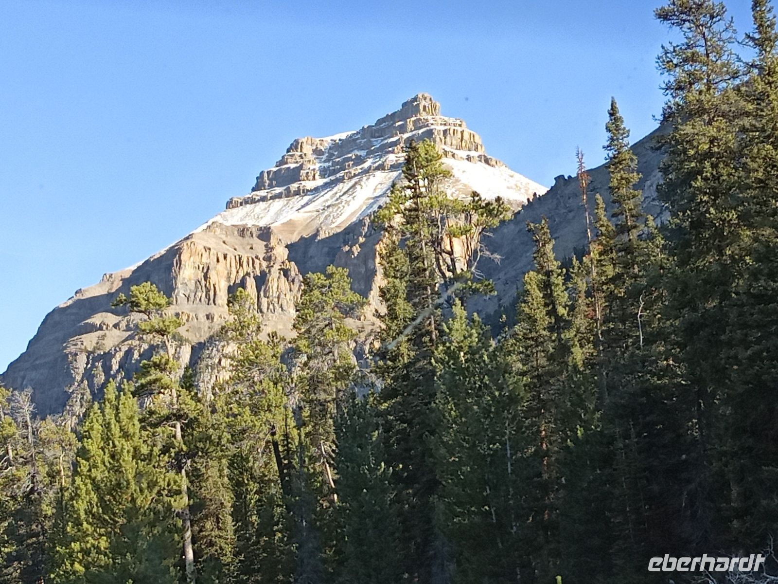 Auf der Rückfahrt haben wir jetzt genügend Zeit die Schönheit der Strecke ausgiebig zu genießen. Diesmal hielten wir an mehreren Seen und Aussichtspunkten. Unser erster Stopp ist am Waterfowl Lake. Nach dem eisigen Erlebnis des Gletschers überraschte ich die Gäste mit einer „Wärme von Innen“ und schenkte einen Ahornsirup-Whisky aus, den ich zuvor in Flachmänner umgefüllt habe. Die Geste kam bei den Gästen gut an, auch wenn der süßliche Geschmack nicht bei Allen Anklang fand. Aber Ahornsirup wird hier in verschieden Variationen eingesetzt und dass sollen wir auch ausprobieren. Weitere Stopps machen wir an Peyto Lake, Bow Lake und Hector Lake – hier kann man nur sagen, Bilder sagen mehr als tausend Worte… Vorbei an diesem markanten Gipfel von Castle Mountain, führte uns die Straße schließlich zurück nach Banff.
