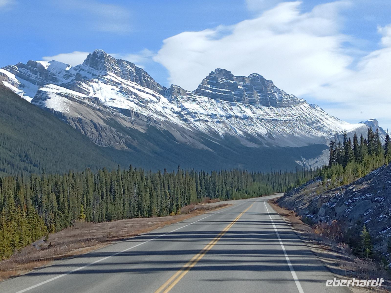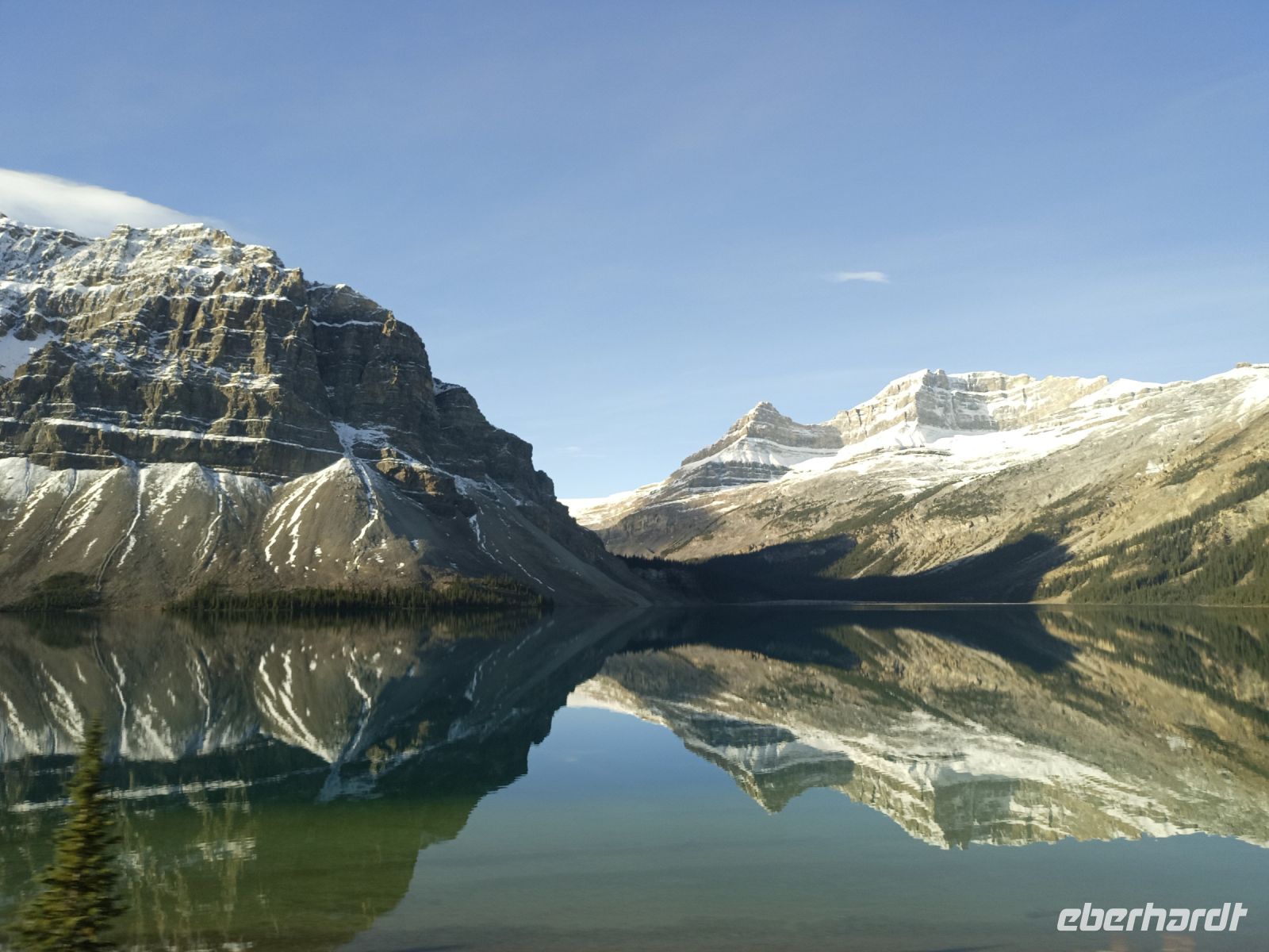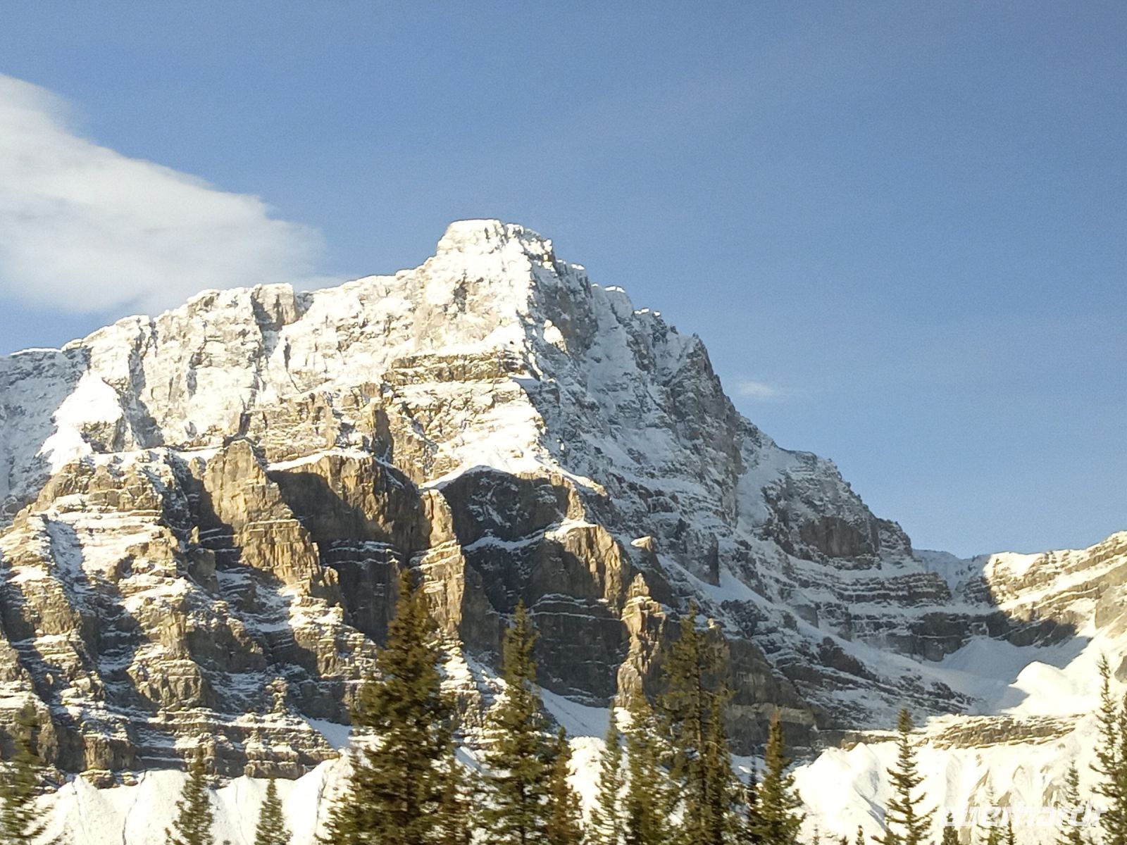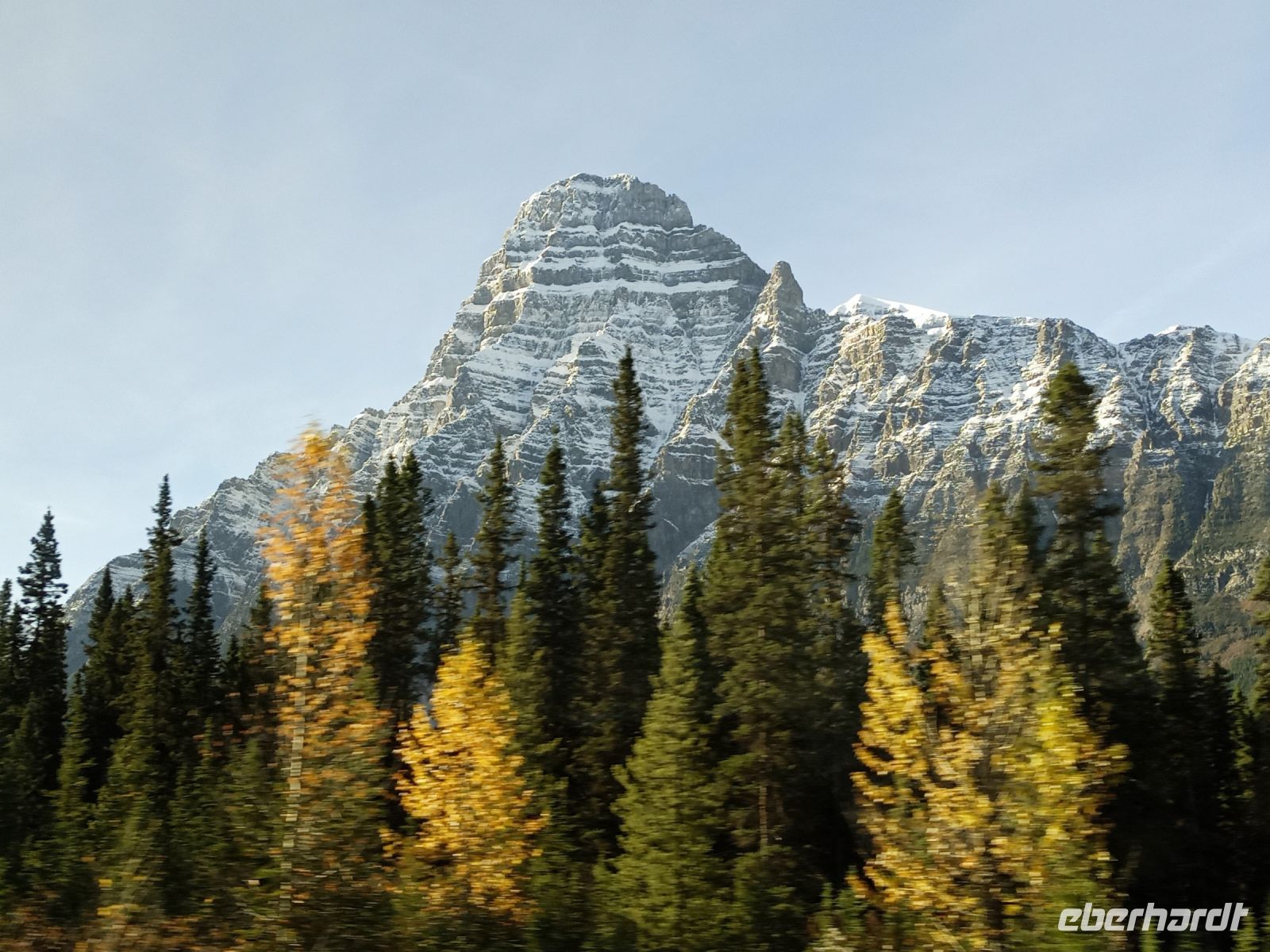 Auf der Rückfahrt haben wir jetzt genügend Zeit die Schönheit der Strecke ausgiebig zu genießen. Diesmal hielten wir an mehreren Seen und Aussichtspunkten. Unser erster Stopp ist am Waterfowl Lake. Nach dem eisigen Erlebnis des Gletschers überraschte ich die Gäste mit einer „Wärme von Innen“ und schenkte einen Ahornsirup-Whisky aus, den ich zuvor in Flachmänner umgefüllt habe. Die Geste kam bei den Gästen gut an, auch wenn der süßliche Geschmack nicht bei Allen Anklang fand. Aber Ahornsirup wird hier in verschieden Variationen eingesetzt und dass sollen wir auch ausprobieren. Weitere Stopps machen wir an Peyto Lake, Bow Lake und Hector Lake – hier kann man nur sagen, Bilder sagen mehr als tausend Worte… Vorbei an diesem markanten Gipfel von Castle Mountain, führte uns die Straße schließlich zurück nach Banff.