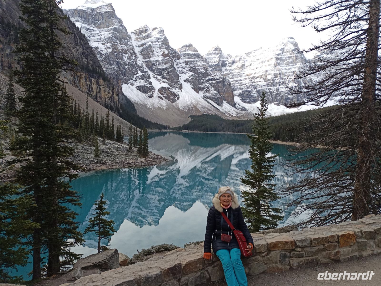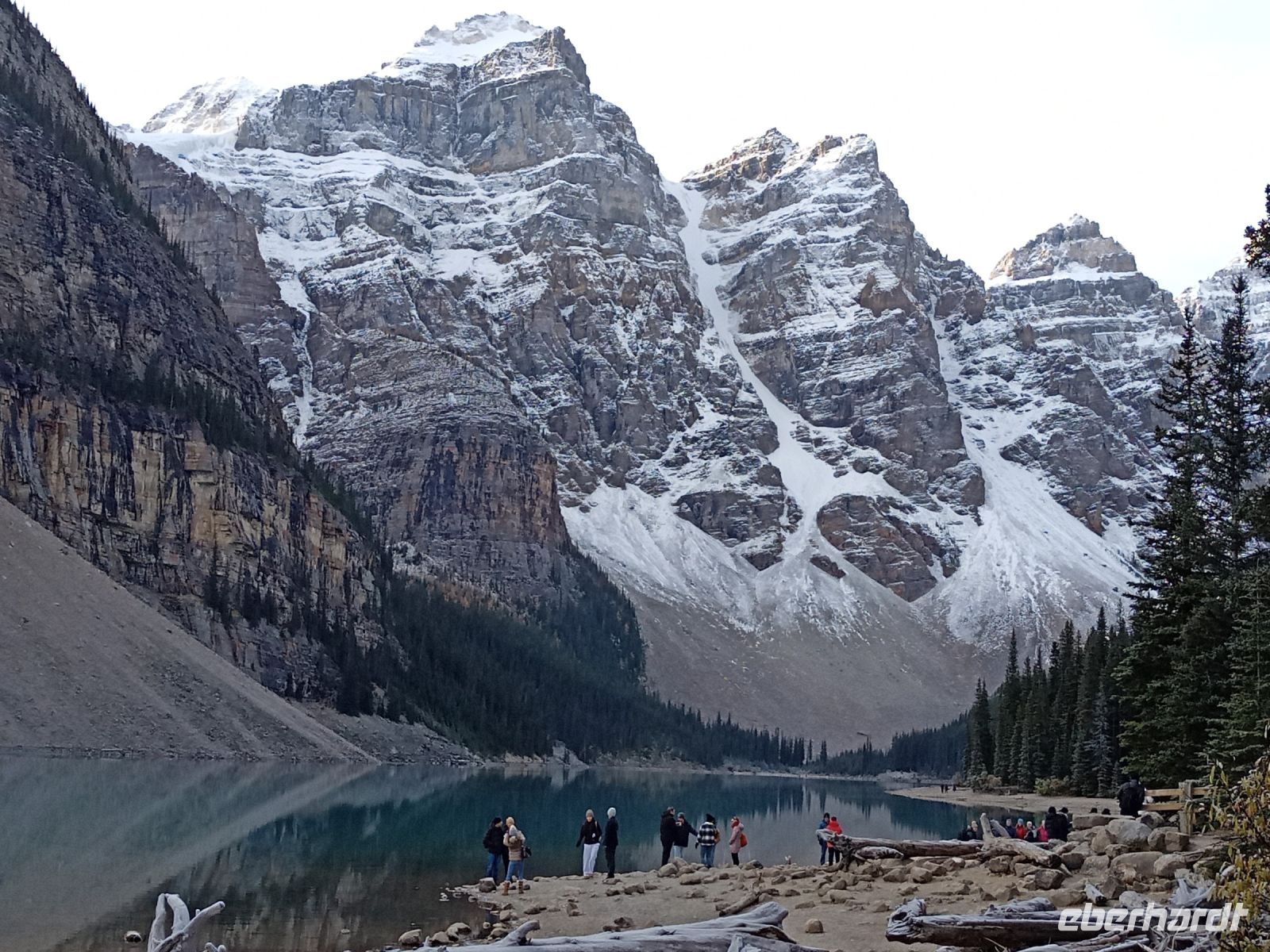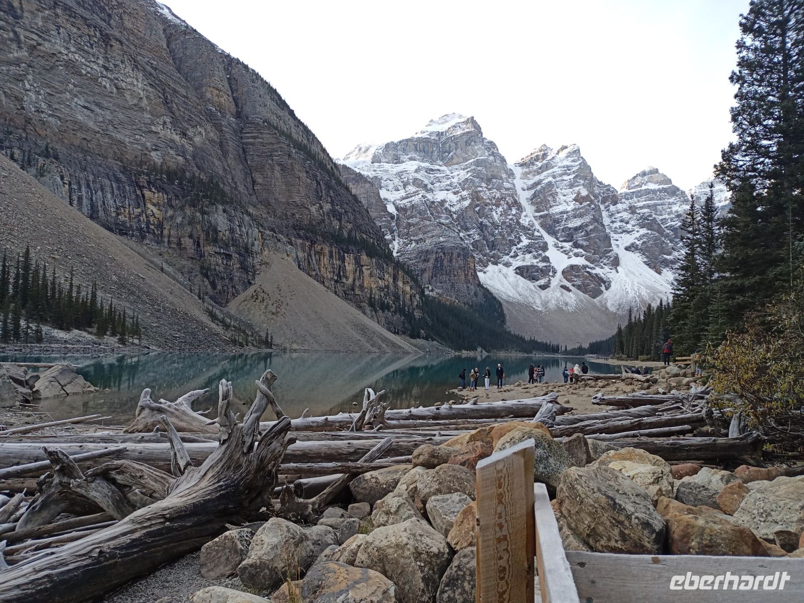 Wir teilen uns. Eine Gruppe macht erst einen Spaziergang am Lake und wir sind überwältigt von dieser Schönheit. Dann folgen wir der Empfehlung von Marion und stiegen noch die Steinmoräne hinauf, um den berühmten Panoramablick zu genießen –Wow! so ein grandioses Bild auf die weiß gezuckerte Ten Peaks – und den smaragdgrünen See, in dem sich die Berge spiegeln. Wie aus dem Bilderbuch – oder noch schöner – da live. Der höchste der zehn Gipfel ist der bereits erwähnte Mount Temple.