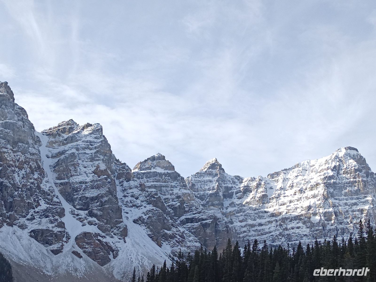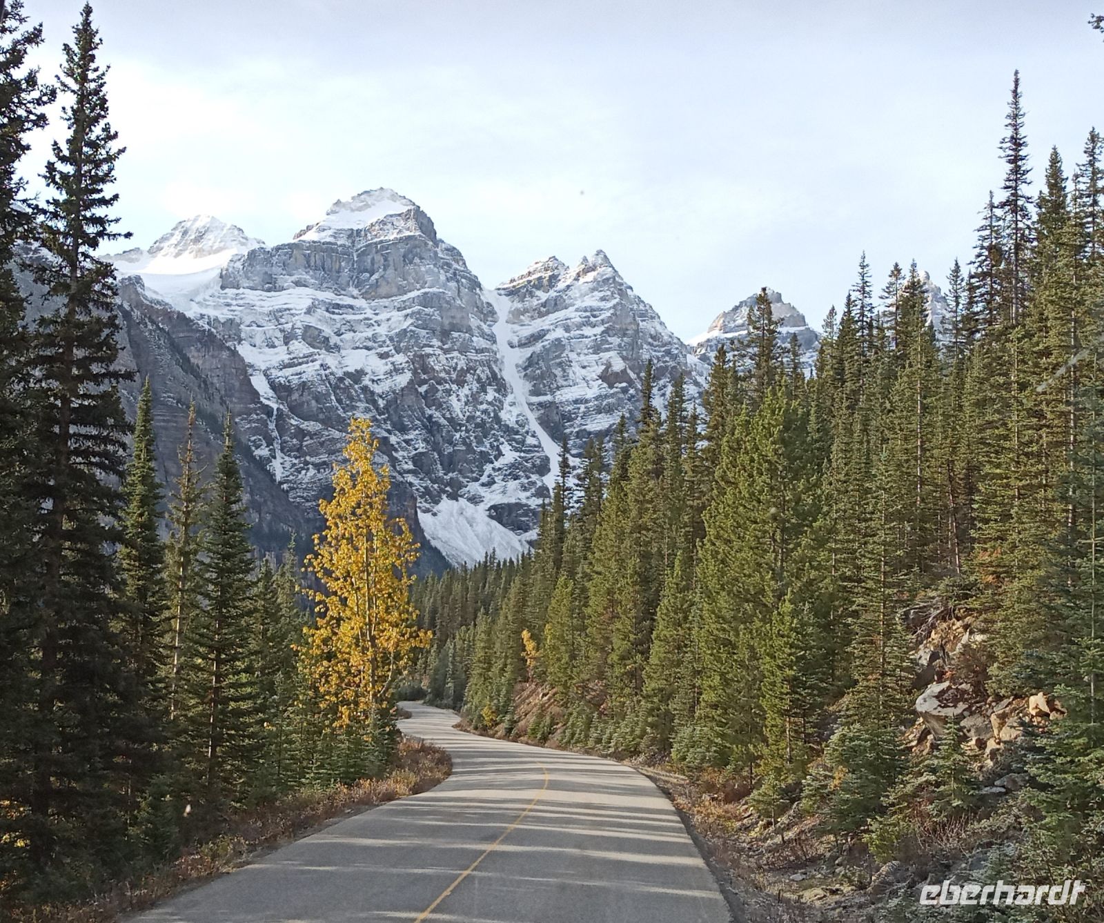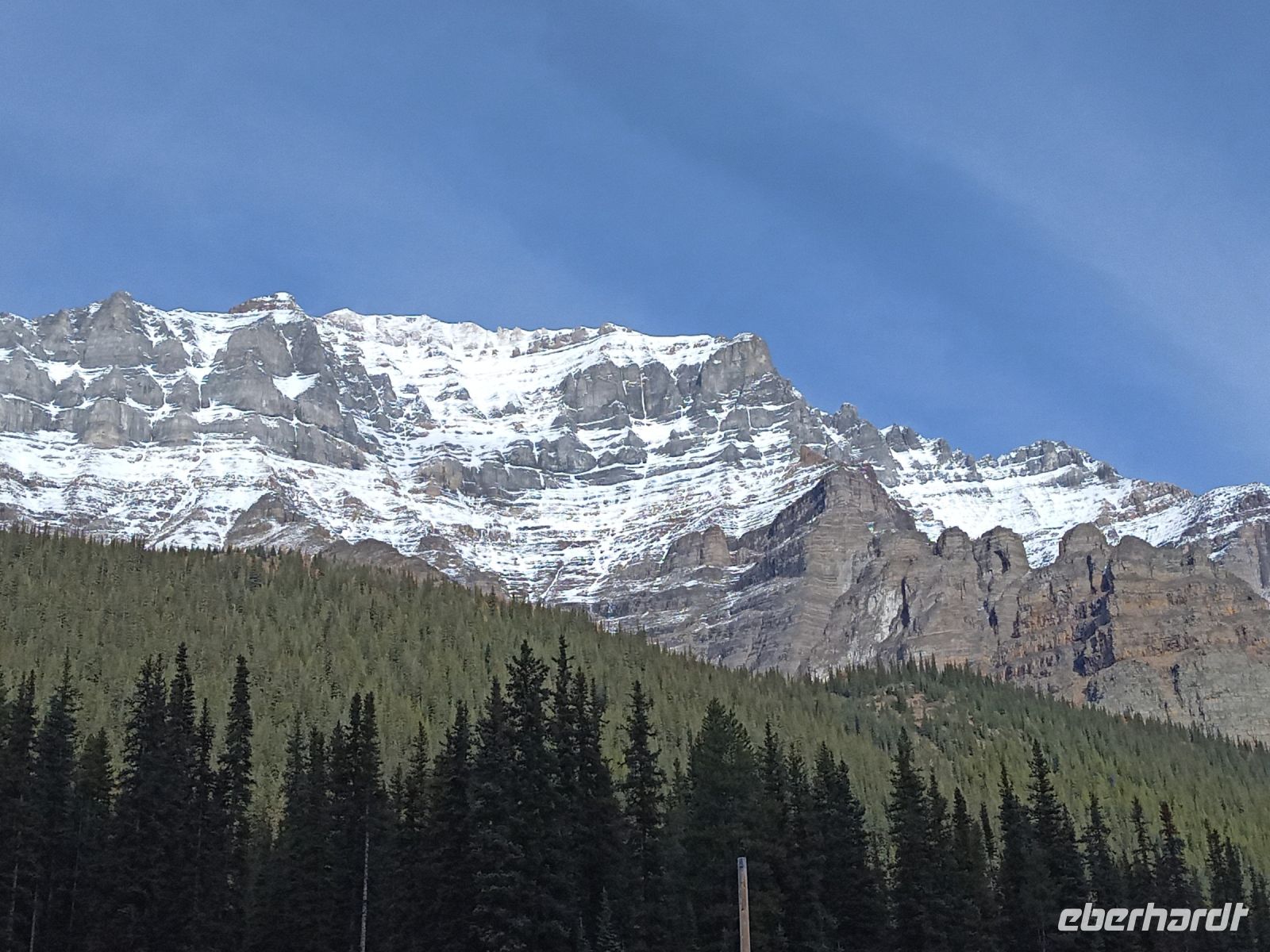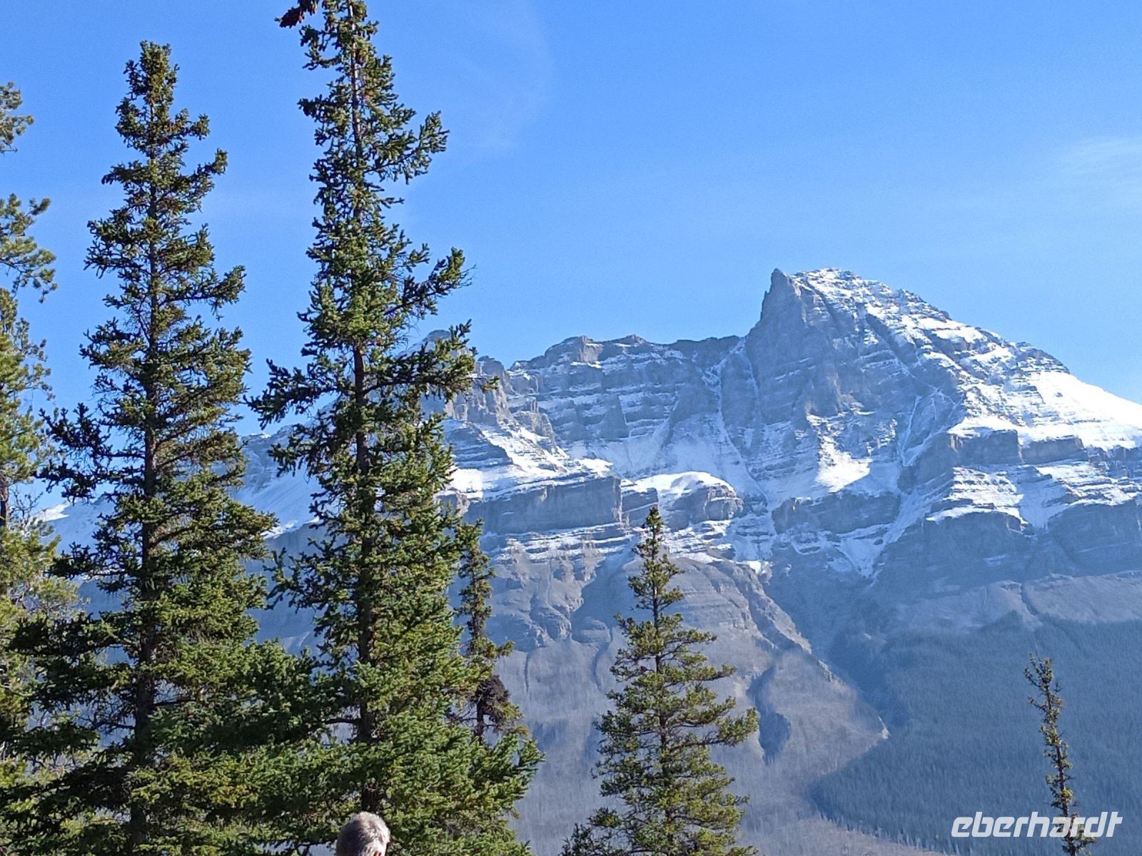 Wir teilen uns. Eine Gruppe macht erst einen Spaziergang am Lake und wir sind überwältigt von dieser Schönheit. Dann folgen wir der Empfehlung von Marion und stiegen noch die Steinmoräne hinauf, um den berühmten Panoramablick zu genießen –Wow! so ein grandioses Bild auf die weiß gezuckerte Ten Peaks – und den smaragdgrünen See, in dem sich die Berge spiegeln. Wie aus dem Bilderbuch – oder noch schöner – da live. Der höchste der zehn Gipfel ist der bereits erwähnte Mount Temple.