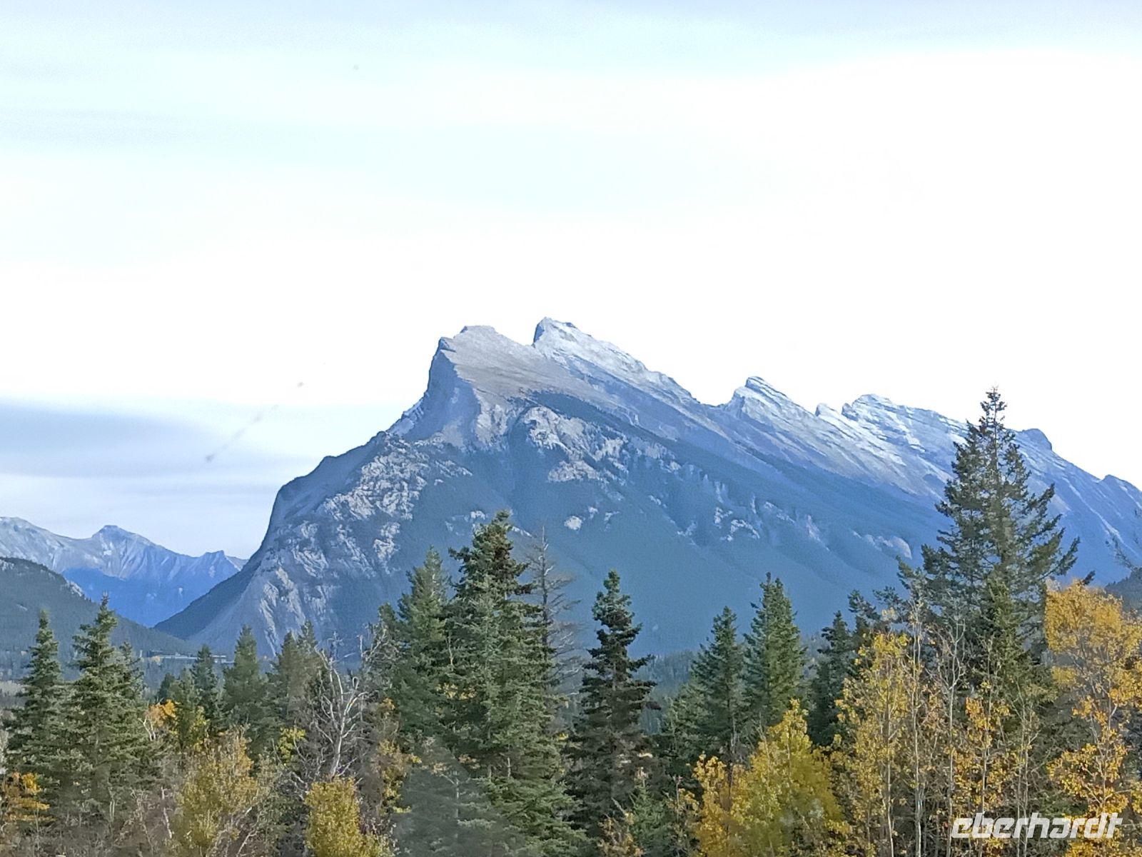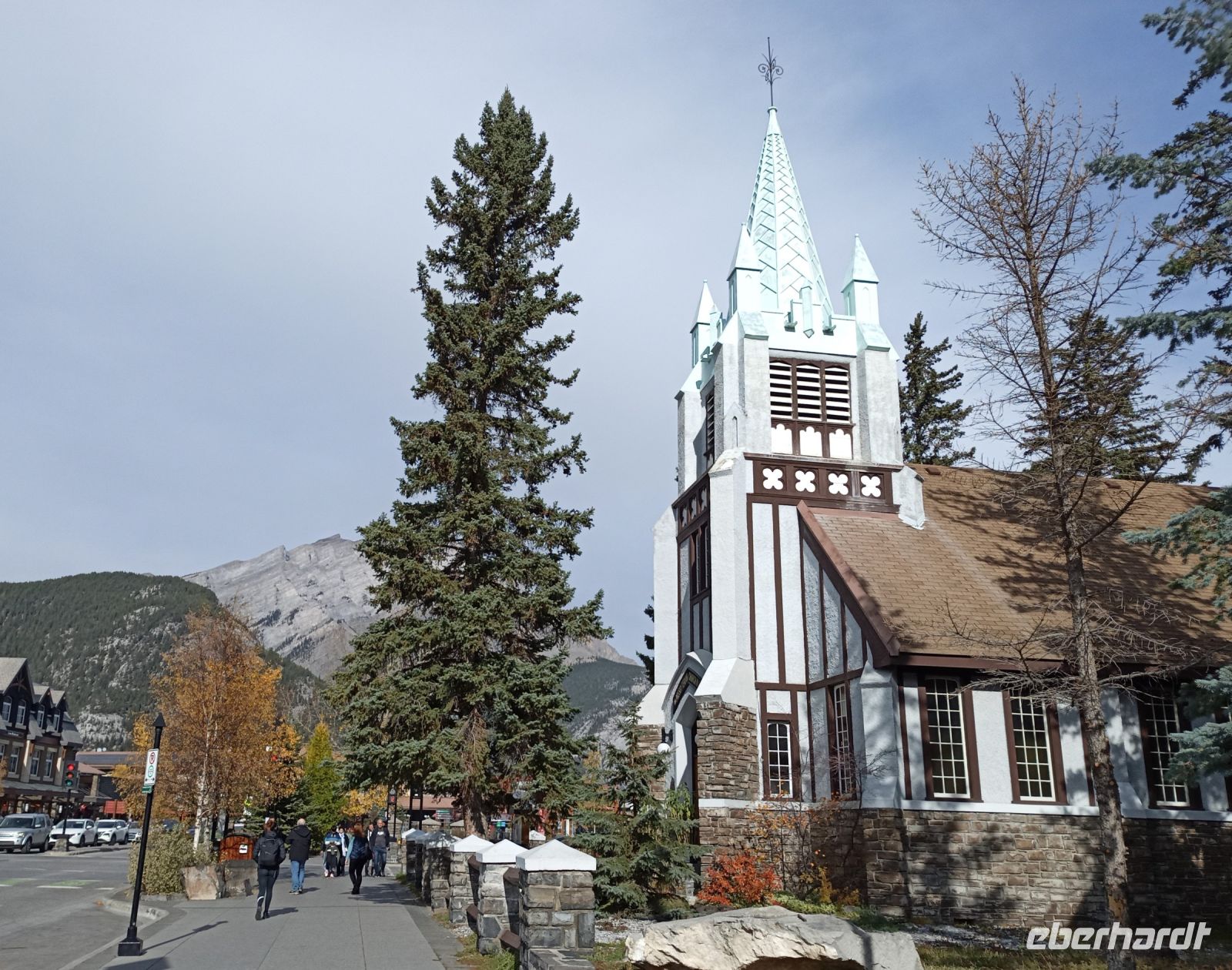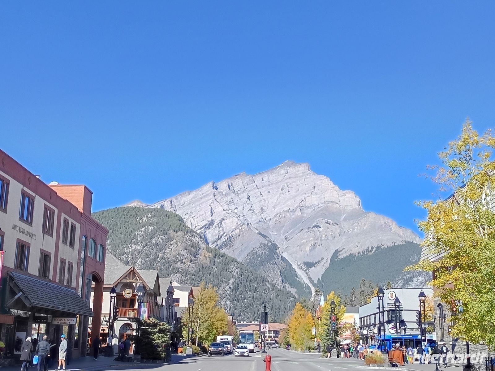 Wir fahren jetzt zurück nach Banff und erkunden das malerische Städtchen im Herzen des Nationalparks. Wir steigen am Parkplatz aus und schon begrüßt uns der imposante (schiefe) Berg Mount Rundle (2.949 m), der die Kulisse der Stadt dominiert. Die Atmosphäre in der Stadt ist entspannt, die Straßen von Cafés, Restaurants und Boutiquen gesäumt. Wir suchen erst ein geeignetes Restaurant oder Café für unsere individuelle Mittagspause und zerstreuen uns in dem gemütlichen Städtchen.