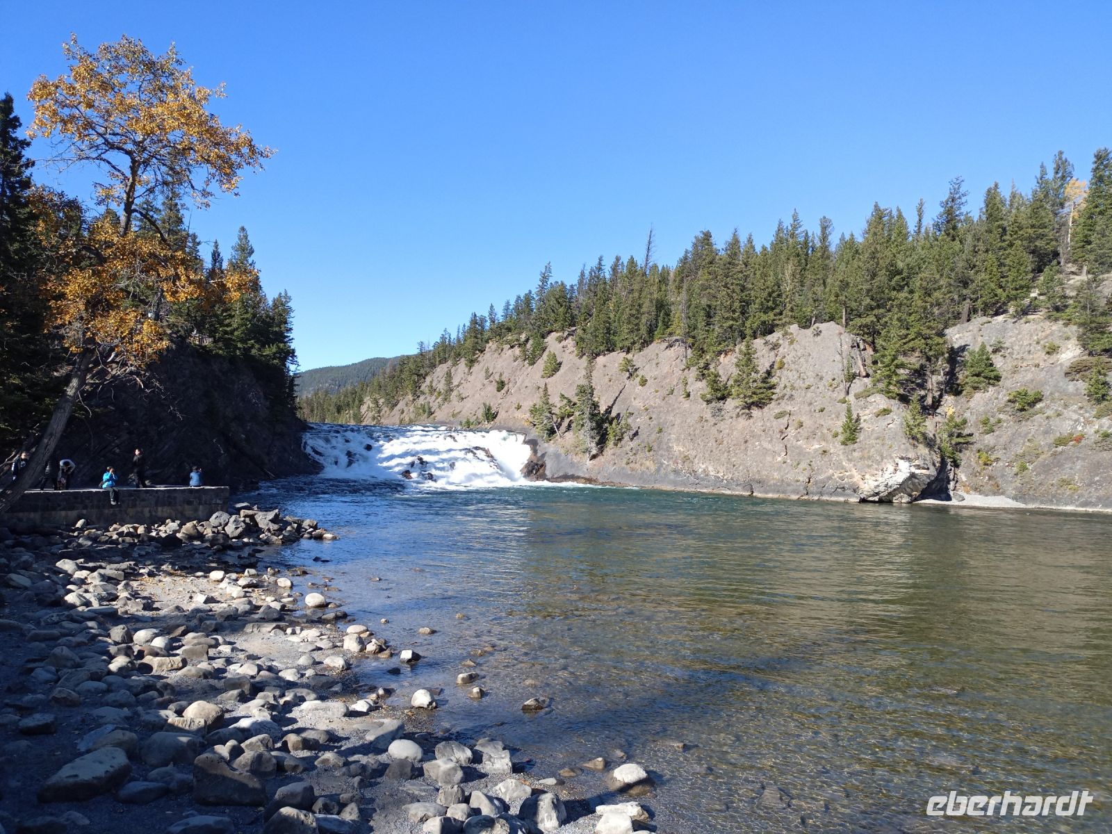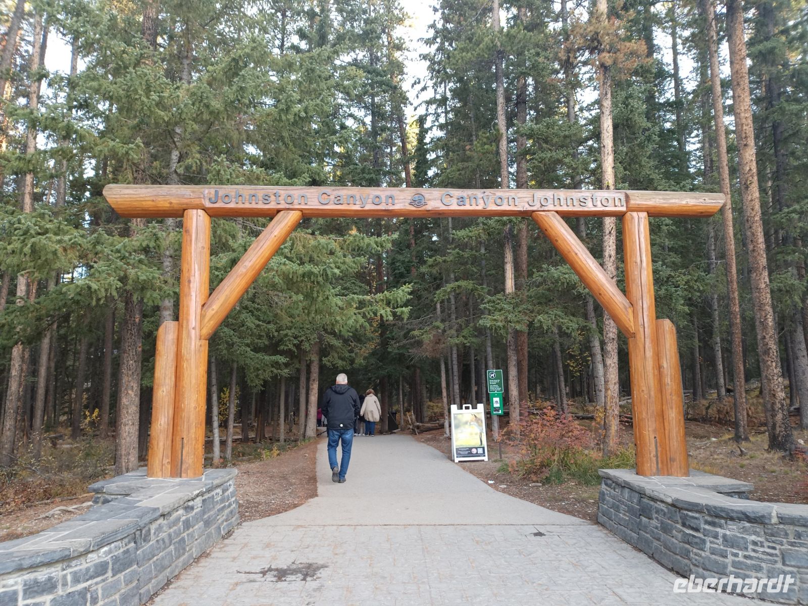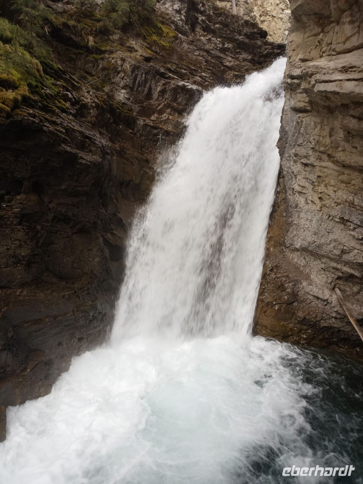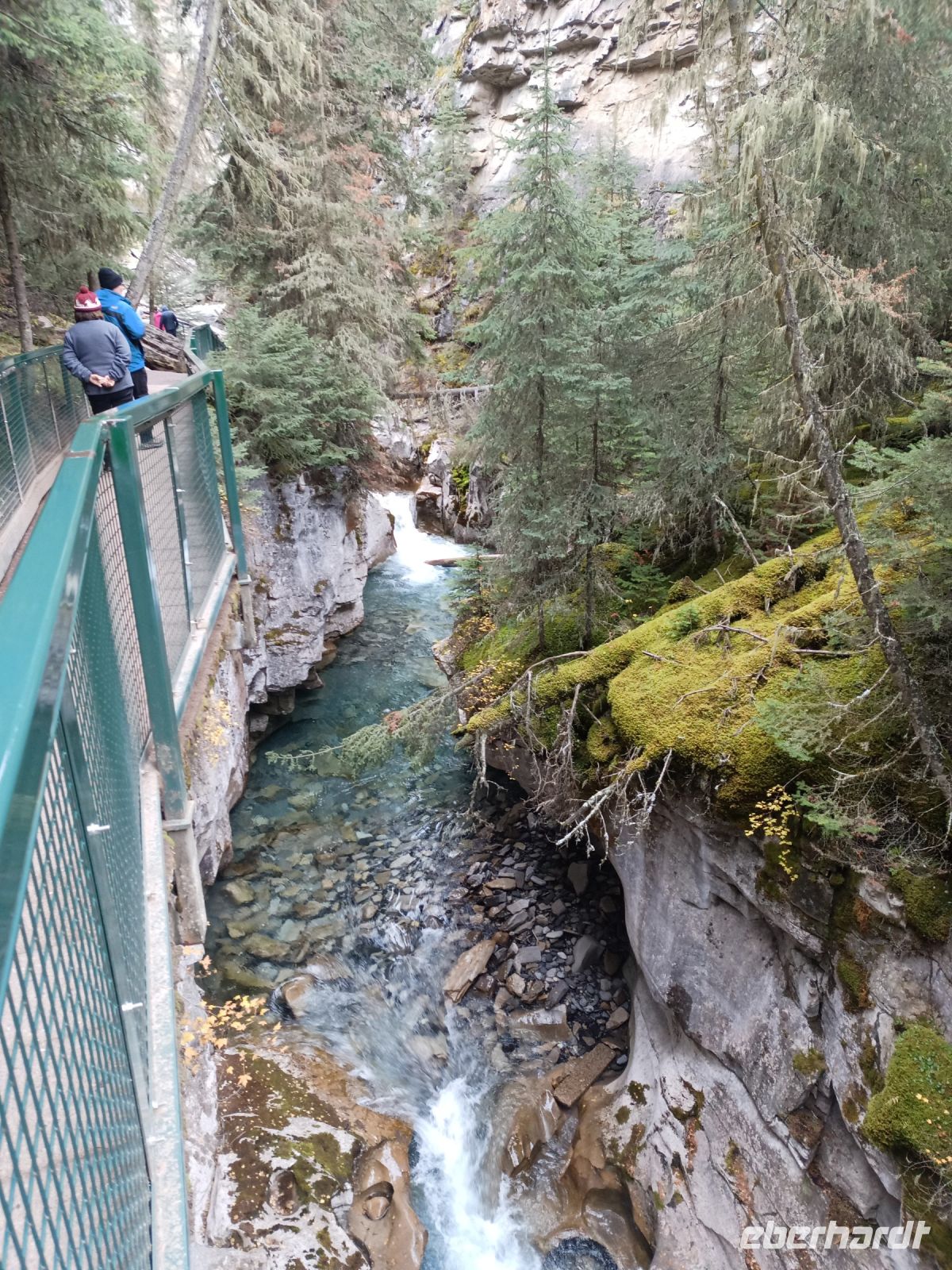 Unser erster Stopp ist nach einer kurzen Fahrt am Johnson Canyon. Die kühle frische Luft macht uns gleich fit für den Spaziergang durch eine enge Schlucht mit sprudelnden Wasserläufen, tief und schief wachsenden Bäumen und schroffen Felsen. Wir schreiten auf gut ausgebauten Stegen, die teilweise im Felsen verankert sind, und Holztreppen, die uns letztendlich zu einem rauschenden Wasserfall bringen. Der Wasserfallstrom ist sehr kraftvoll und mündet in einem türkis blauen kleinen See, von dem er weiter ins Tal fließt. Ein erfrischender Start des Tages.