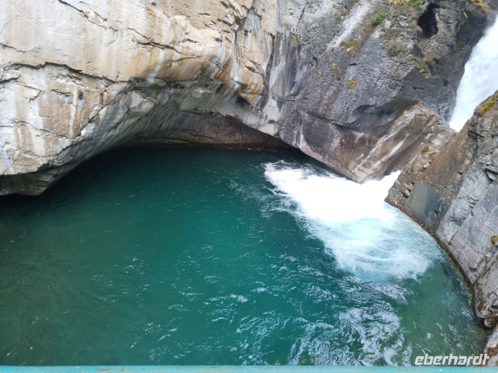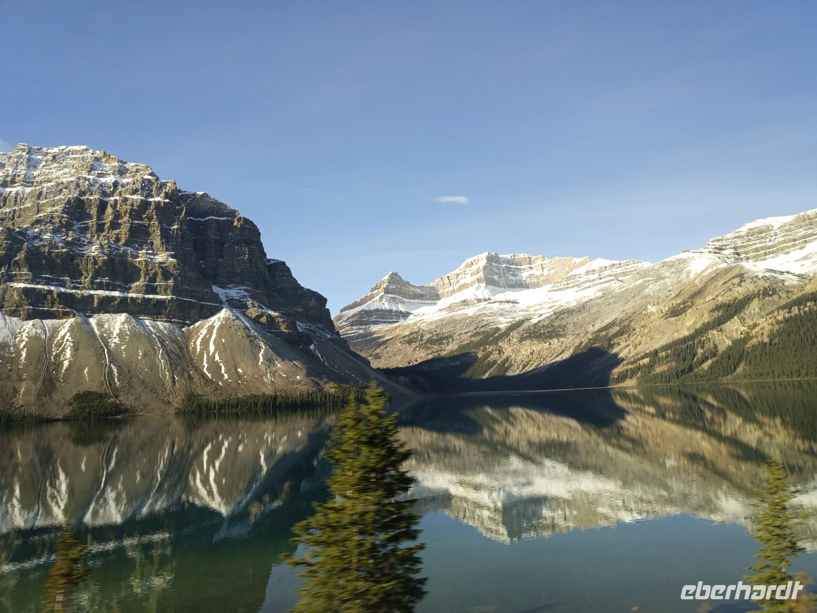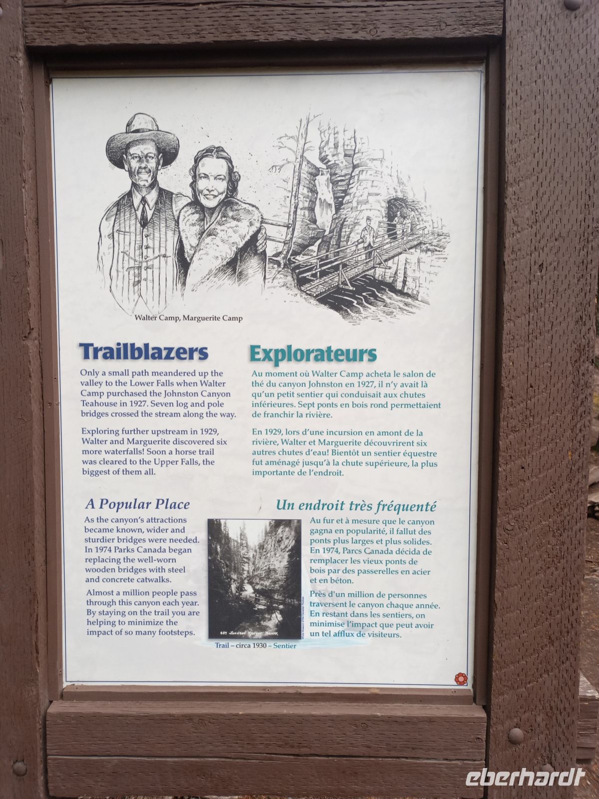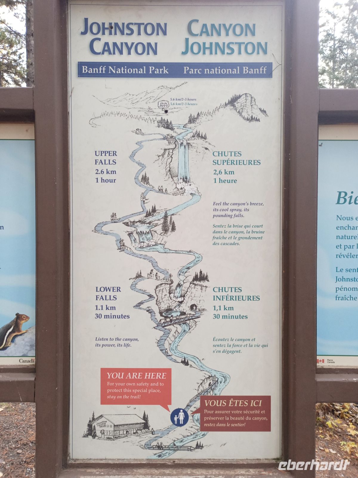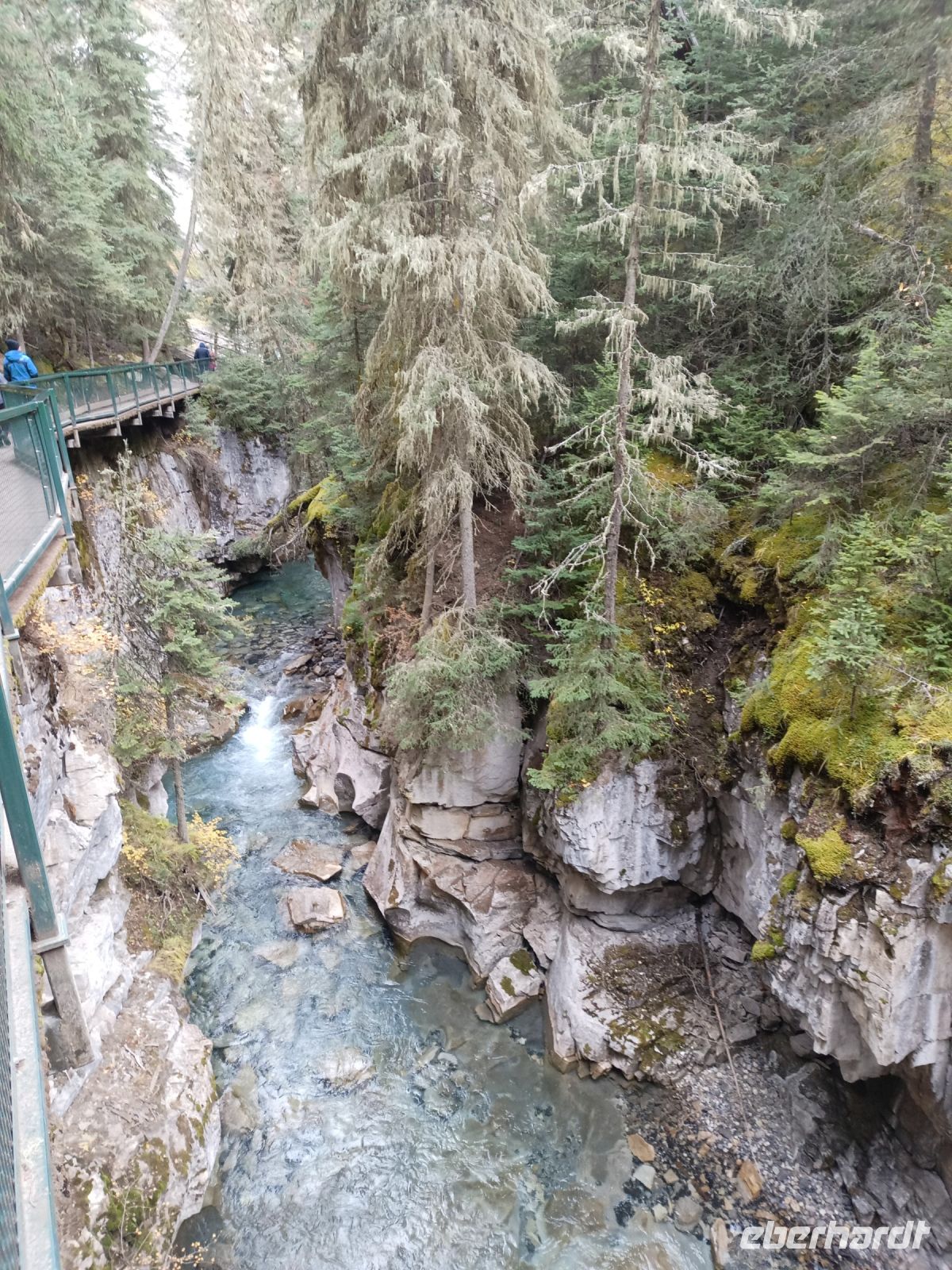 Unser erster Stopp ist nach einer kurzen Fahrt am Johnson Canyon. Die kühle frische Luft macht uns gleich fit für den Spaziergang durch eine enge Schlucht mit sprudelnden Wasserläufen, tief und schief wachsenden Bäumen und schroffen Felsen. Wir schreiten auf gut ausgebauten Stegen, die teilweise im Felsen verankert sind, und Holztreppen, die uns letztendlich zu einem rauschenden Wasserfall bringen. Der Wasserfallstrom ist sehr kraftvoll und mündet in einem türkis blauen kleinen See, von dem er weiter ins Tal fließt. Ein erfrischender Start des Tages.