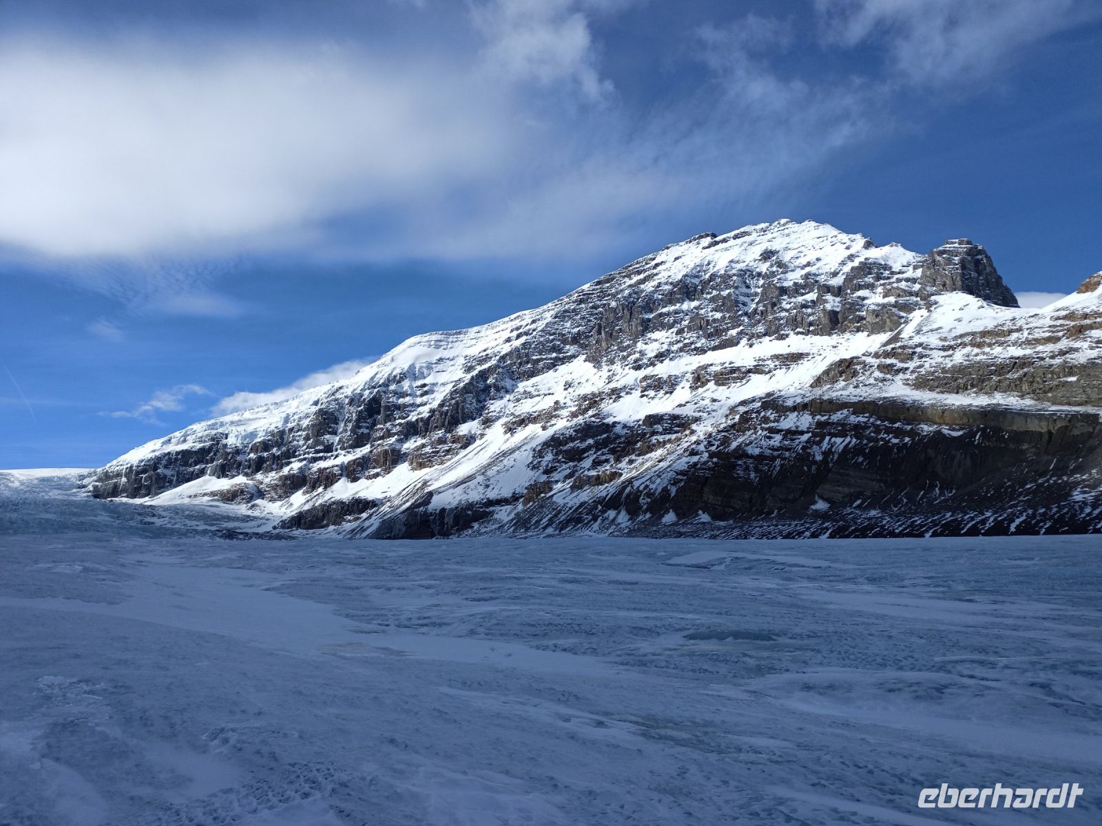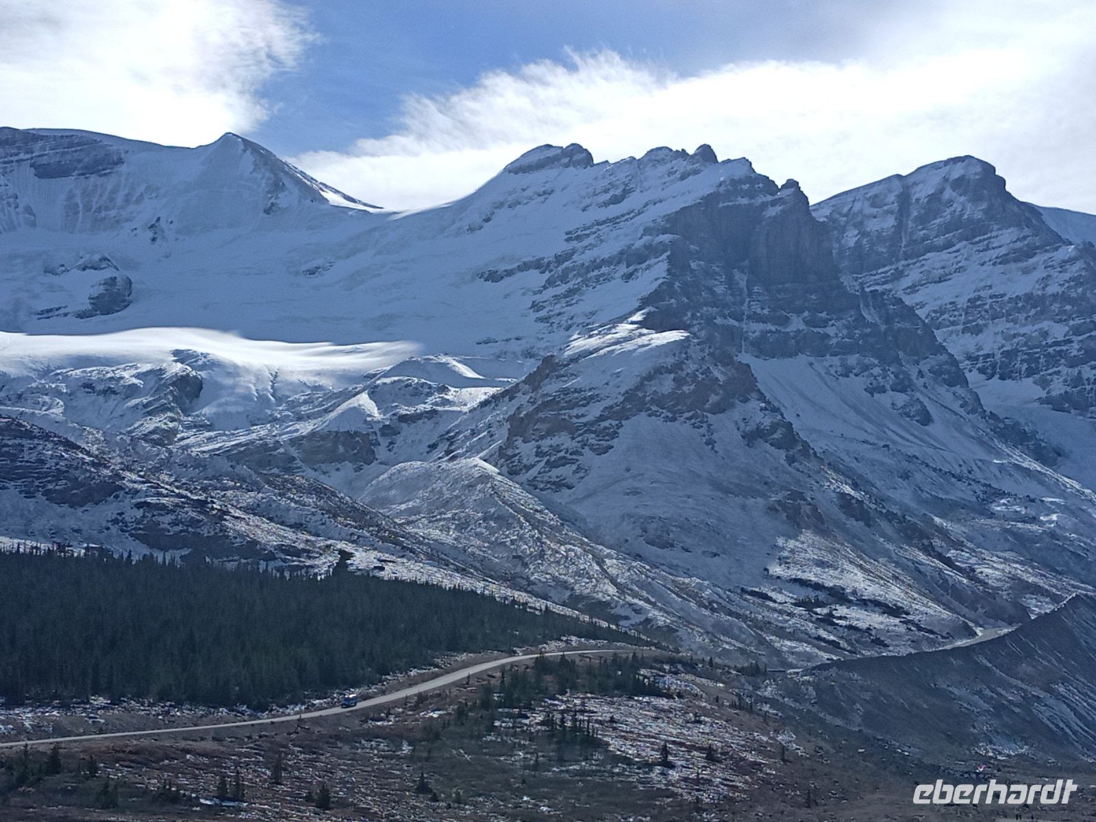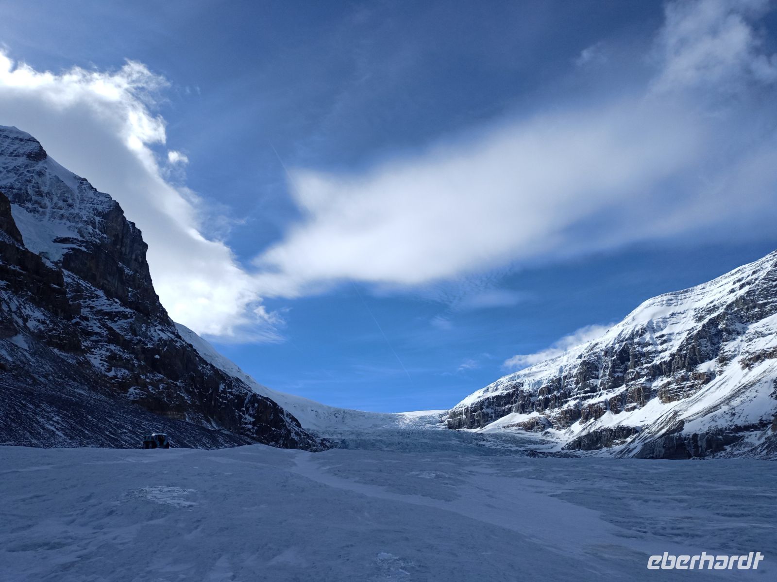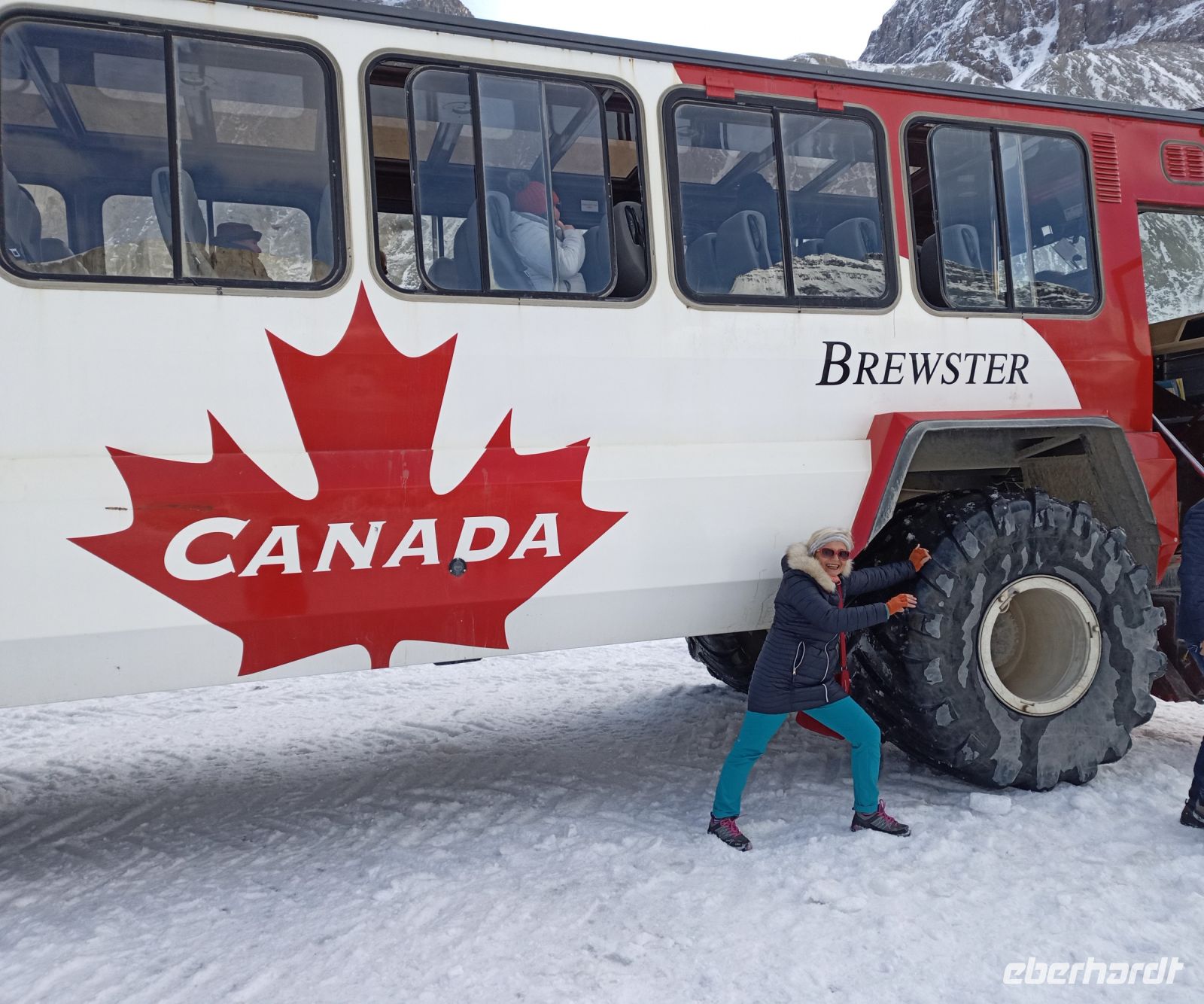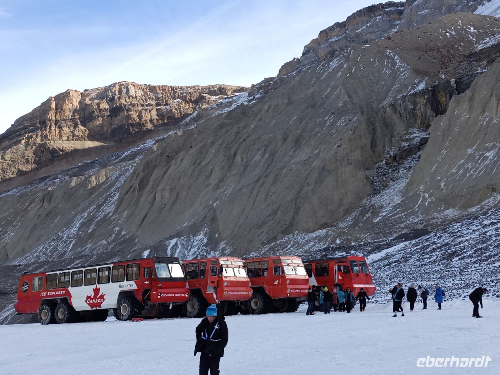 Kurz nach elf erreichten wir den Parkplatz am Columbia Icefield. Nach einer kurzen Pause wurden wir von einem Transferbus zum Einstieg des Ice Explorer gebracht. Die Fahrt mit diesem speziellen Fahrzeug auf den Athabasca-Gletscher ist schon sehr spektakulär. Die Fahrer der beiden Fahrzeuge erzählen uns einige Informationen über den Gletscher. Das Columbia Icefield ist eines der größten Eisfelder der Rocky Mountains, mit einer Fläche von etwa 325 Quadratkilometern und es speist mehrere große Gletscher, darunter den Athabasca-, Dome- und Stutfield-Gletscher.