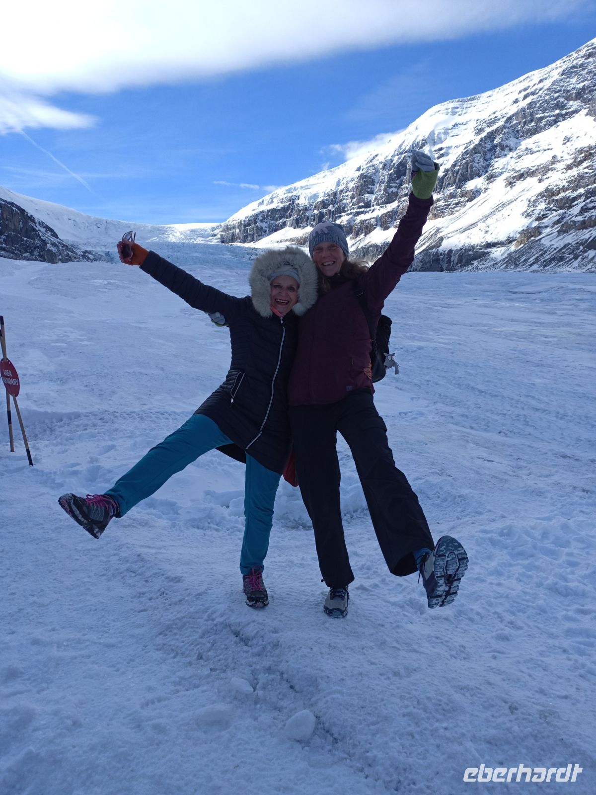 Wie wir erfahren, schrumpft der Athabasca-Gletscher derzeit um etwa 5 Meter pro Jahr und zeigt uns deutlich die Auswirkungen des Klimawandels auf Gletscherregionen. Wir bewundern die Berge und bewegen uns vorsichtig auf der Eischicht und machen tolle Fotos, um dem Moment für alle zu verewigen. An der Talstation hatten wir etwas Zeit, um die Sonne zu genießen oder uns mit einem Snack oder Getränk zu stärken.