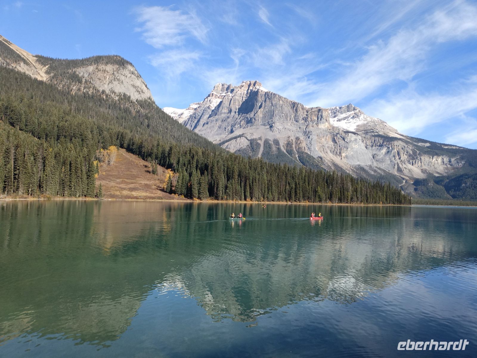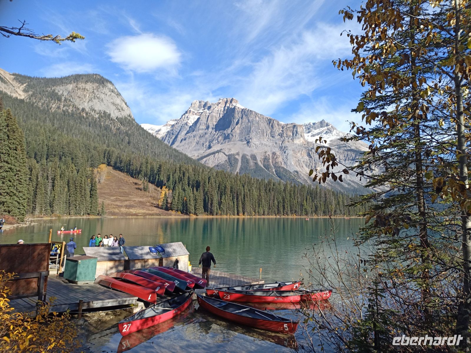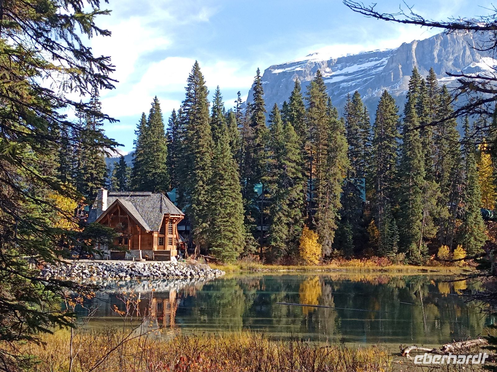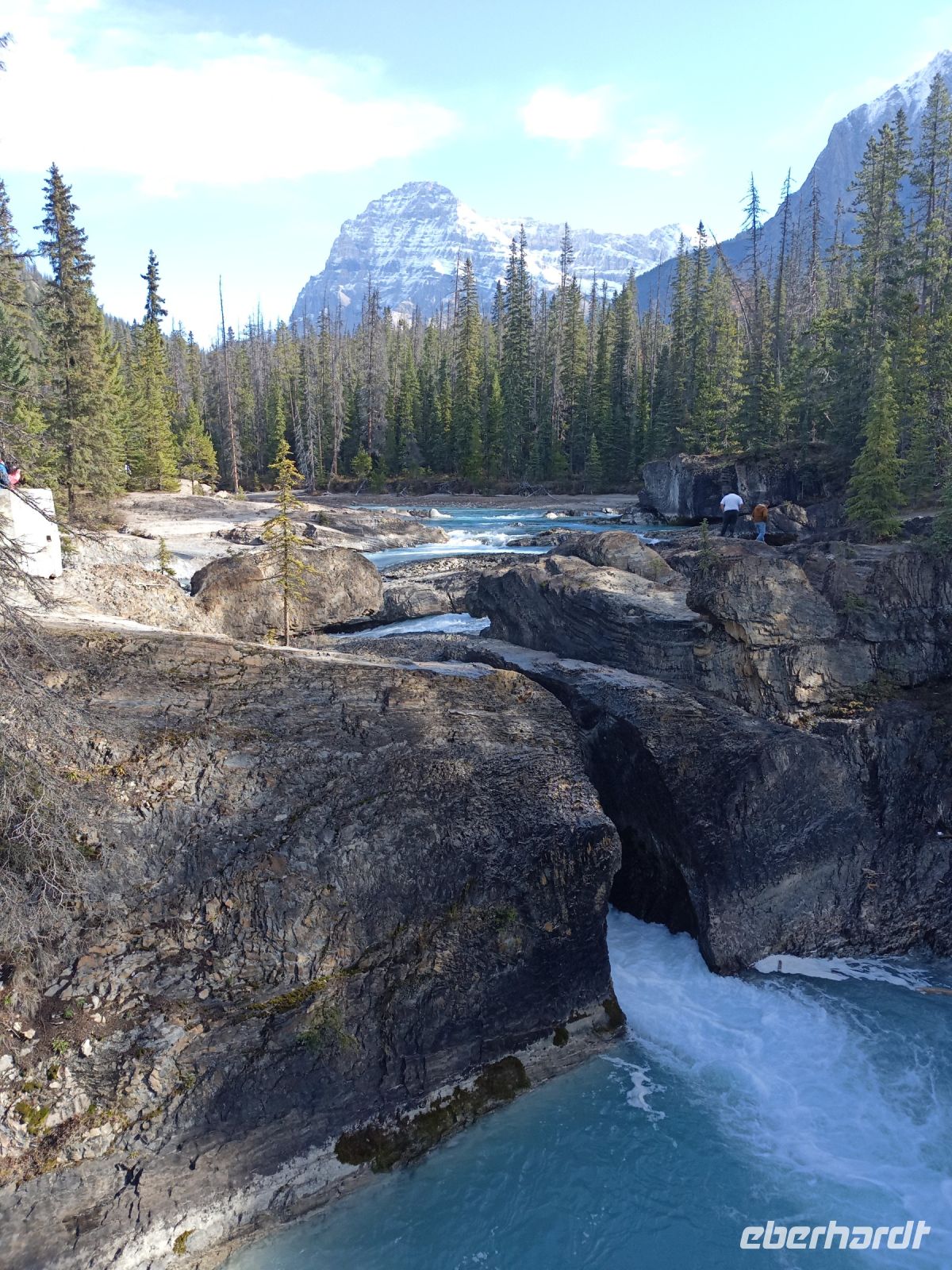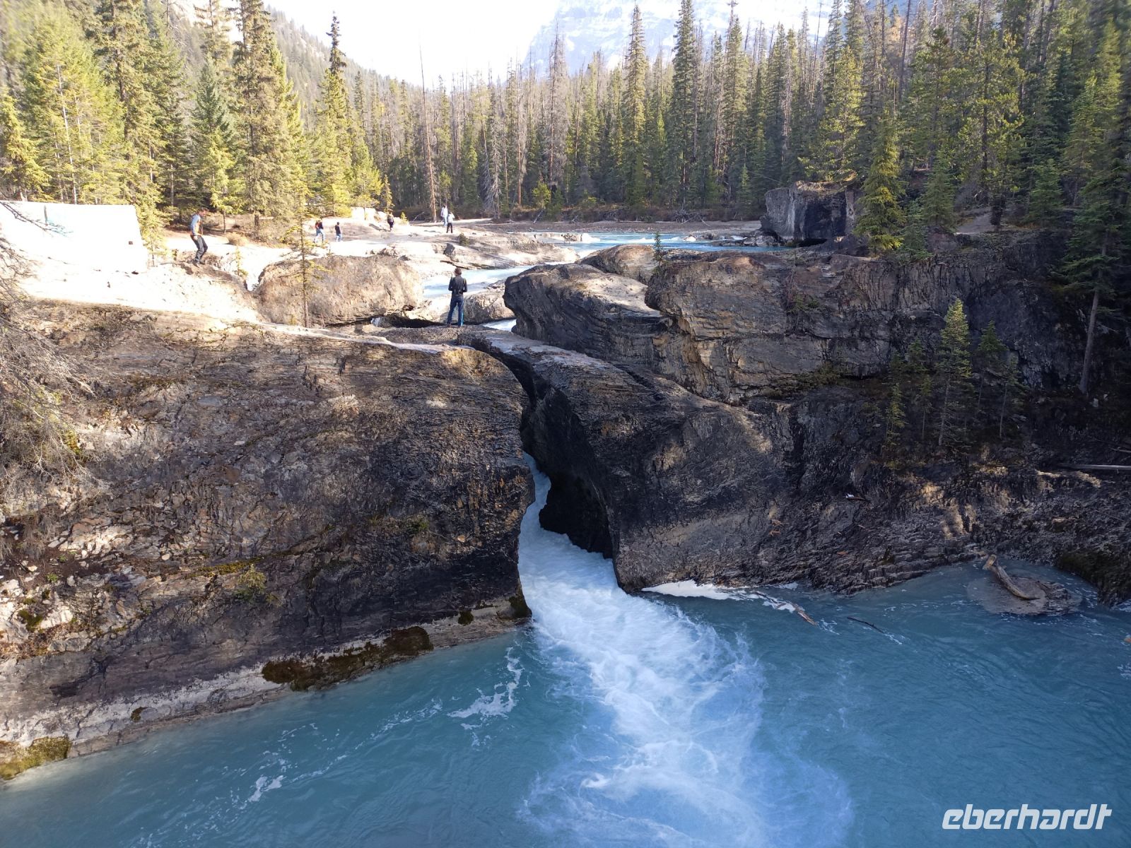 Bald biegen wir von dem Highway rechts ab und landen wieder in einem Naturparadies – am Emerald Lake - umrandet von Bergen spiegelt sich ein türkisgrüner See. Zwischen See und dem Fluss ist eine Brücke, über die man die Emerald Lake Lodge und weitere Touristen-Unterkünfte erreichen kann. Am Ufer ist eine Anlegestelle mit roten Kanubooten zum Ausleihen. Eine friedliche, entspannte Atmosphäre – man könnte sich gut vorstellen, einige Tage hier zu verweilen. Wir machen noch einen kleinen Spaziergang und fotografieren die Idylle. Nur wenige Minuten vom Emerald Lake entfernt sehen wir uns noch die Natural Bridge an. Eine faszinierende Felsformation,