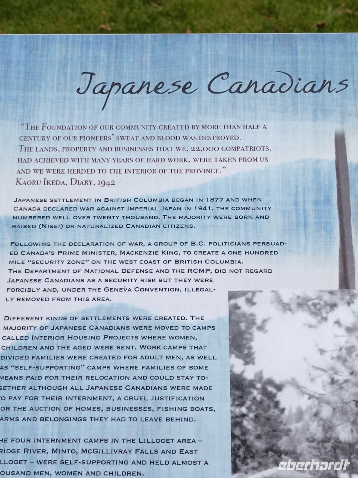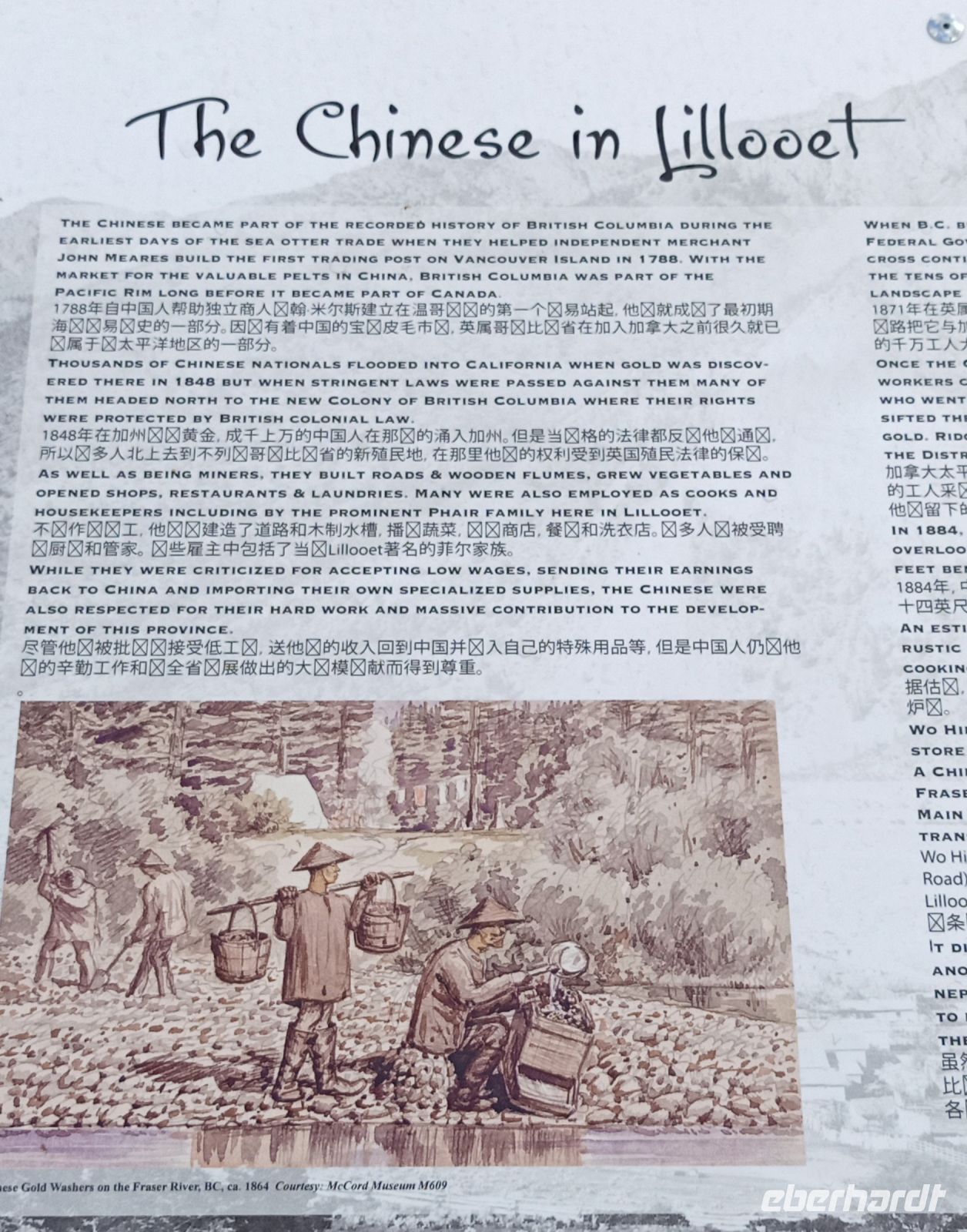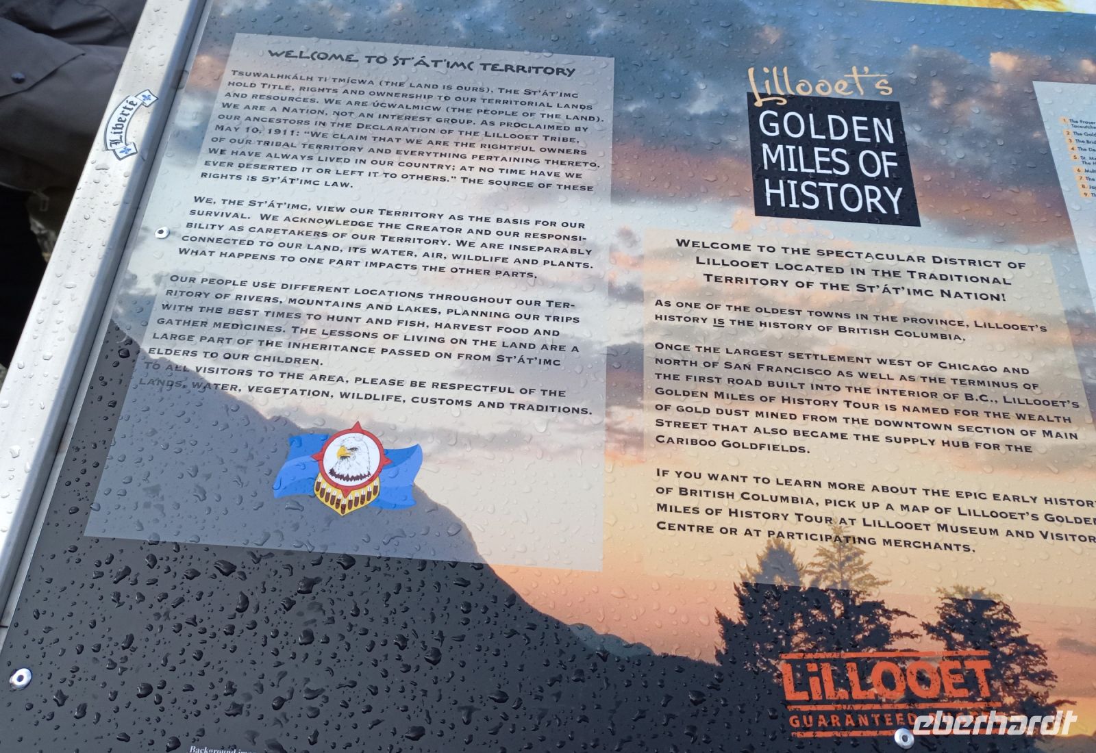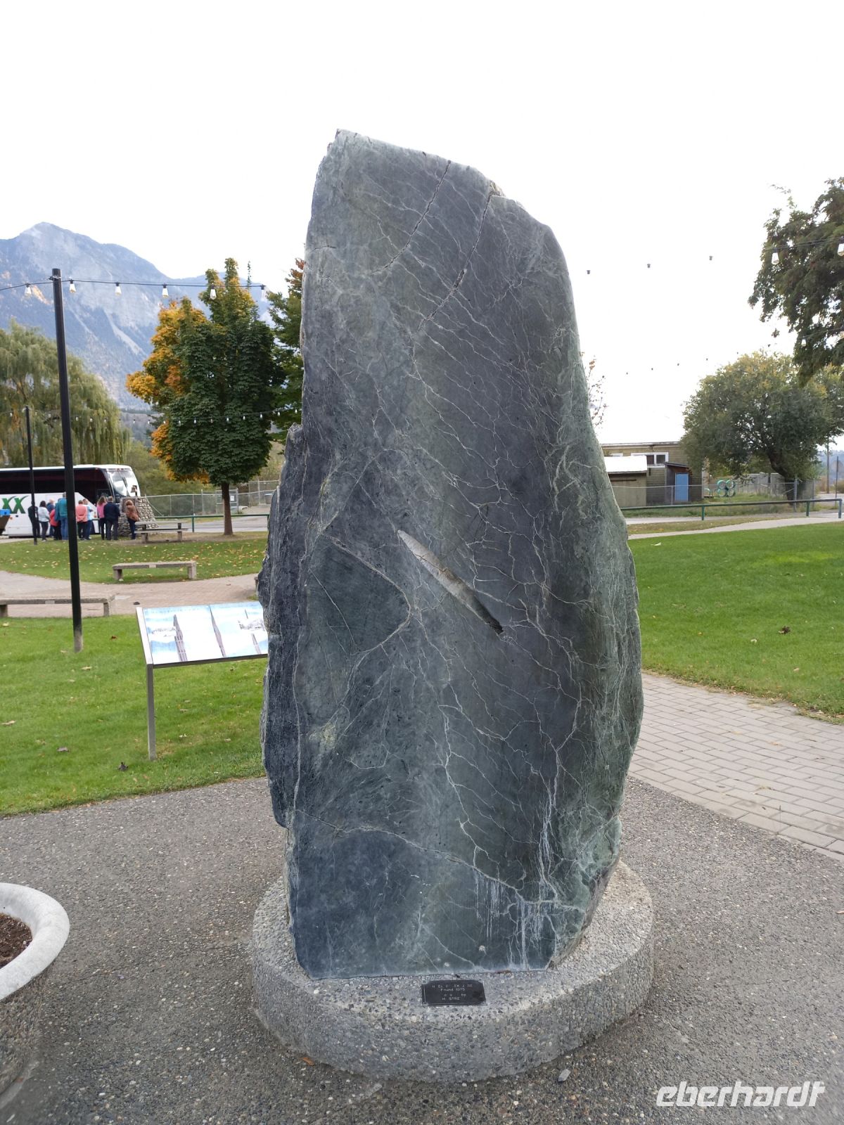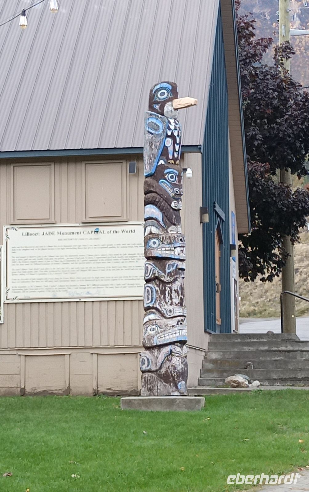 Wir erreichen Lillooet - hier machen wir einen kleinen Stopp an dem Denkmal „Train Wreck“ der an die Entgleisung des Güterzugs Mitte der 1950er-Jahre erinnert. In der Nähe sind im Kreis drei riesengroße Jade Steine Installiert. In und um Lillooet gibt es zahlreiche Fundstellen und Vorkommen von Jade und zwar einem ganz besonders großen Nephrit-Jade. Die indigenen Völker der Region nutzten Jade für die Herstellung von Werkzeugen wie Messern und Beilen. British Columbia, vor allem Umgebung von Lillooet, ist einer der weltweit größten Produzenten von Nephrit-Jade. Ein Großteil der abgebauten Jade wird nach Asien exportiert, wo sie besonders geschätzt wird.
