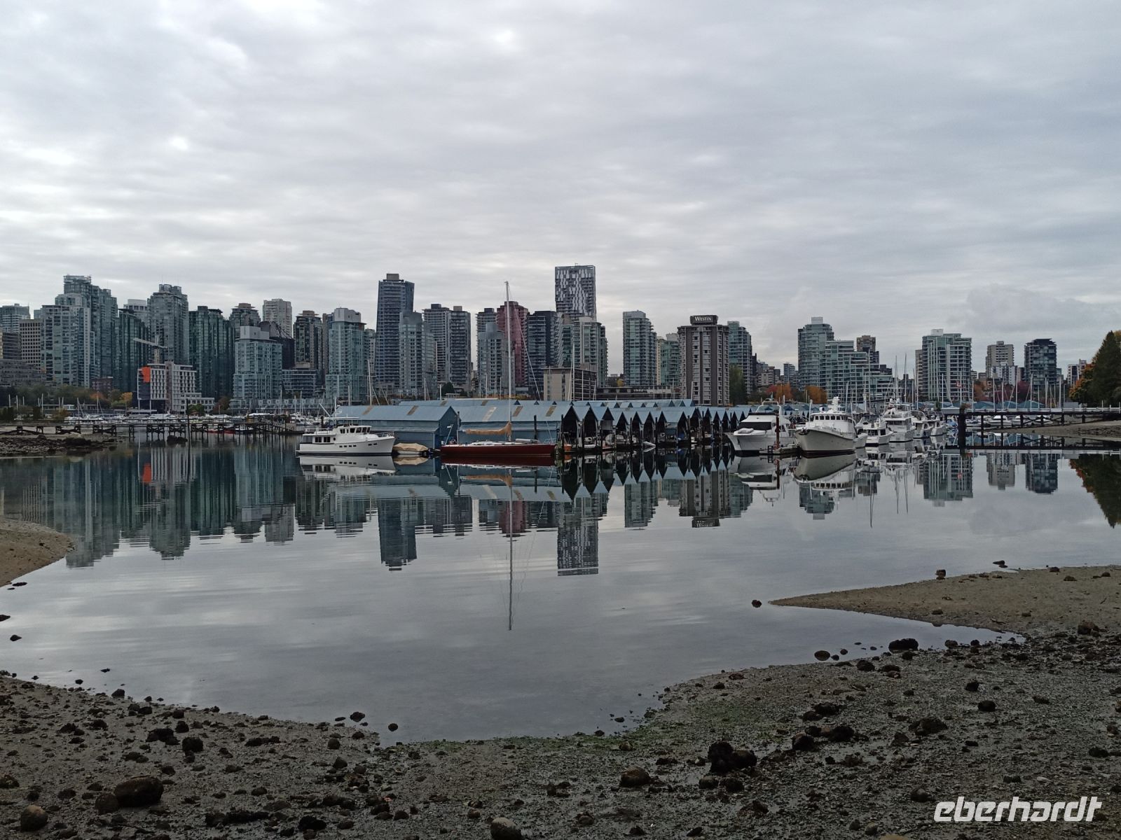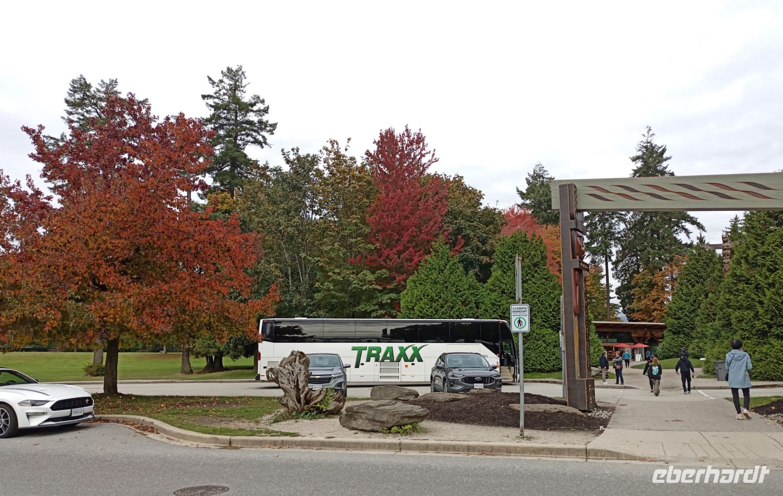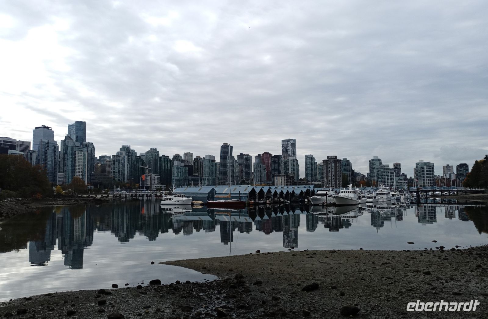 Gegen Mittag erreichen wir Vancouver und fahren zunächst in den Stanley Park. Der Stanley Park ist mit einer Fläche von 405 Hektar einer der größten Stadtparks Nordamerikas mit Wanderwegen, dem berühmten Seawall und dem Vancouver Aquarium. Wir parken unweit von Wiesen, wo die Totempfähle der Ureinwohner-Stämme installiert sind. Es ist etwas bewölkt, dennoch können wir bei einem Spaziergang am Ufer – Seawall, die Silhouette – die Skylines von Vancouver betrachten und davor den Vancouver Hafen. Zurück am Bus verabschieden und bedanken uns auch unserem Fahrer Parviz, der uns die ganze Woche von Calgary über die Rockies bis Vancouver sicher gefahren hat. Er bleibt uns aber noch bis heute Abend erhalten.