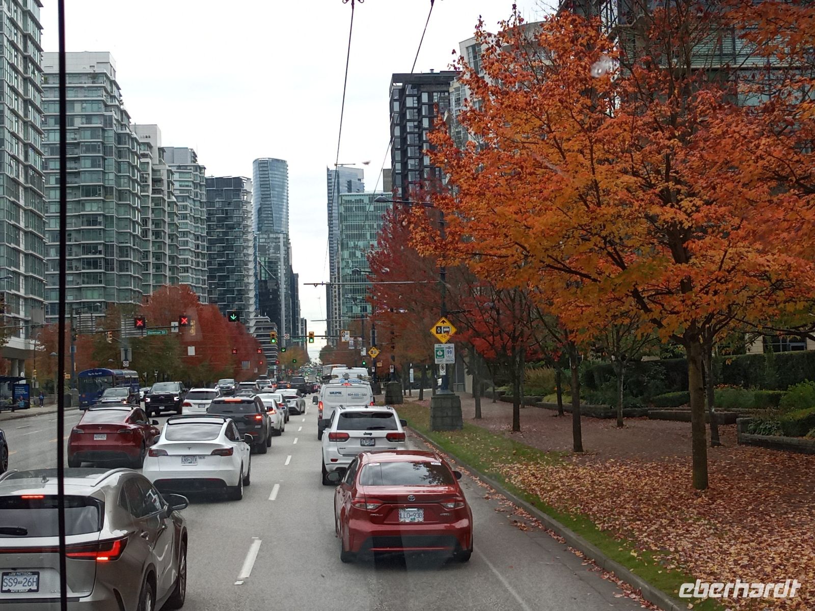 Nun geht es aber in die Stadt. Hochhäuser mit Glasfassaden und dazwischen im Vergleich kleine historische Gebäude mit Holzbalken, ähnlich unseren Fachwerkhäusern. Wir fahren im Vancouver durch China Town in die Stadt hinein. Ein paar Informationen zu Vancouver: Vancouver Stadt zählt etwa 662 Tausend Einwohner. In der Metropolregion leben insgesamt etwa 2,8 Millionen Menschen. Somit ist Vancouver die größte Stadt von British Columbia und von West Kanada und die drittgrößte von Kanada. Vancouver zählt wohl zu den schönsten und lebenswertesten Städten der Welt.