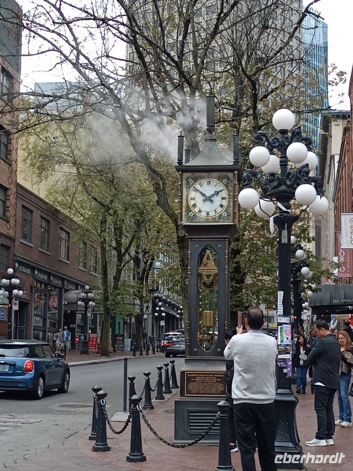Nun erkunden wir mit Marion zu Fuß ihre neue Heimatstadt. Nach einer kurzen Busfahrt steigen wir in der Nähe der Waterfront aus. Zunächst schlendern wir über die Straßen im Stadtteil Gastown und in der Waterstreet zeigt uns Marion die „Steam Clock“ (Eine Dampfuhr). Diese wurde 1977 von Uhrmacher Raymond Saunders gebaut und wird tatsächlich vom Dampf, den unterirdischen Heizungsleitungen betrieben. Nicht weit ist ein typischer Hockey Fanladen, ganz im rot.