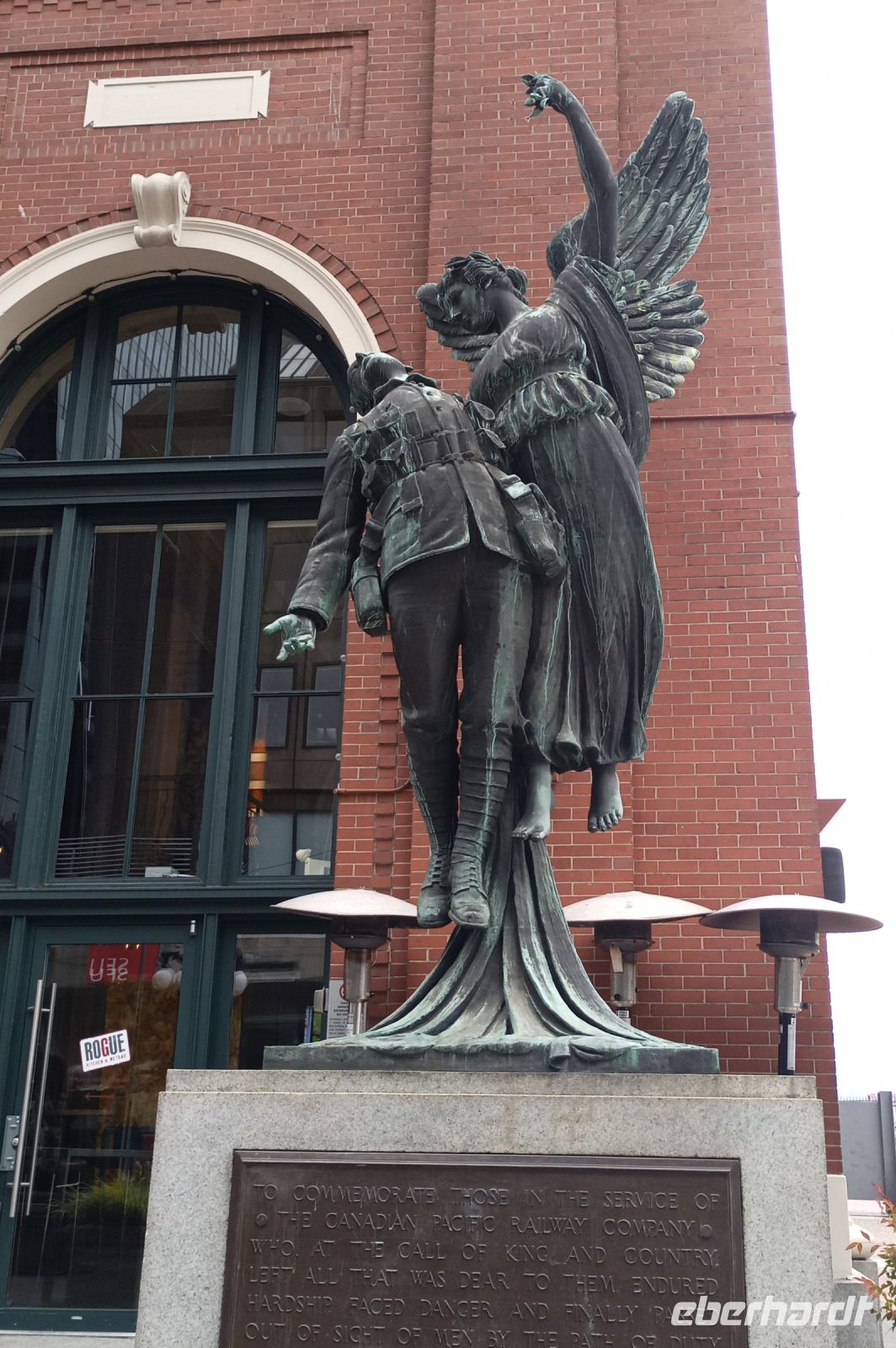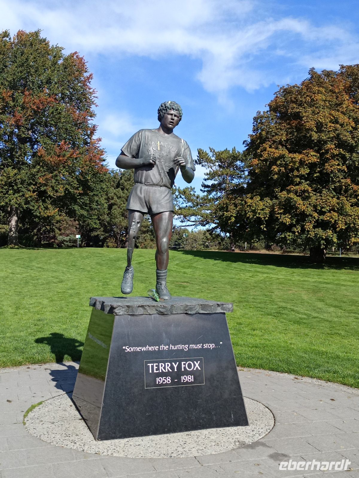 Direkt daneben befindet sich die Statue von Terry Fox. Terry Fox war ein junger sehr ambitionierter junger Sportler. Aufgrund seiner Krebserkrankung wurde ihm mit 18 ein Bein amputiert. Motiviert von Schicksalen vieler Kinder mit Krebsdiagnose, die er im Krankenhaus erlebt hat, begann er nach der der Amputation mit Hilfe einer Prothese wieder zu laufen. 1981 wurde der Terry Fox Run - ins Leben gerufen, ein jährliches, nicht wettbewerbsorientiertes Event, bei dem weltweit Geld für die Krebsforschung gesammelt wird. Terry Fox starb leider mit 22 Jahren. Er symbolisiert Mut, Entschlossenheit und Mitgefühl. Seine Worte, die er während seines Laufes sprach, bleiben unvergessen: "I want to try the impossible, to show it can be done." Und sind bis heute Vorbild für Hoffnung und Durchhaltevermögen.