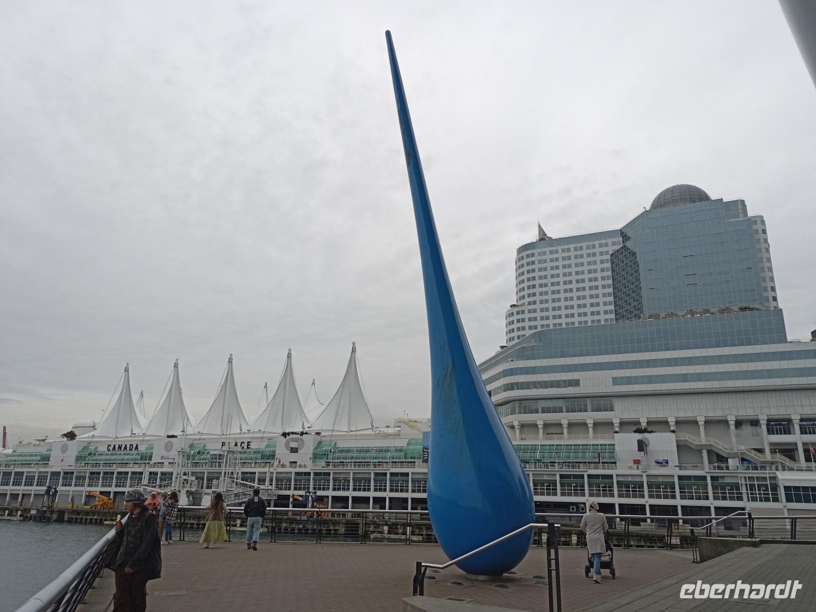 Auf der Terrasse ist auch eine Statue – ein großer blauer Wassertropfen, der das Element Wasser, mit dem Vancouver verbunden ist, symbolisieren soll. Canada Place wurde 1986 als Pavillon für die Weltausstellung Expo 86 gebaut. Heute dient es als Terminal für Kreuzfahrtschiffe, die nach Alaska fahren. Es ist auch ein Veranstaltungsort für Festivals, Konferenzen und öffentliche Events und Sitz des World Trade Centers Vancouver.