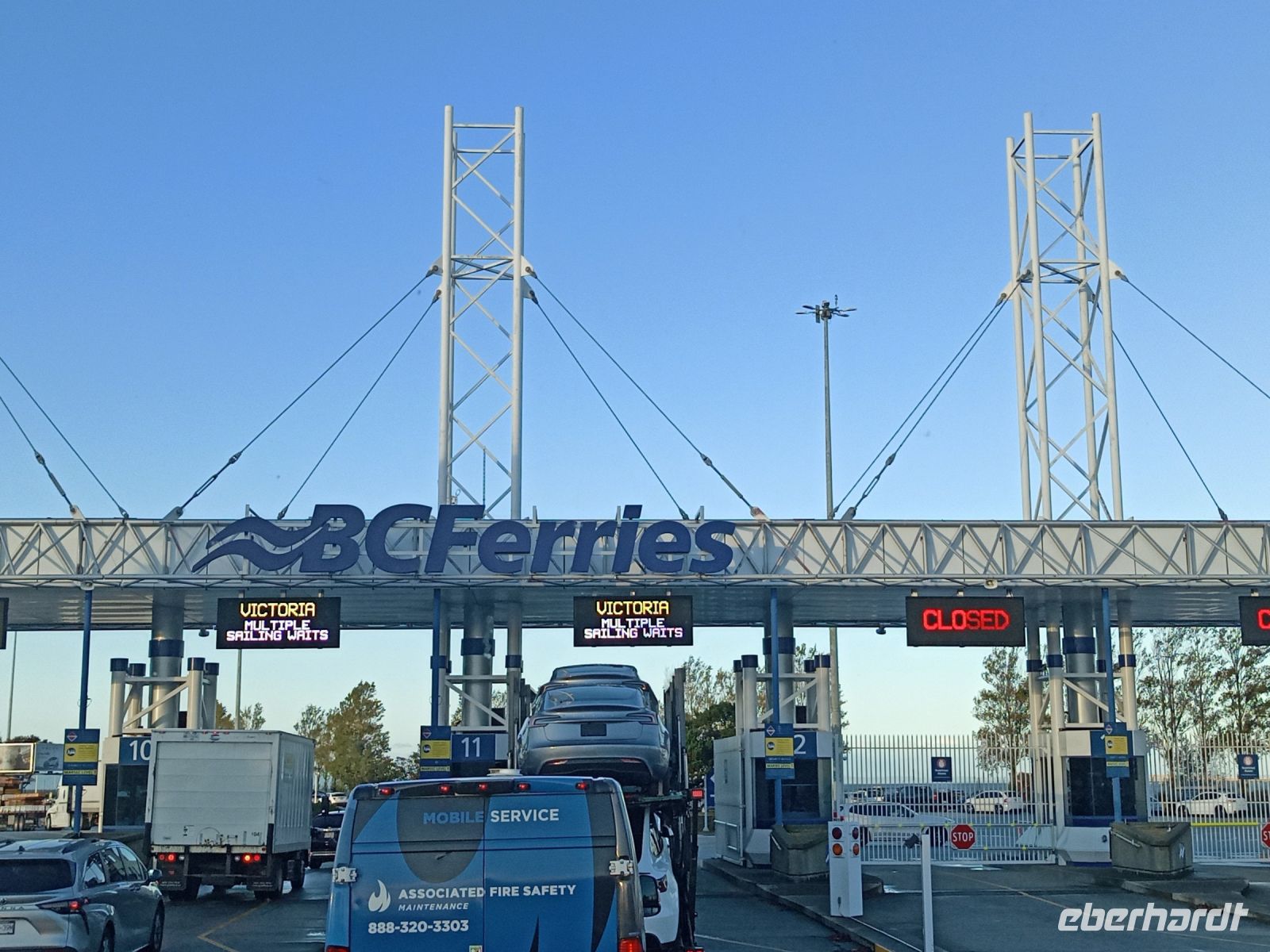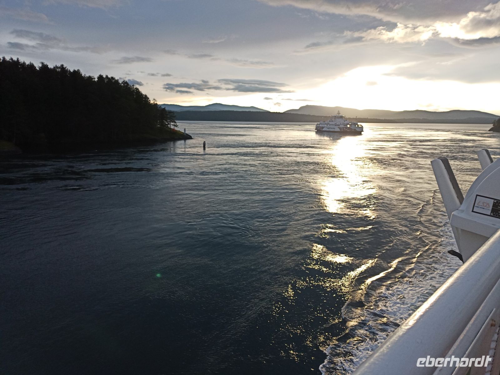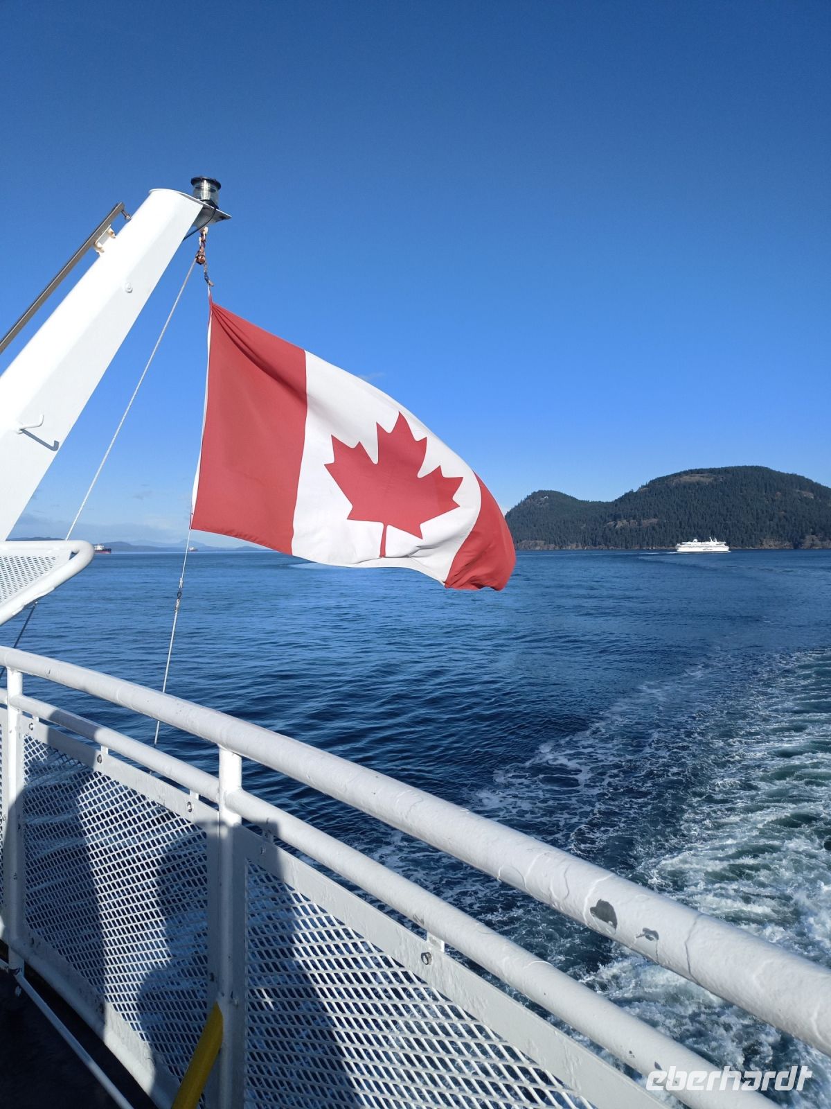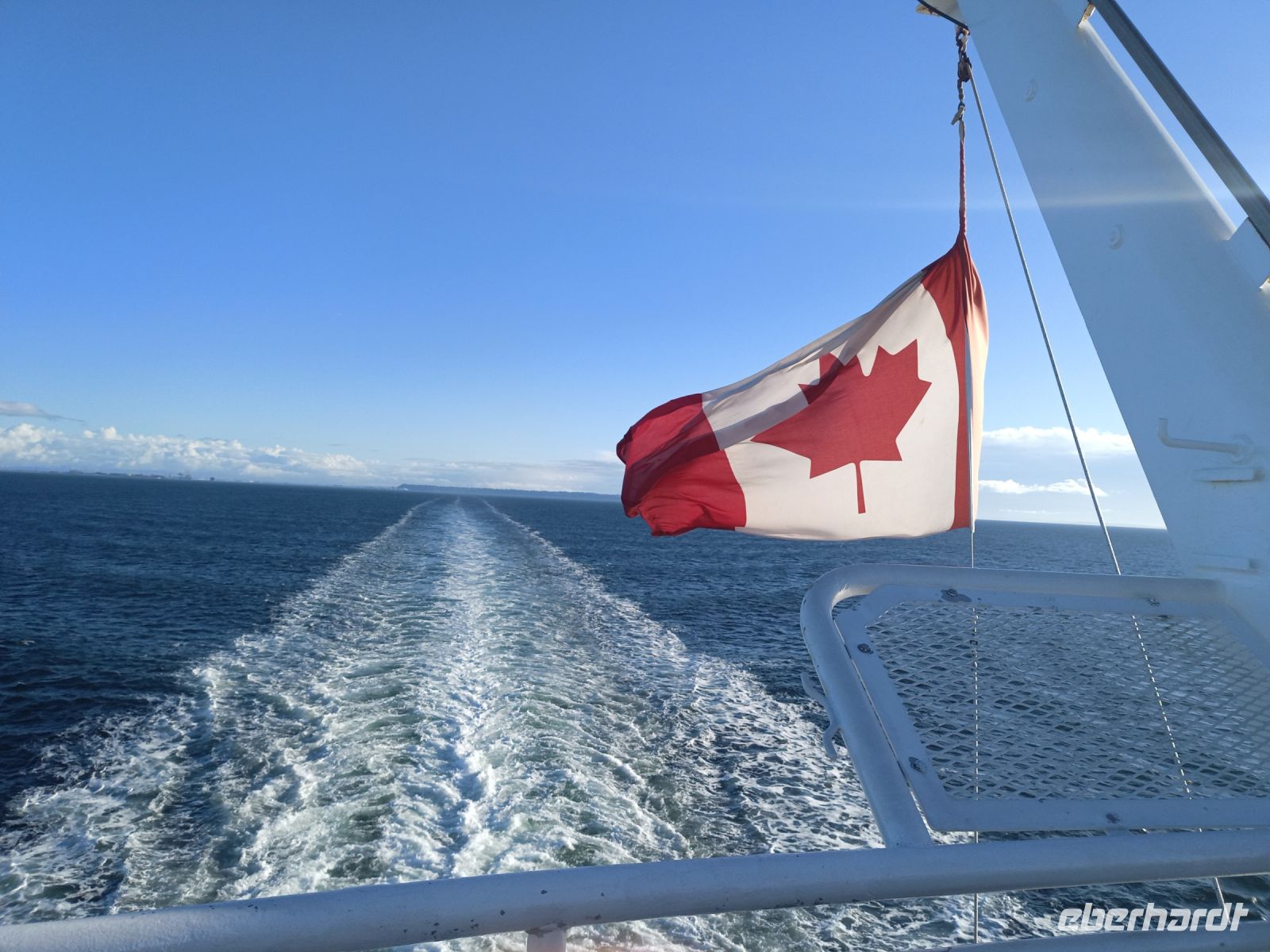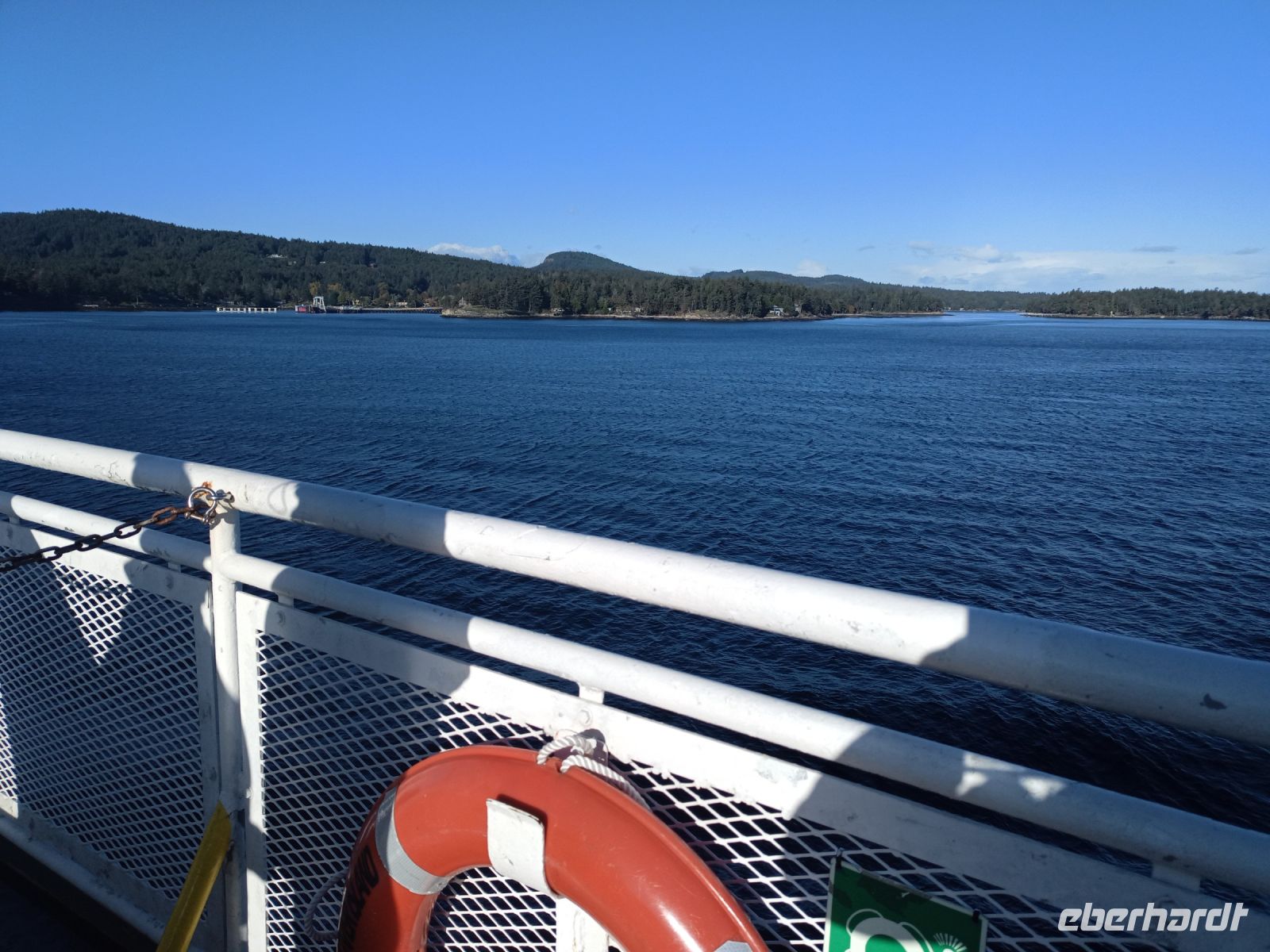 Die Überfahrt mit der BC Ferries ist ein besonderes Erlebnis. Vom Sonnendeck aus genießen wir atemberaubende Ausblicke auf die Küstenlandschaft von British Columbia. Die Gewässer von „Strait of Georgia“ glitzern in der Morgensonne, während vereinzelte Inseln an uns vorbeiziehen. Trotz der strahlenden Sonne ist es auf dem Deck windig, und etwas frisch.