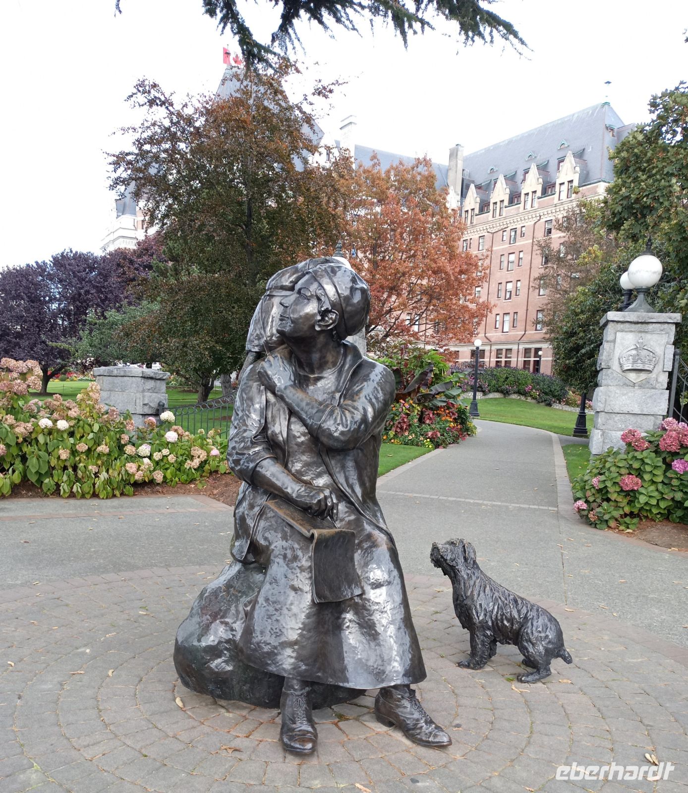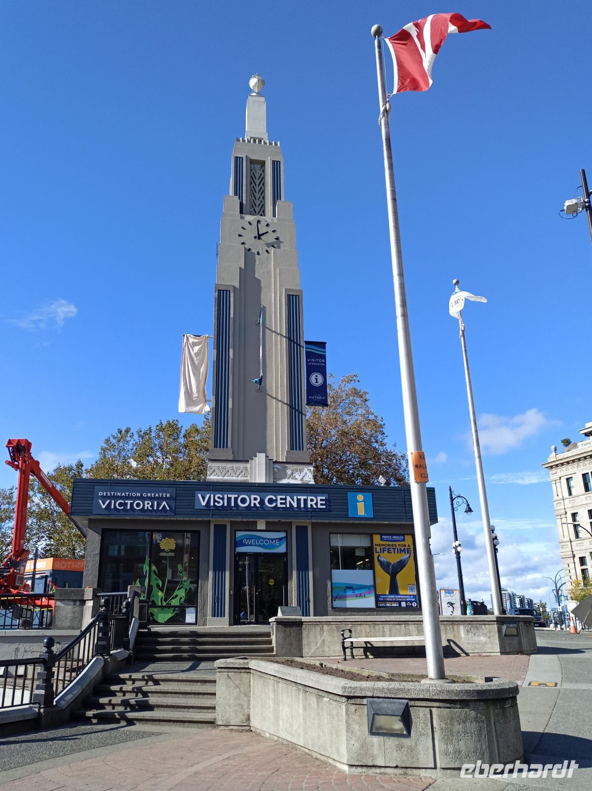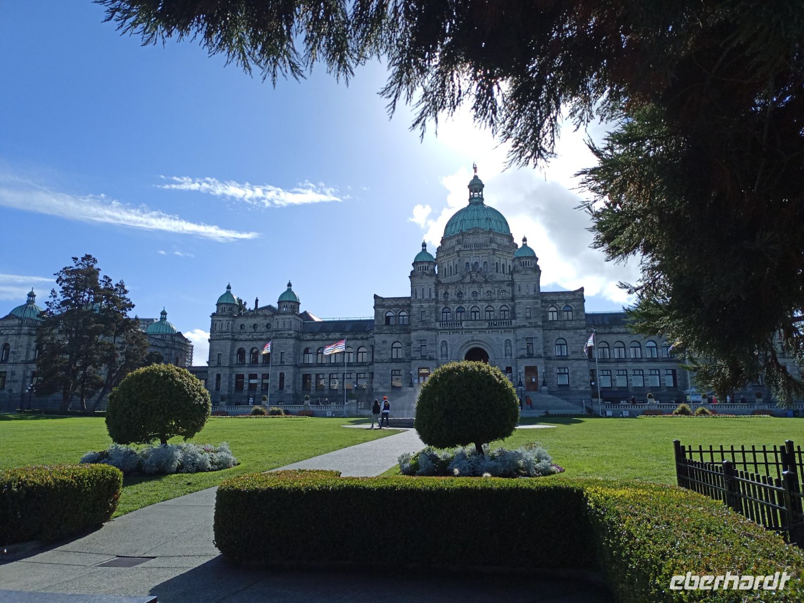 Nun fahren wir ins Herz von Viktoria, der Hauptstadt von British Columbia; die für seine britische Atmosphäre, historischen Gebäude und den Inneren Hafen bekannt ist. Victoria zeigt sich von ihrer besten Seite: die Sonne scheint, der Himmel und das Wasser sind tiefblau, und die Hauptstadt empfängt uns mit ihrem eleganten, Charme. Wir parken unweit von Parliament Gebäude, Marion gibt uns noch wertvolle Tipps und wir erkunden die Stadt, jeder nach eigenen Interessen. Zunächst gehen wir zu dem majestätischen Parliament House, dem Sitz der Provinz Regierung und versuchen gegen die Sonne doch schöne Fotos einzufangen. Das Parlamentsgebäude wurde nach einem Entwurf vom Architekten Francis Rattenbury im Stil der Neorenaissance und des Klassizismus erbaut und 1898 offiziell eröffnet. Auf der imposanten Kuppel ist die vergoldete Statue von Captain George Vancouver installiert. Captain George Vancouver war ein britischer Marineoffizier und Entdecker, der eine zentrale Rolle bei der Kartierung der Pazifikküste Nordamerikas, einschließlich der heutigen Region von Victoria, British Columbia, spielte. Sein Name ist eng mit der Stadt Vancouver und Vancouver Island verbunden.