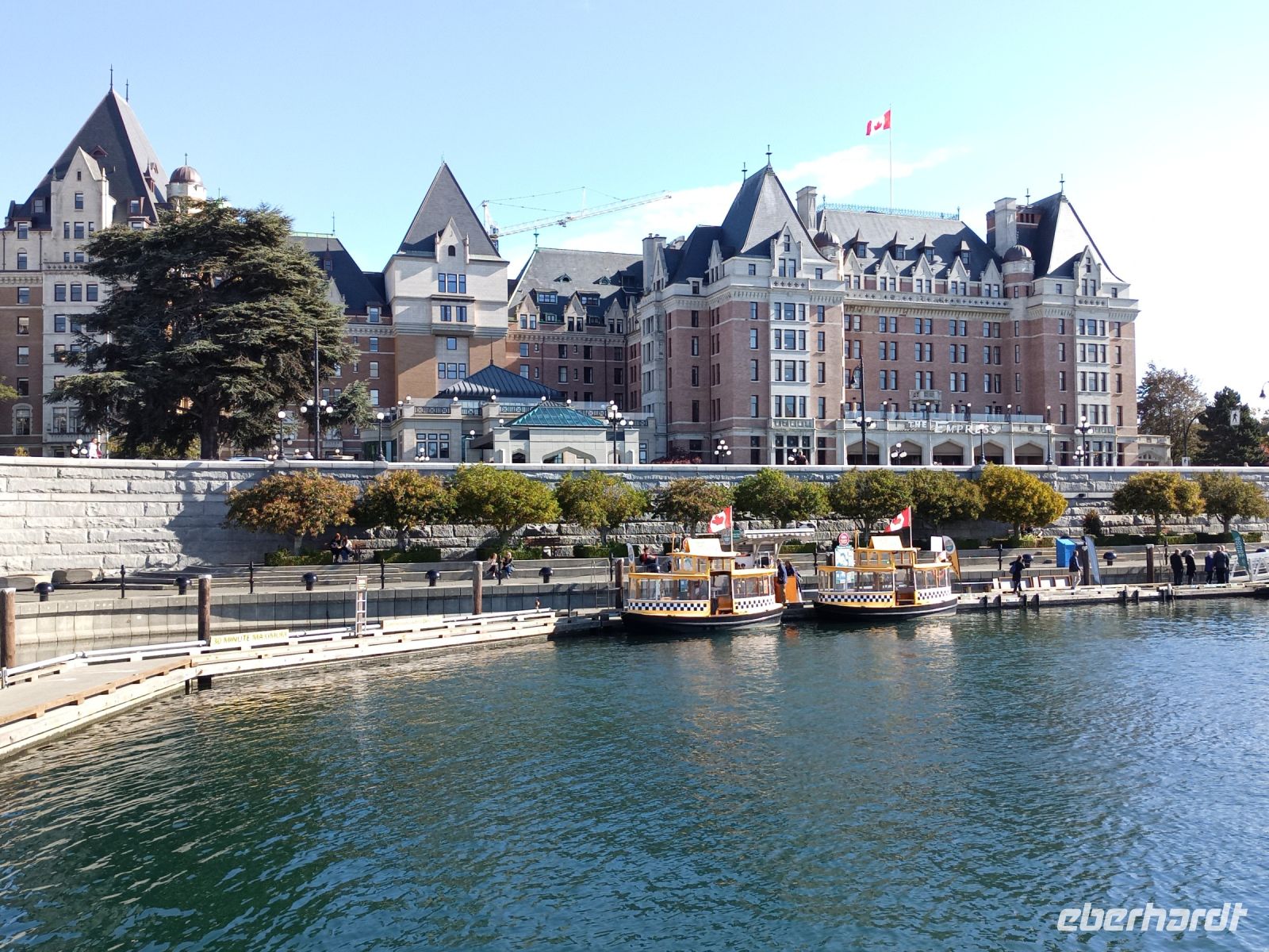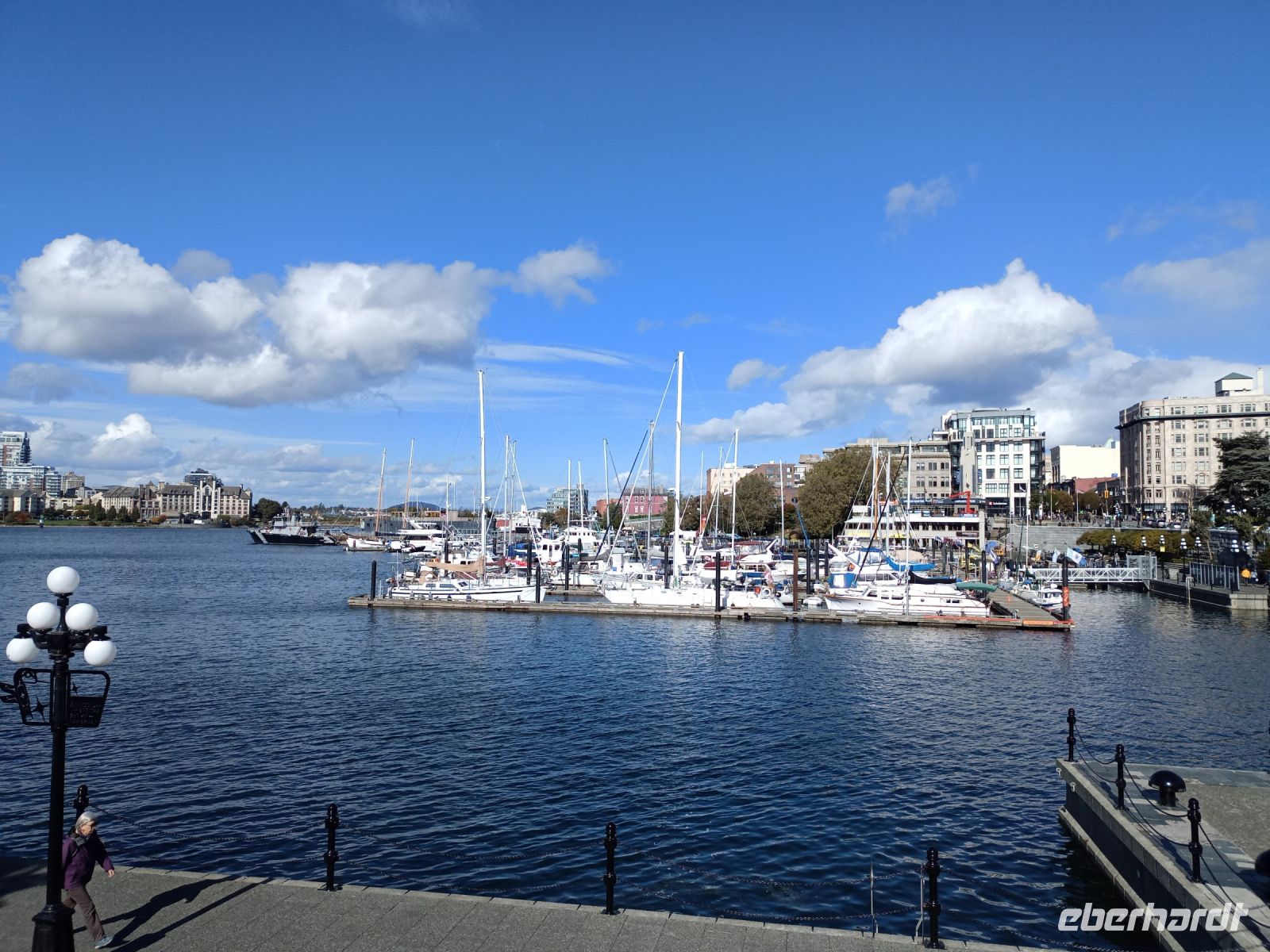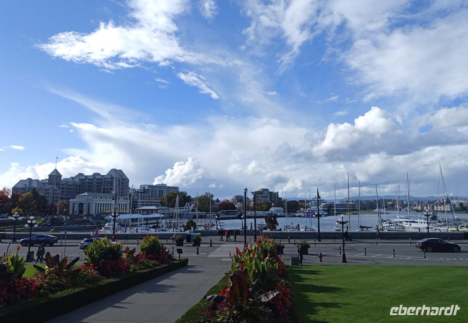 Das Parliament House repräsentiert die Geschichte, Kultur und politische Entwicklung der Provinz und gilt als nationales Erbe. Neben dem Parlament befindet sich das Royal BC Museum, das einen Einblick in die Geschichte und Natur der Provinz gibt. Aber wer möchte bei diesem Wetter ins Museum? Wir schlendern an dem Hafen, der direkt gegenüberliegt. Hier schaukeln weiße Yachten und Boote, aber es gibt auch eine Möglichkeit, individuell vom Wasser die Stadt zu erkunden. Victoria Harbour Ferry bietet Rundfahrten für Touristen an. Neben Rundfahrten fungieren die gelben Boote auch als Wassertaxis, die Passagiere flexibel von einem Punkt zum anderen bringen.