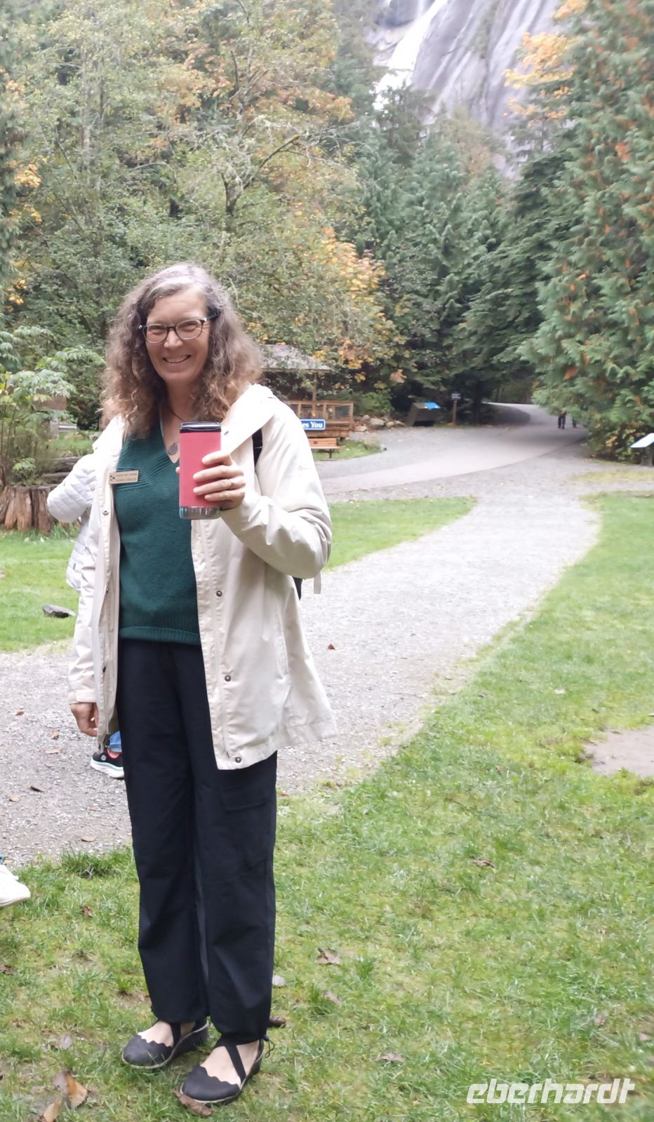Einen Stopp legen wir am Wasserfall, Shannon Falls ein. Hier bewundern wir die Kreationen der Natur, des drittgrößten Wasserfalls von British Columbia, wo das Wasser aus etwa 330 Meter Höhe hinunter rauscht. Unten ist eine gemütliche Wiese mit Tischen und Bänken. Hier holen wir unseren, durch Regen abgesagten “Thanksgiving-Umtrunk“ nach – diesmal gibt es für die Männer auch einen Canadian Whisky ohne Ahornsirup. Ein kleiner Schub für unseren Kreislauf.