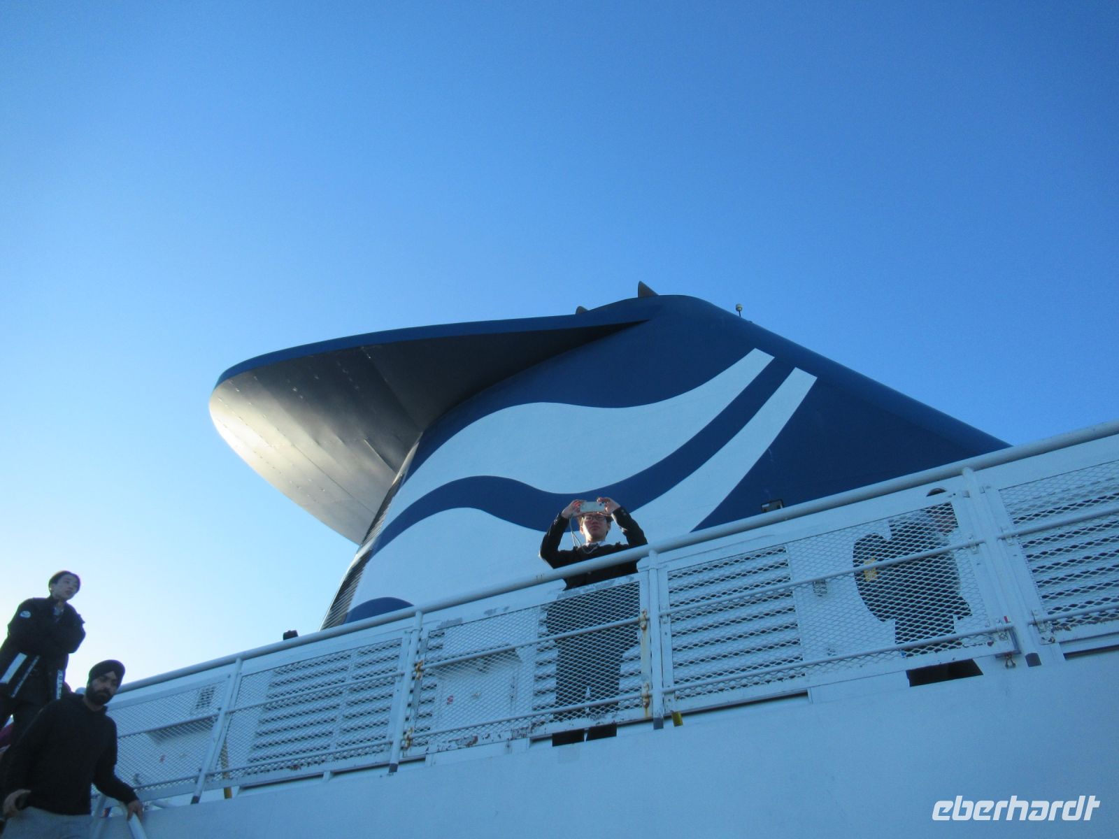 Wer so große Fähren nicht kennt, ist schon erstaunt, wie viele Busse, Autos und Kraftwagen auf eine so eine Fähre samt der vielen Menschen reinpassen. Alles ist sehr gut organisiert und gekennzeichnet. Marion gibt uns die wichtigen Informationen, um sicher zu stellen, das alle den Bus wieder finden.