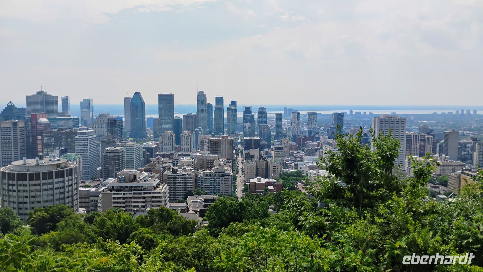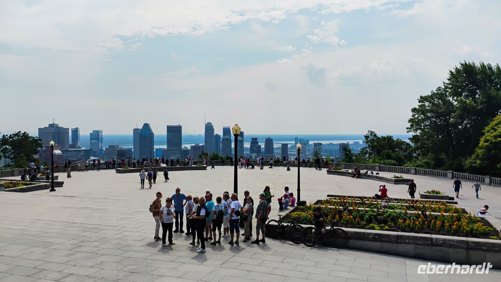Wenig später stehen wir auf dem Aussichtspunkt des Mount Royal. Von hier liegt uns Montréal zu Füßen: Hochhäuser und Kirchtürme ragen aus einem grünen Mosaik hervor, im Hintergrund schlängelt sich der Sankt-Lorenz-Strom durch die Szenerie – ein atemberaubender Blick! Der Stadtberg „Mont Royal“, benannt vom französischen Entdecker Jacques Cartier, war übrigens namensgebend für Montréal selbst.