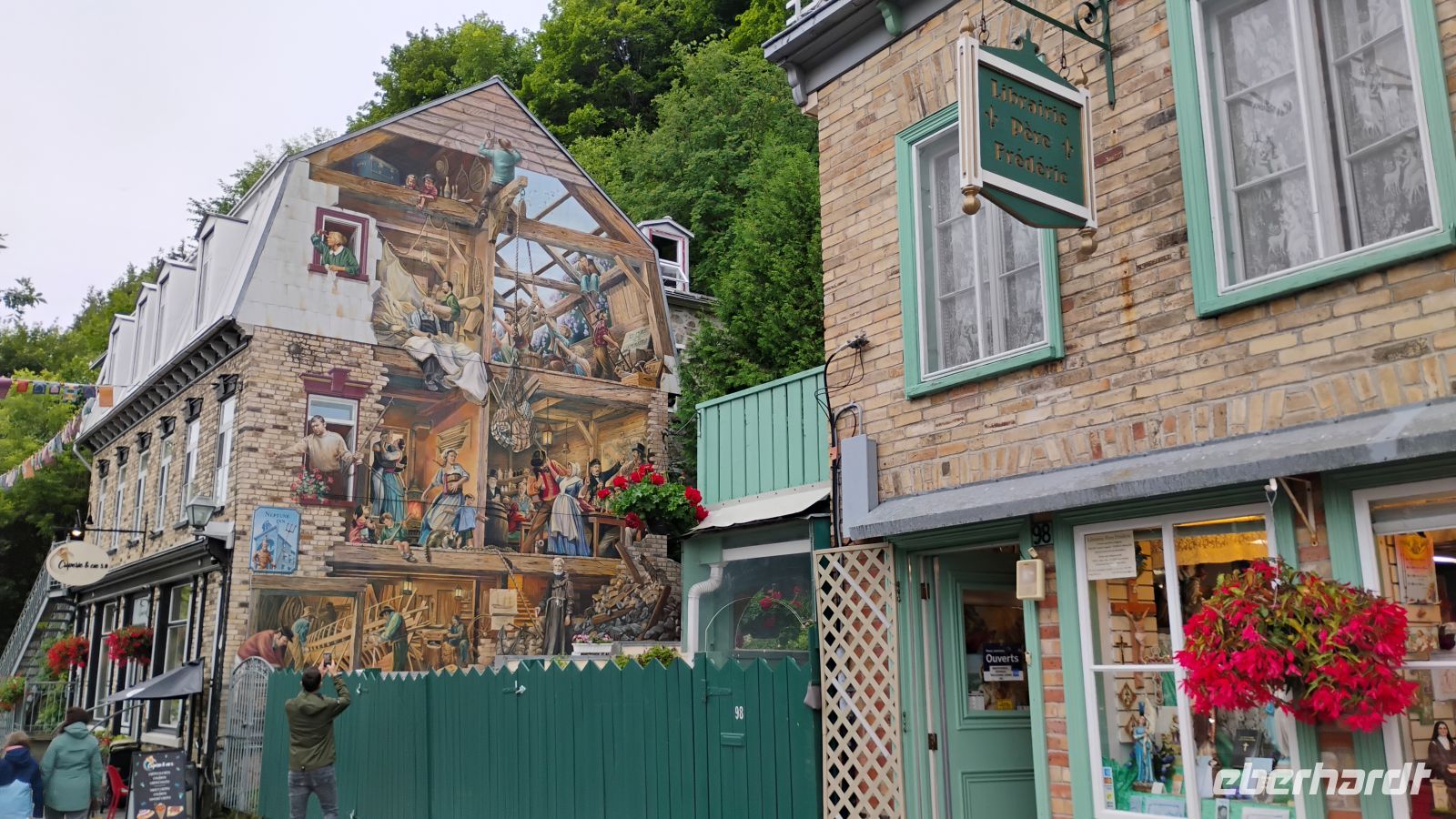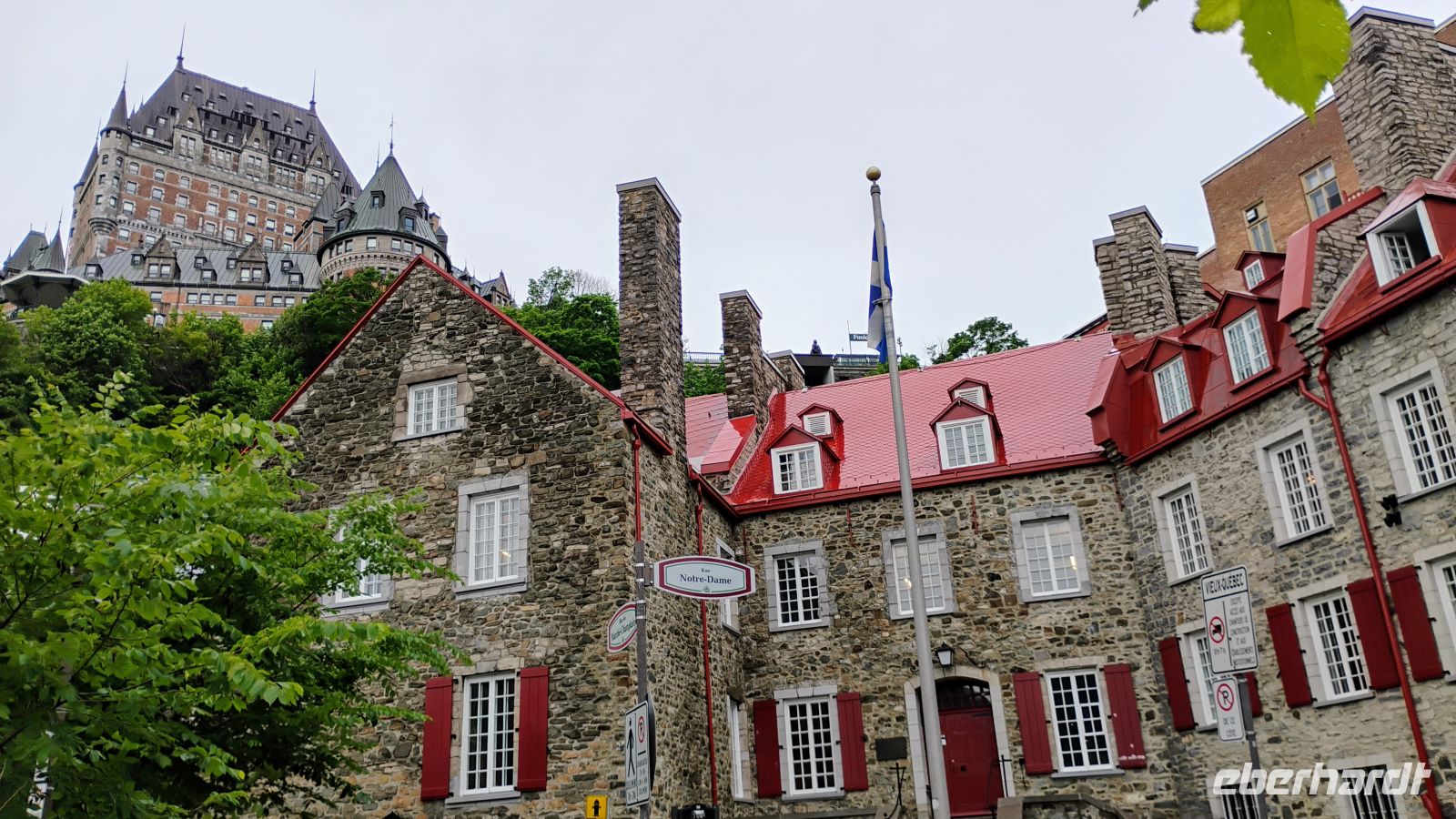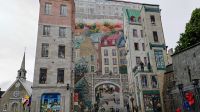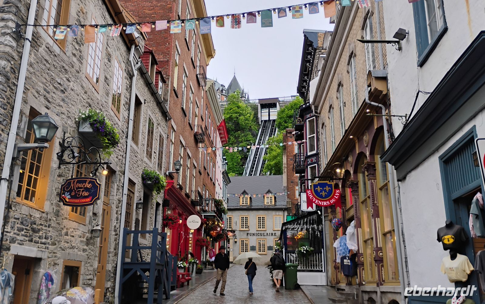 Trotz Wind und leichtem Regen starten wir gut gelaunt in den Tag. Mit Clive am Steuer bringt uns der Bus zunächst in die Unterstadt von Québec. Hier beginnt unser Spaziergang mit der örtlichen Reiseleiterin Marina durch das historische Viertel – vorbei an alten Kaufmannshäusern, kleinen Boutiquen, Cafés und Galerien. Das Kopfsteinpflaster glänzt im Nieselregen, doch der Charme dieser Stadt lässt sich davon nicht trüben.