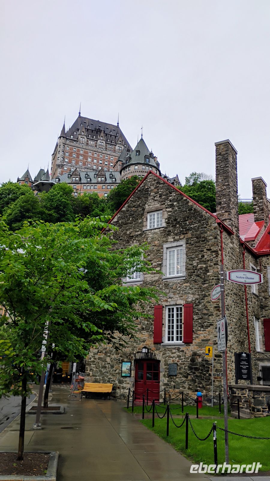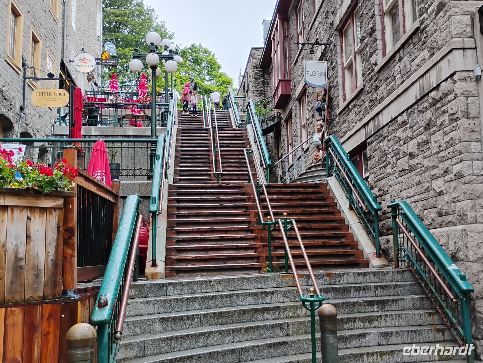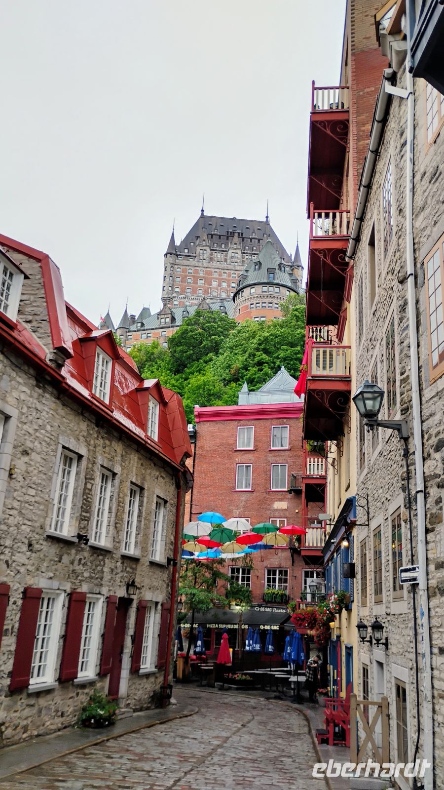 Trotz Wind und leichtem Regen starten wir gut gelaunt in den Tag. Mit Clive am Steuer bringt uns der Bus zunächst in die Unterstadt von Québec. Hier beginnt unser Spaziergang mit der örtlichen Reiseleiterin Marina durch das historische Viertel – vorbei an alten Kaufmannshäusern, kleinen Boutiquen, Cafés und Galerien. Das Kopfsteinpflaster glänzt im Nieselregen, doch der Charme dieser Stadt lässt sich davon nicht trüben.