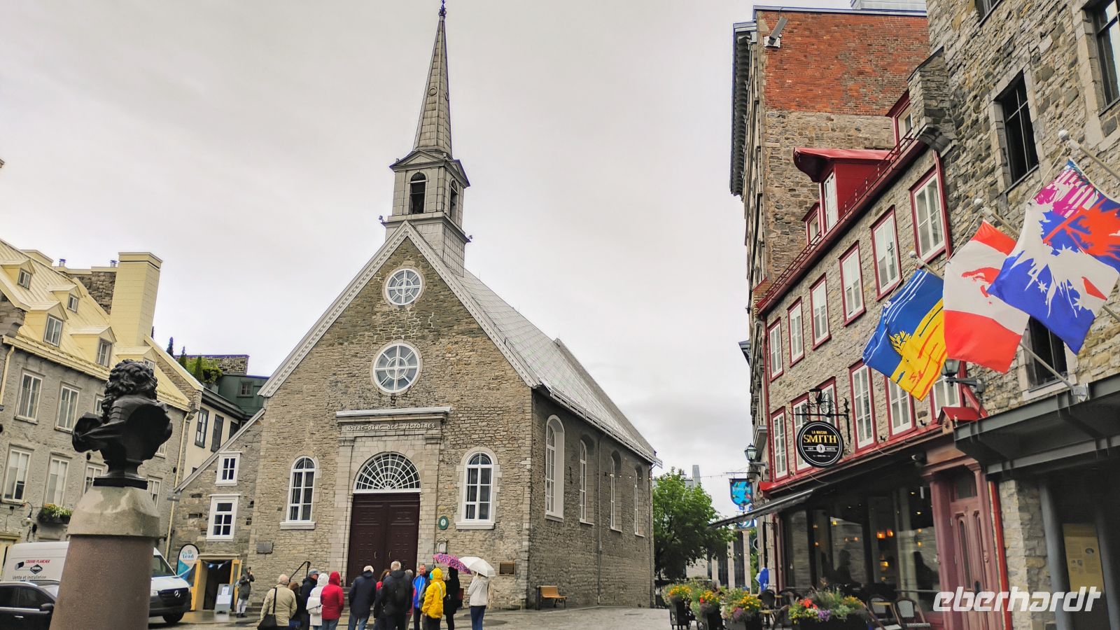 Dann wird der Regen und der Wind immer stärker, wir flüchten in die imposante Kathedrale Notre-Dame de Québec. Dort erleben wir einen ruhigen Moment – geschützt vor Wind und Wetter. Danach laufen wir durch strömenden Regen in den nächsten Pub für eine gemütliche Mittagspause.