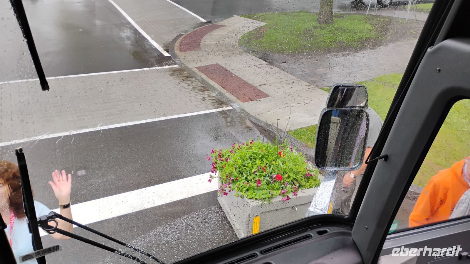 Ein kleiner Zwischenfall sorgt für Spannung: Zwei Blumenkübel aus Beton versperren uns den Weg. Unsere Männer versuchen sich an der Aufgabe, doch nichts bewegt sich. Unser Busfahrer Clive meistert es schließlich mit viel Geduld und Zentimeterarbeit, den Bus dazwischen durch zu manövrieren. Millimeterarbeit mit Applaus!