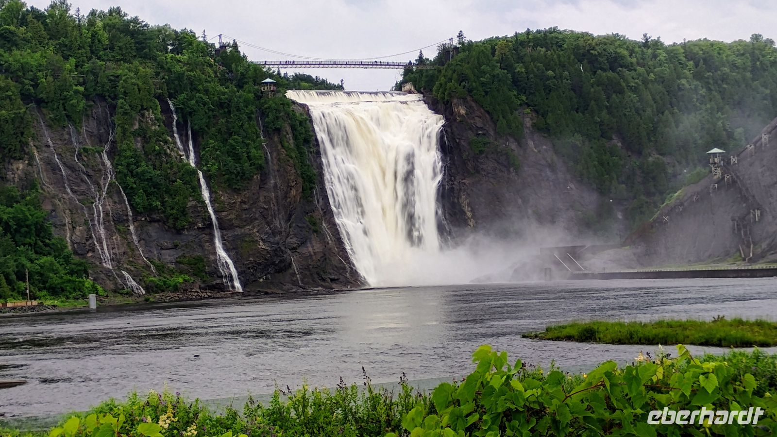 Gut gestärkt geht es zu den Montmorency Falls (mit 83 Metern sogar höher als die Niagarafälle!) Dagmar erzählt uns dazu die tragische Legende einer jungen Frau, die sich hier einst untröstlich nach dem Tod ihres Geliebten in den Wasserfall stürzte. Noch heute nennt man den schmalen weißen Wasserschleier am Rand „Brautschleier“.