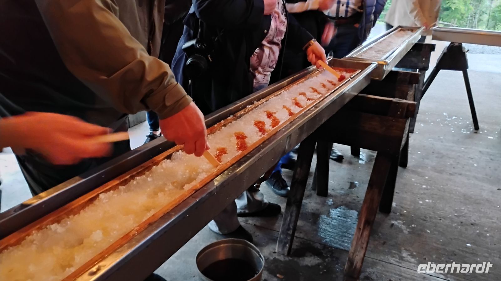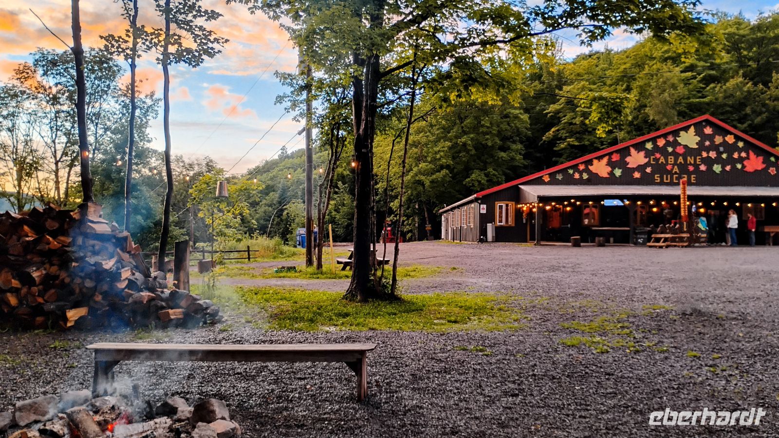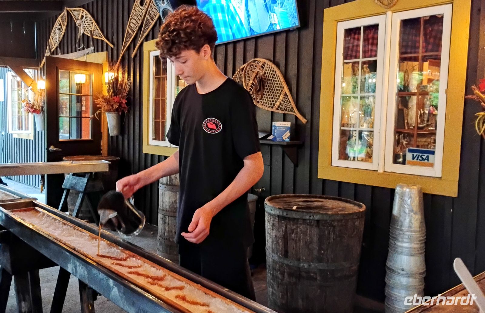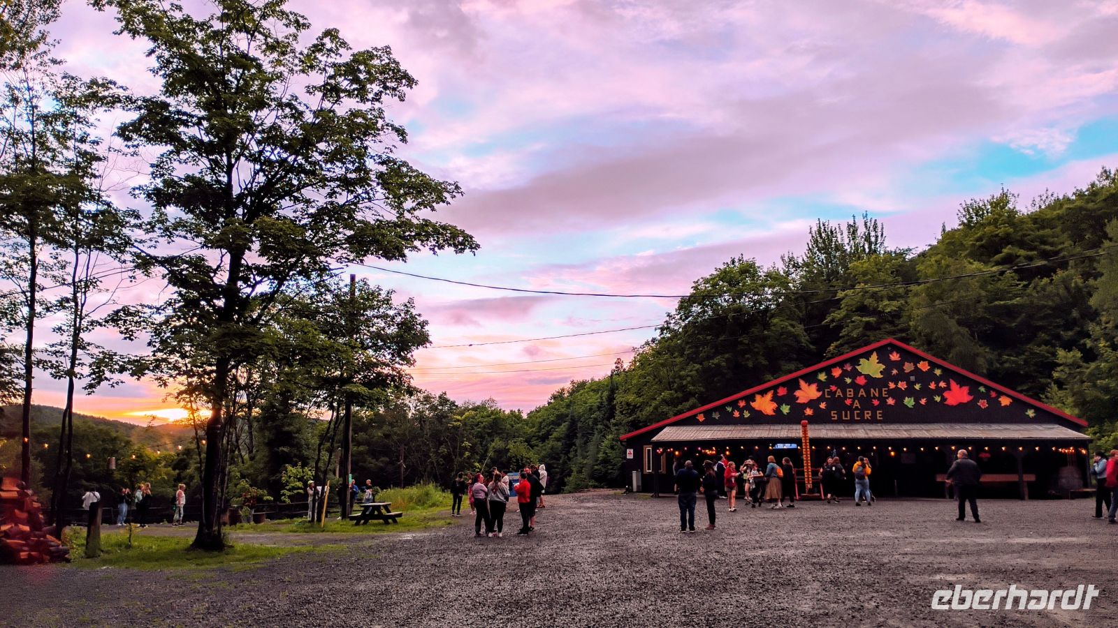 Am Abend schließlich erreichen wir die „Cabane à sucre“ – ein rustikales Blockhaus inmitten der Wälder. Hier erleben wir einen traditionellen „Sugar Shack“-Abend mit allem, was dazugehört: Wir sitzen an langen Holztafeln, zu verschiedenen herzhaften Speisen nach Rezepten, die wir oft nicht kennen, wird Ahornsirup gereicht, dazu spielt Live-Musik. Dagmar versichert uns: Das hier ist keine Touristenattraktion – die Menschen der Region kommen selbst gern hierher, das ist Tradition. An unseren beiden Tischen sitzen auch zwei ältere Herren aus der Region. Die Kommunikation mit ihnen gestaltet sich leider etwas holprig, da unsere Französischkenntnisse leider recht begrenzt sind. Zum Dessert gibt es Pfannkuchen mit Sirup, und zum Abschluss rollen wir draußen auf Eis gegossenen Ahornsirup zu Lollies. Inzwischen hat sich der Himmel geklärt, die Sonne blinzelt durch die Baumkronen und taucht den Abend in warmes Licht. Vielleicht ist es der Zucker, vielleicht das Zusammensein oder weil wir endlich die Sonne wieder sehen: Jedenfalls kehren wir glücklich und zufrieden zurück ins Hotel.
