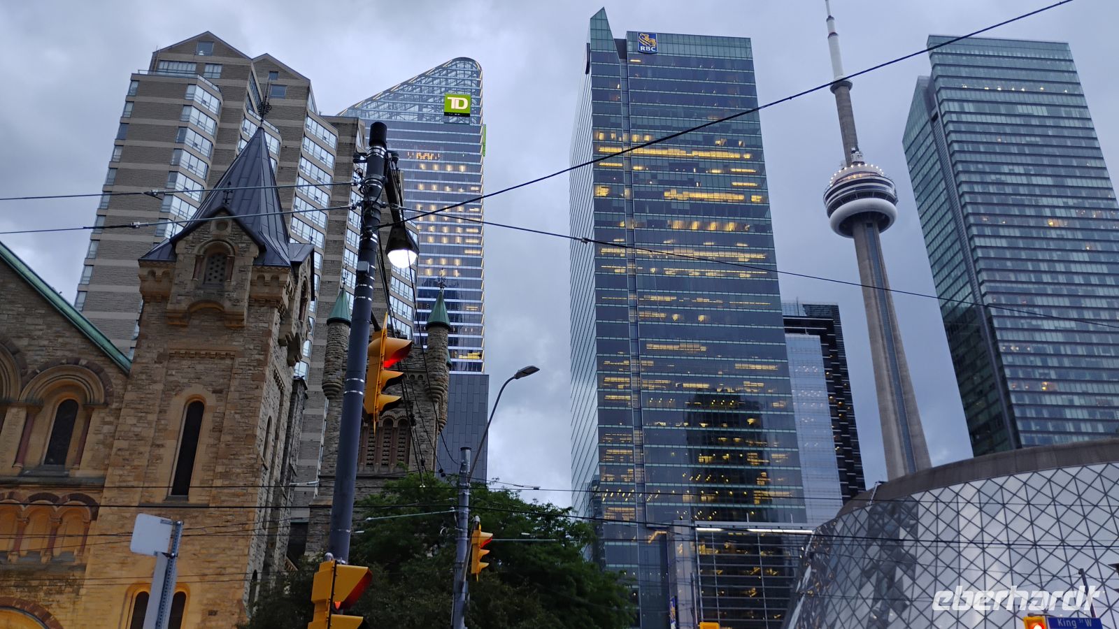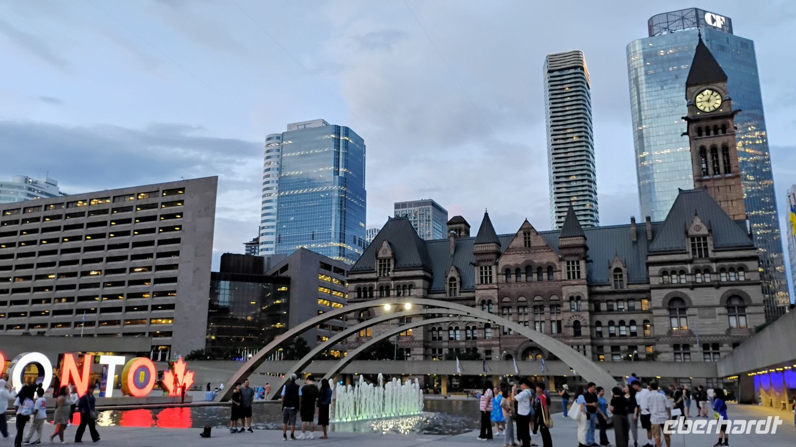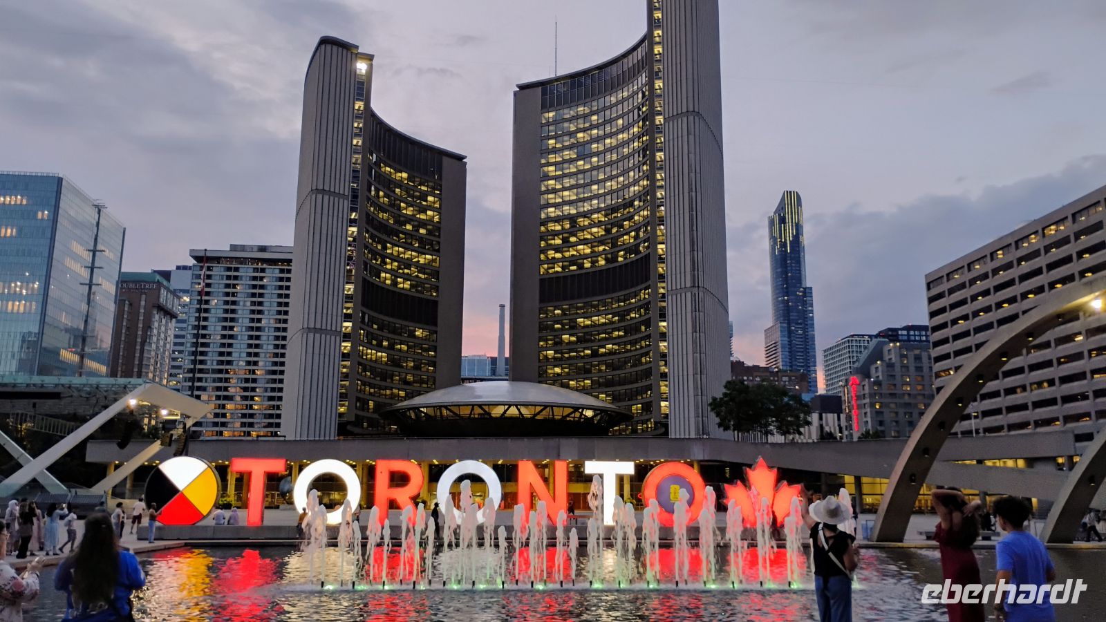 Unser Hotel liegt zentral – es ist zudem das größte der Stadt. Die Gruppe teilt sich am Abend auf: Manche essen in nahegelegenen Lokalen, andere zieht es trotz leichten Regen zum Nathan Phillips Square, zum Toronto-Schriftzug und zum CN Tower.