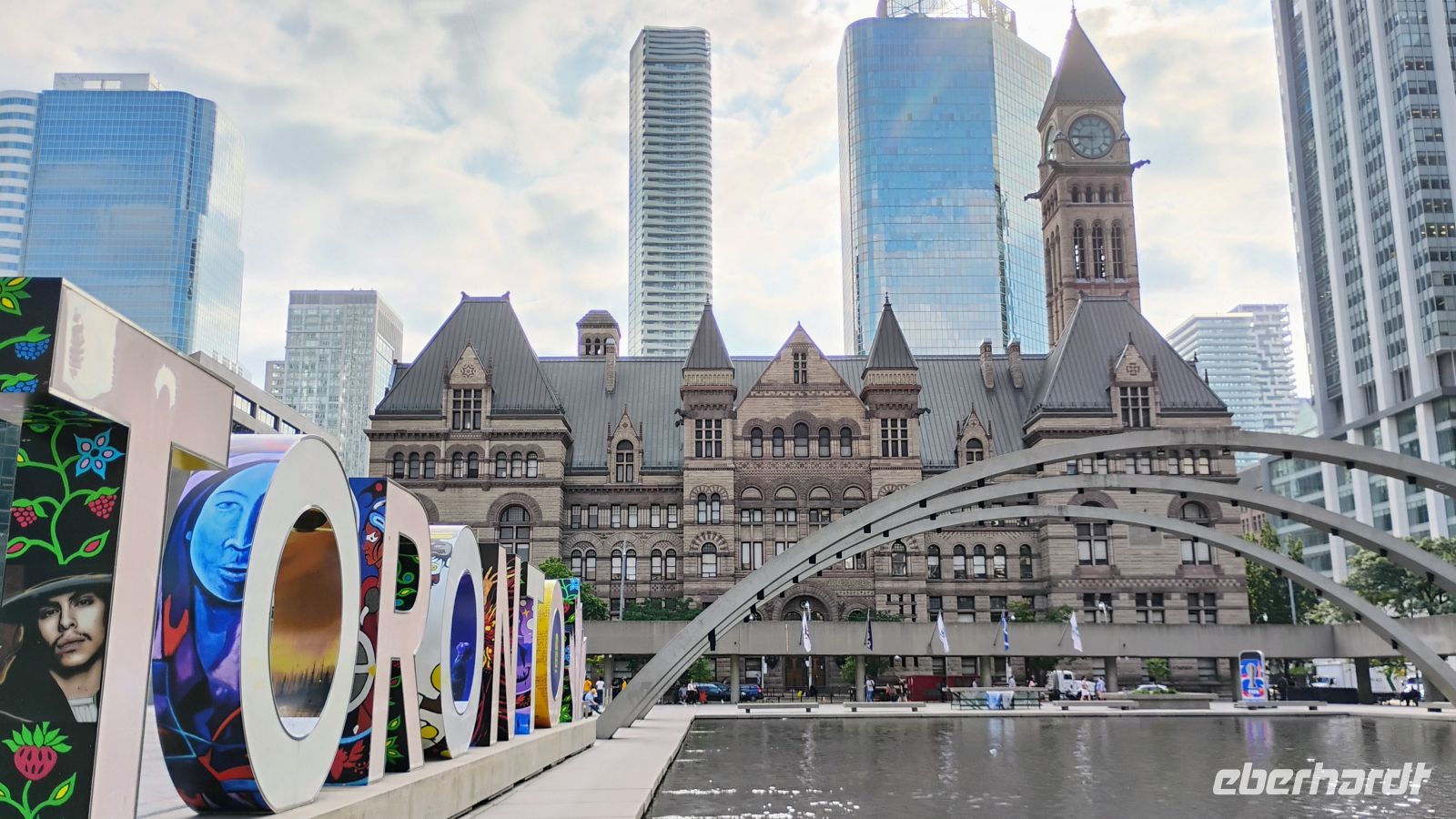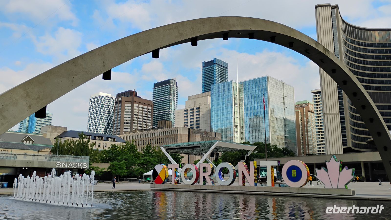 Um 8:30 Uhr starten wir zur Stadtrundfahrt durch Toronto. Am Nathan Phillips Square legen wir unseren ersten Fotostopp ein: Die großen, bunten Buchstaben des „Toronto“-Schriftzugs ziehen sofort alle Blicke auf sich.