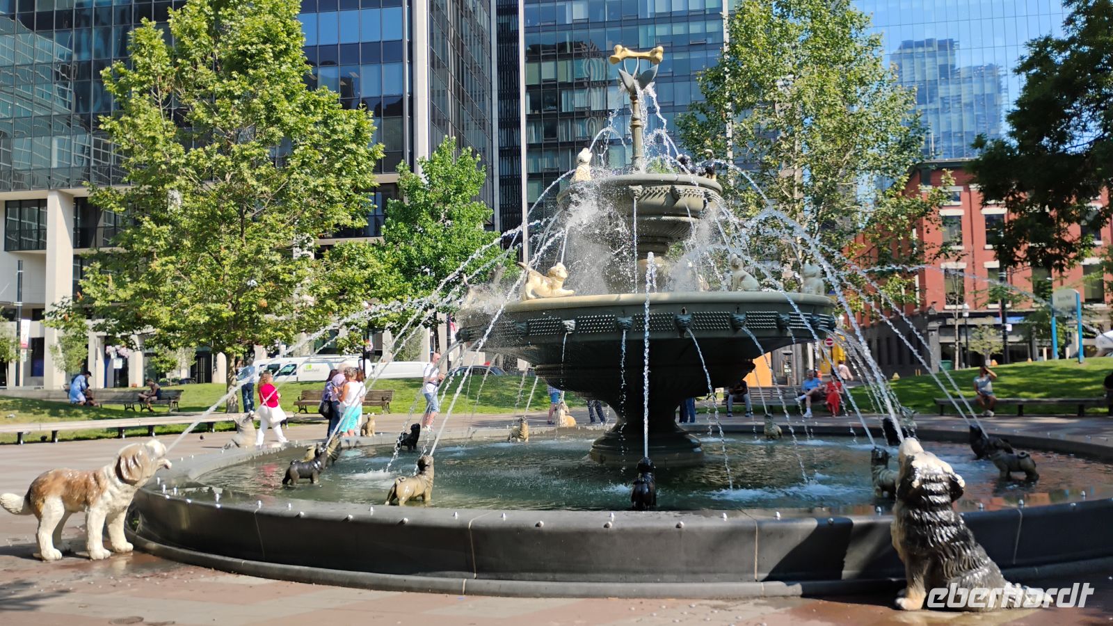Weiter geht’s zum Berczy Park, wo der verspielte Dog Fountain für Aufsehen sorgt: 27 bronzene Hunde, eine Katze und ein Knochen als Springbrunnen – gestaltet vom bekannten Landschaftsarchitekten Claude Cormier, der auch den ikonischen „Ring“ in Montréal entworfen hat. Der kleine Park ist ein beliebter Treffpunkt für Hunde und ihre Besitzer – entsprechend lebendig ist die Stimmung.