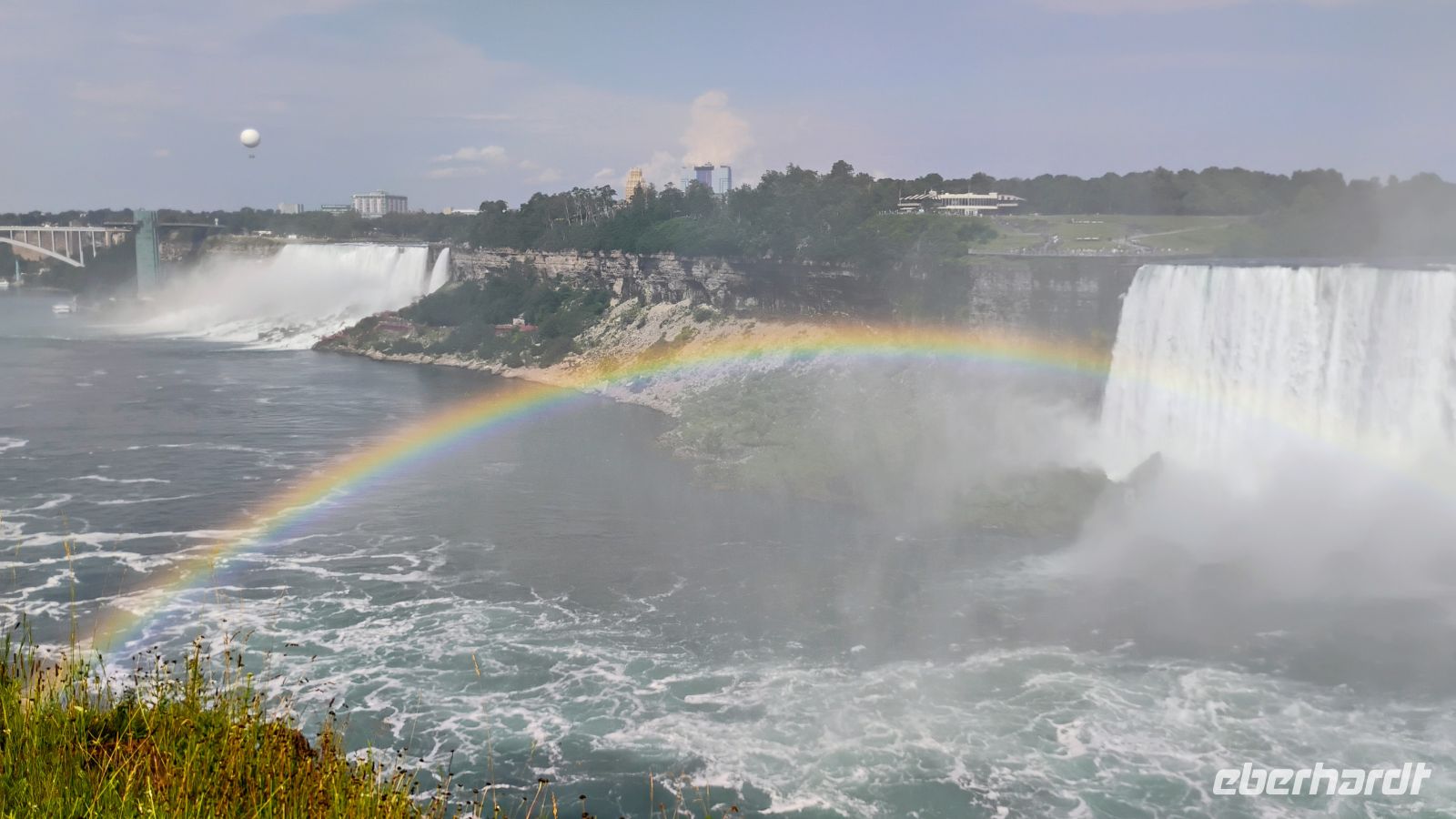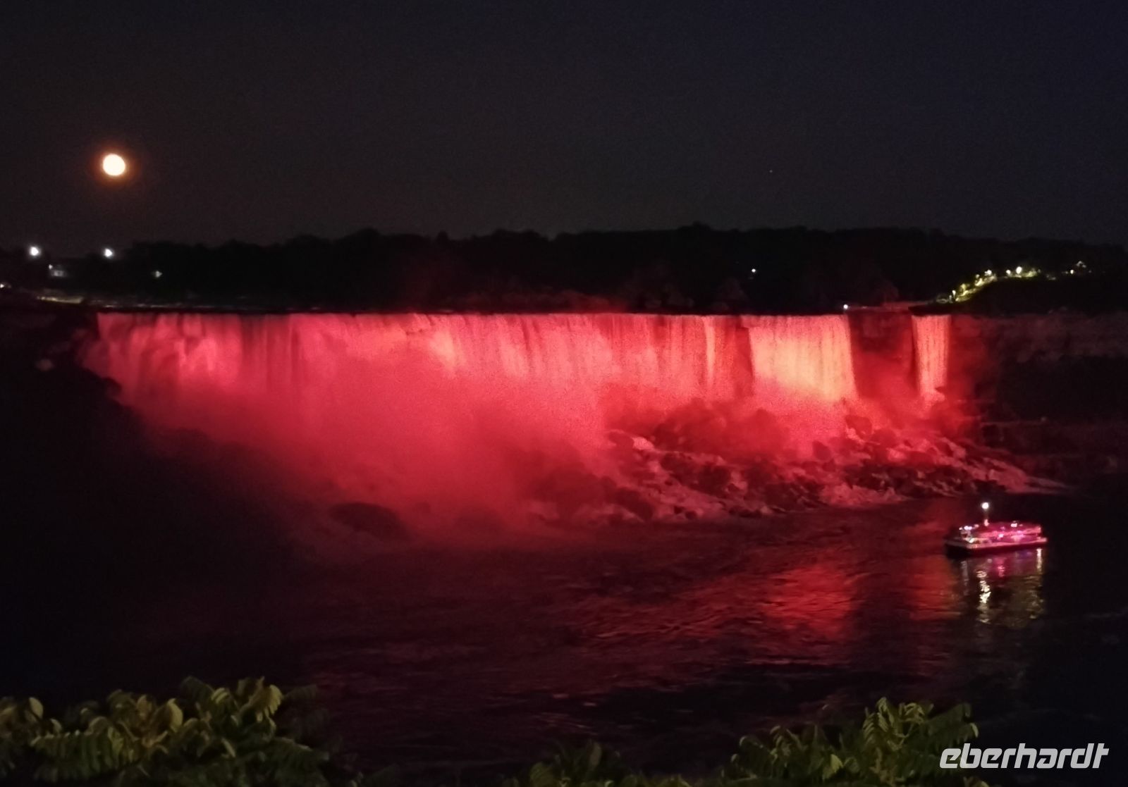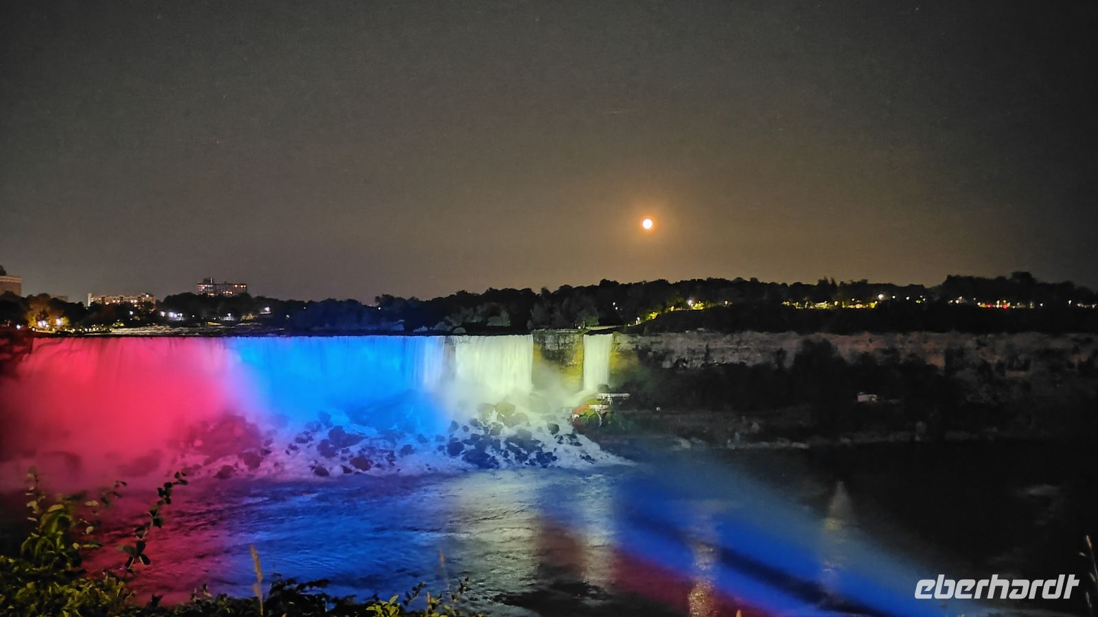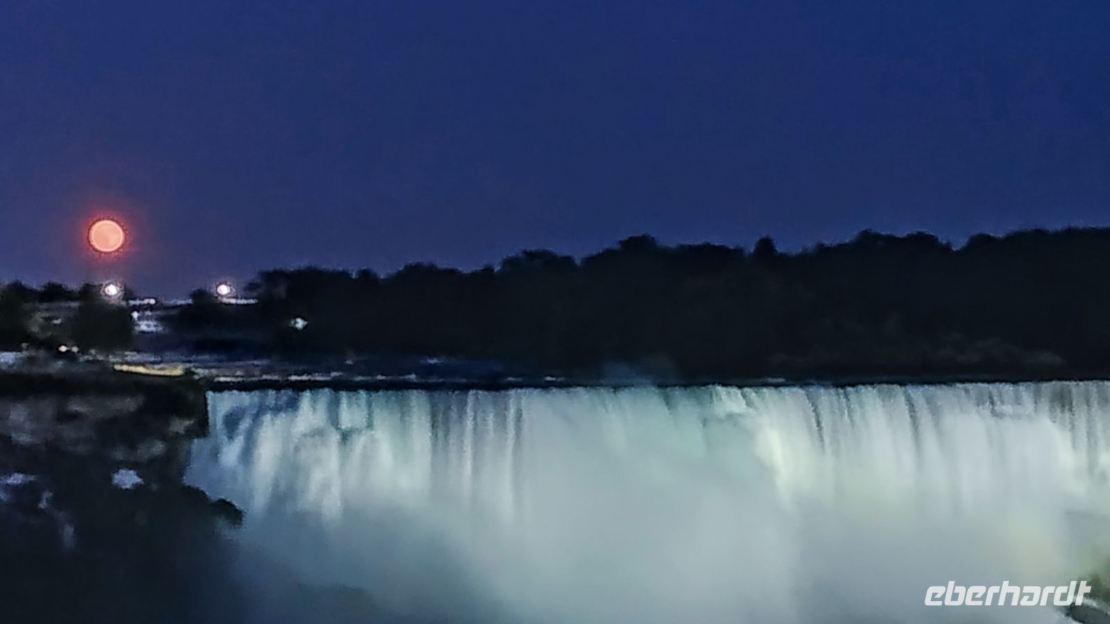 Ein besonderes Highlight: Überraschenderweise geht der Vollmond direkt über dem „amerikanischen“ Wasserfall auf. Die Fälle sind zudem beleuchtet, und das Farbenspiel von Wasser und Licht ist einzigartig. Einige schauen vom Hotelzimmer aus zu, andere stehen direkt an der Promenade.