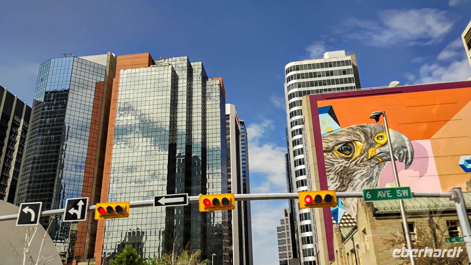 Weil in Calgary gerade das große Cowboy-Fest „Calgary Stampede“ stattfindet – die größte Outdoor-Show der Welt – fällt unsere Stadtrundfahrt etwas kürzer aus. Schon im Flughafen begegnen uns viele Besucher in Cowboyhüten, und auch draußen ist die Stadt sichtbar im Western-Fieber. Wir halten kurz am Olympiagelände – inklusive Fotostopp beim berühmten Jamaika-Bob.