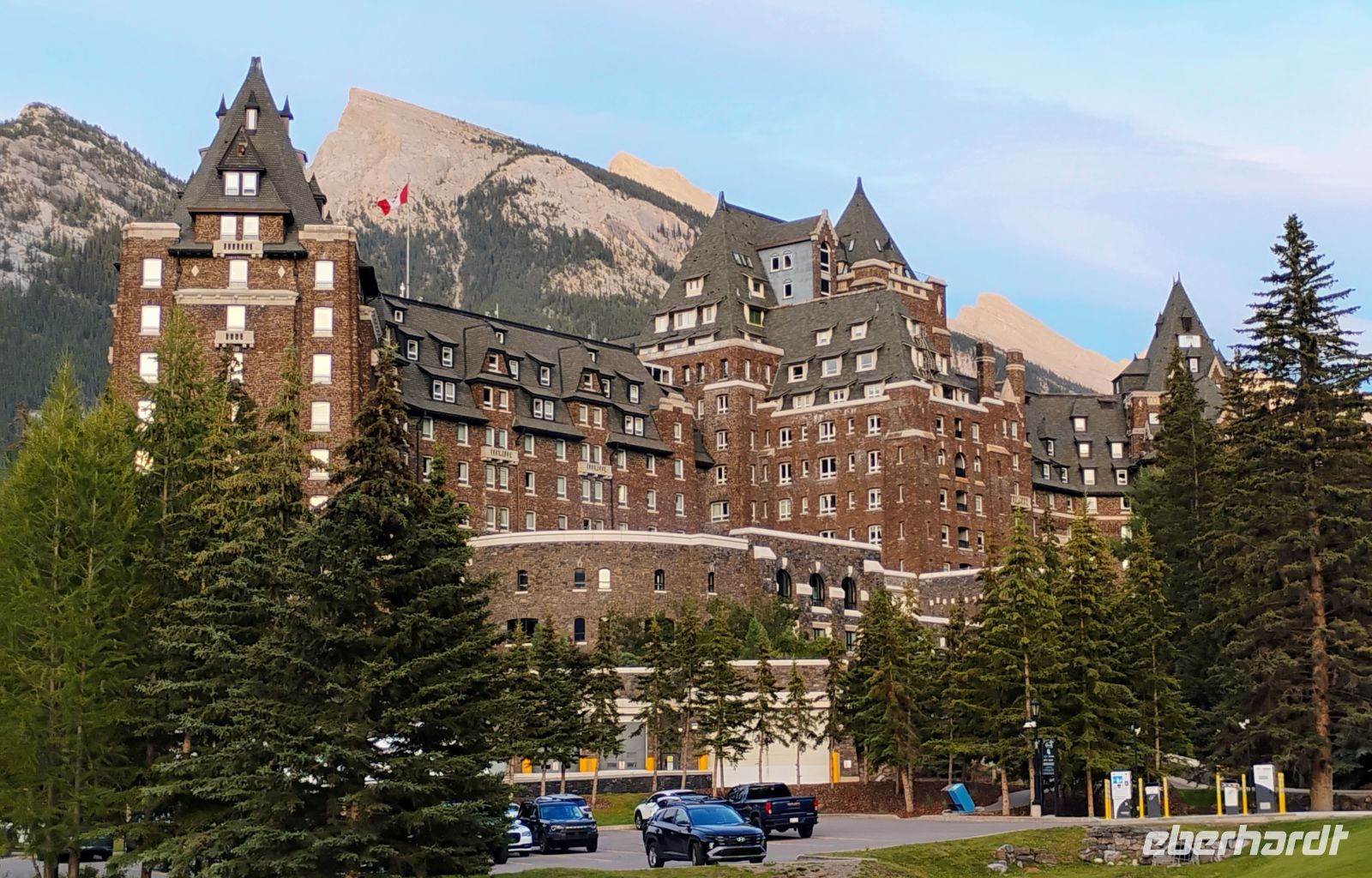 Ein neuer Tag in den kanadischen Rockies beginnt – und der Auftakt lässt sich sehen: Gleich am Morgen bietet sich vom Surprise Corner ein eindrucksvoller Blick auf das ehrwürdige Banff Springs Hotel, das sich märchenhaft zwischen Wald und Bergen erhebt.