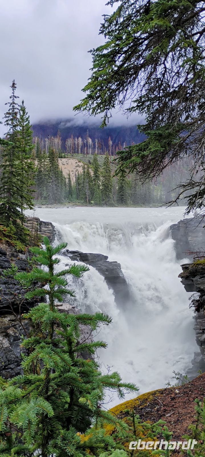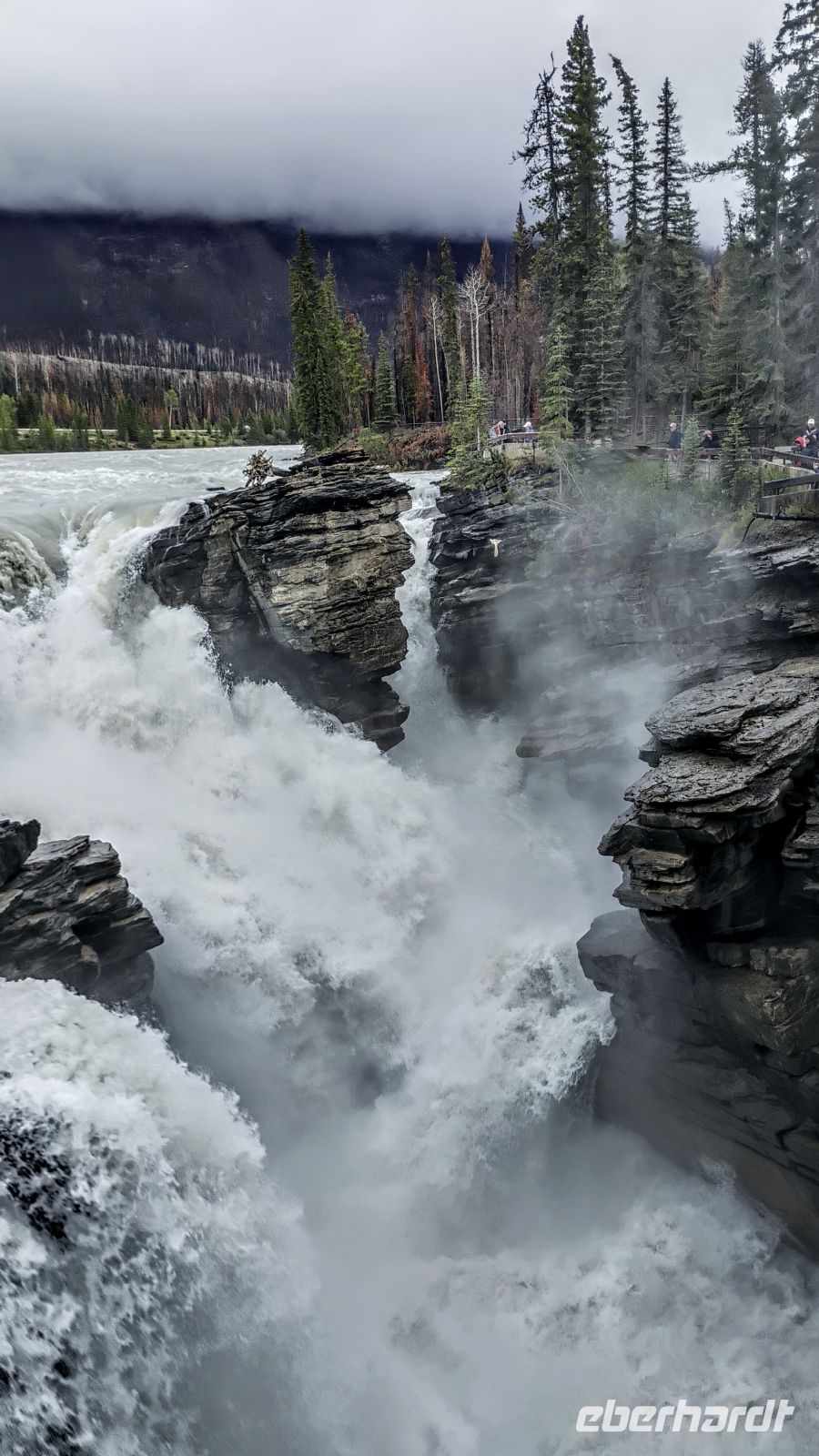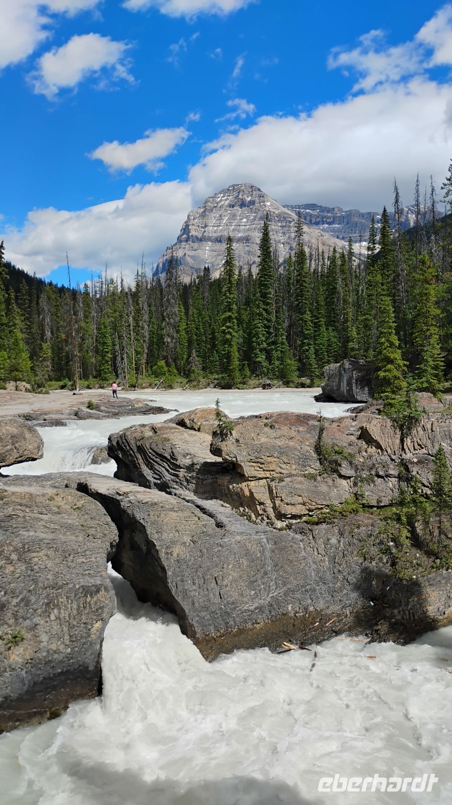 Unser erster Halt führt uns zu den Athabasca Falls, wo sich das Wasser mit ungeheurer Kraft in die Tiefe stürzt. Die Gischt steigt in den Himmel, selbst bei grauem Wetter ein Erlebnis!