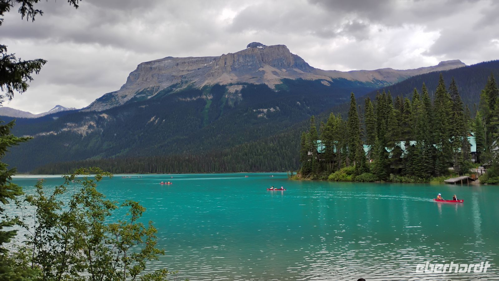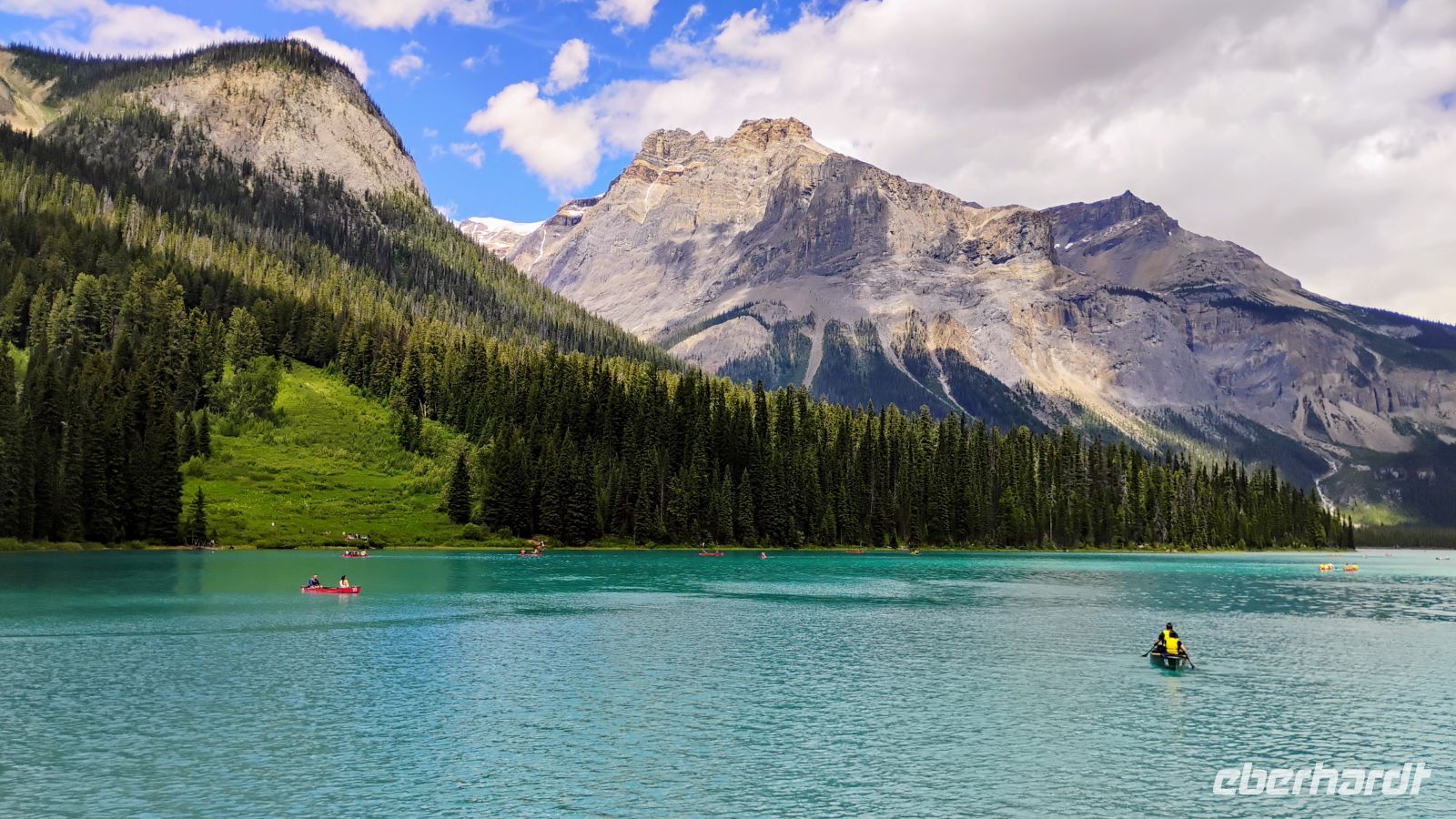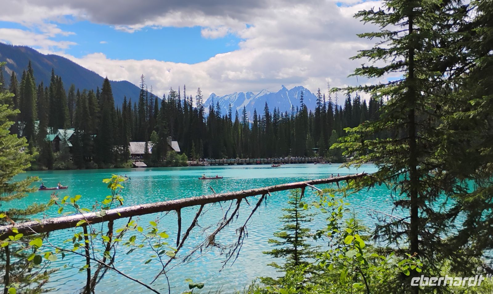 Am Emerald Lake zeigt sich der Yoho-Nationalpark von seiner schönsten Seite. Das Wasser liegt smaragdgrün und ruhig eingebettet zwischen Tannen und Bergen. Das Licht glitzert auf der Oberfläche, ein Moment, den viele von uns einfach genießen – manche sind ein Stück am Ufer entlanggelaufen, andere haben einfach nur das Farbenspiel auf dem Wasser bestaunt. Dass ein See so intensiv grün sein kann, glaubt man fast nur, wenn man es selbst gesehen hat. Ein echtes Juwel der Rockies.