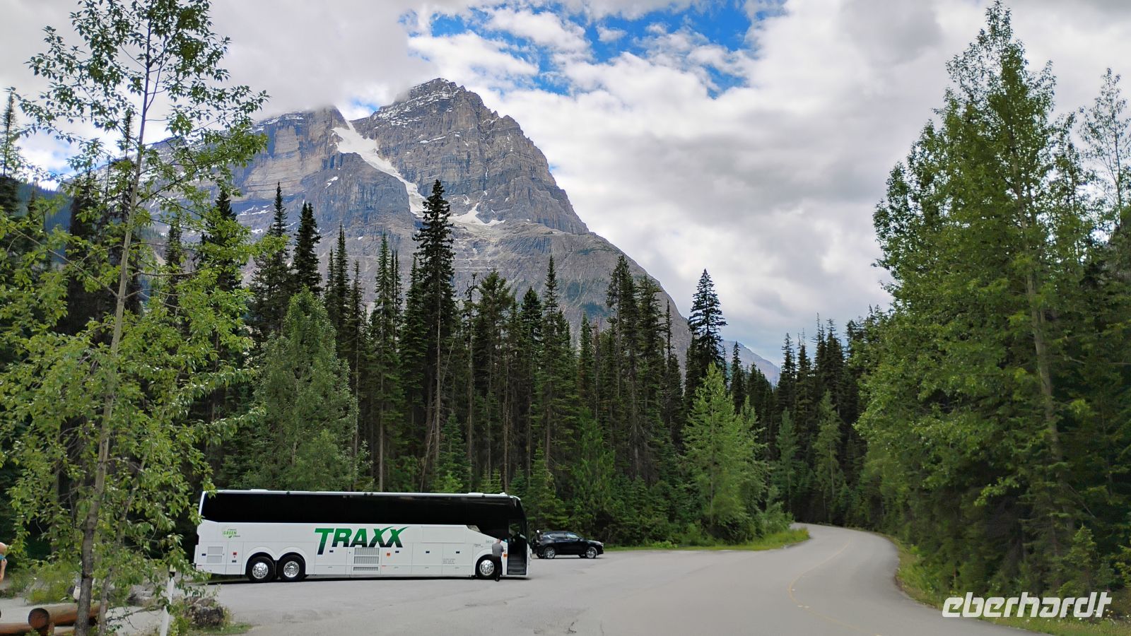 Der Tag beginnt unter tief hängenden Wolken – der Himmel grau, die Luft sehr frisch. Doch auch an regnerischen Tagen entfalten die Rockies ihre ganz eigene Magie. Als wir Jasper verlassen, zieht die Landschaft draußen im Busfenster vorbei – Kilometer um Kilometer verkohlte Baumstämme, die an das große Feuer des letzten Jahres erinnern. An diesem grauen Morgen wirkt die Szenerie fast gespenstisch, aber zugleich eindrucksvoll.