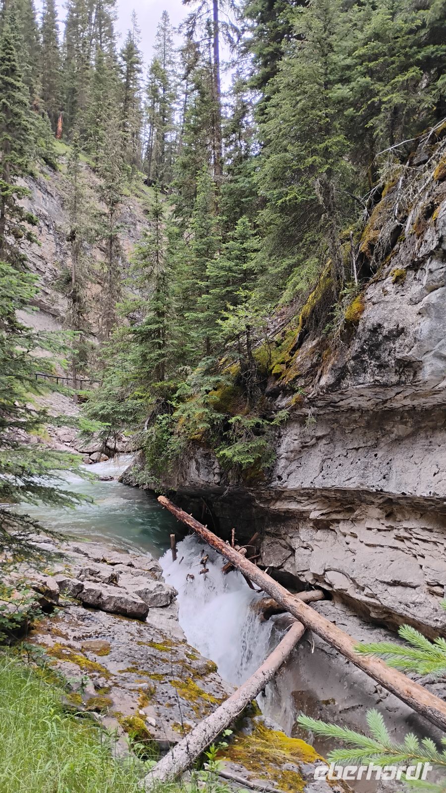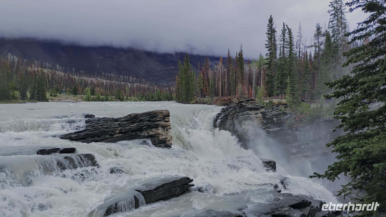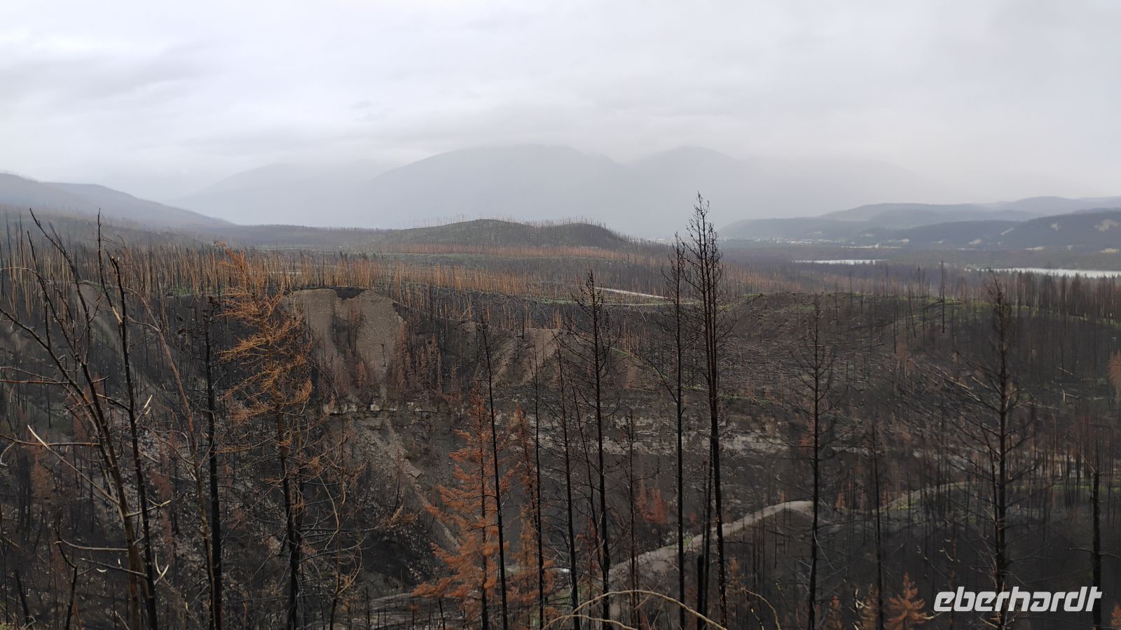 Am Maligne Canyon wird die Tragweite des Feuers noch einmal besonders deutlich. So weit das Auge reicht: verbrannte Hänge, verkohlte Bäume. Der Canyon selbst beeindruckt mit seiner Tiefe und dem tosenden Wasser, das sich durch das Gestein gefressen hat.