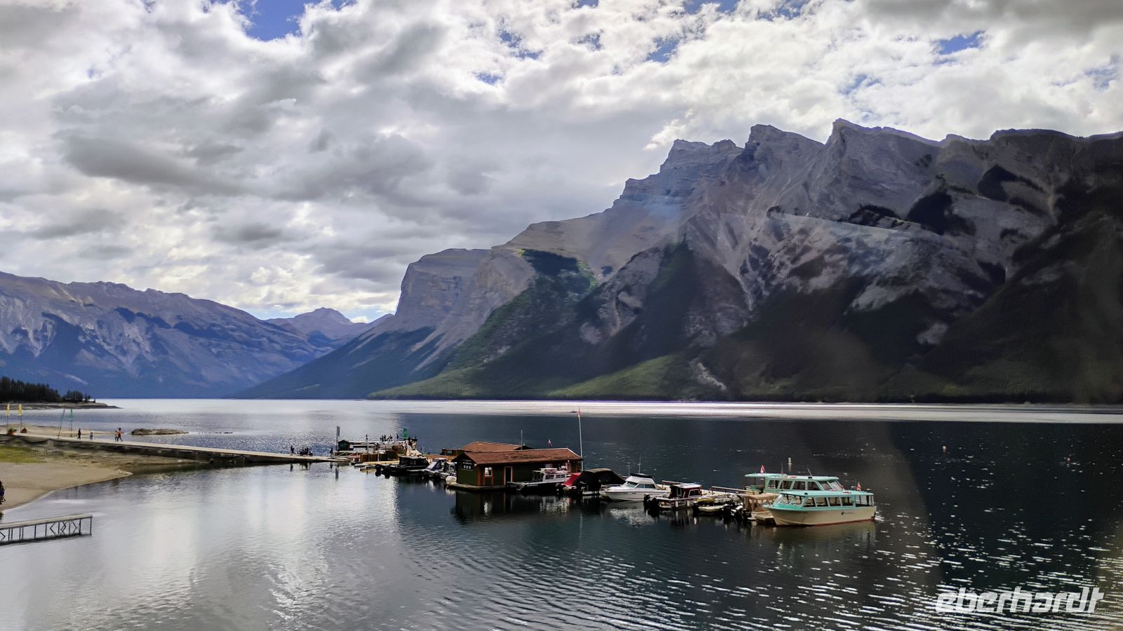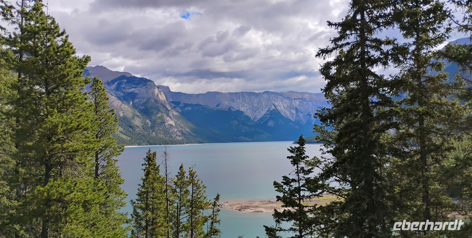 Wir fahren weiter auf dem Tunnel Mountain Drive, einer landschaftlich reizvollen Route mit immer neuen Blicken auf Berge, Wälder und Täler. Kurz darauf erreichen wir einen Aussichtspunkt am Lake Minnewanka. Der langgestreckte See liegt ruhig eingebettet zwischen den Bergen, das Licht glitzert auf dem Wasser, die Luft ist klar – Kanada, wie man es sich vorstellt.