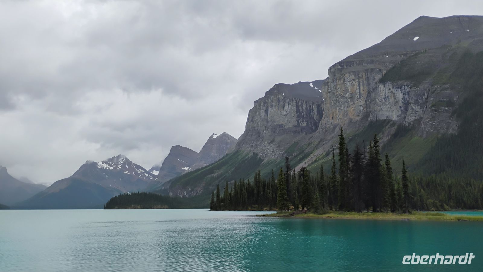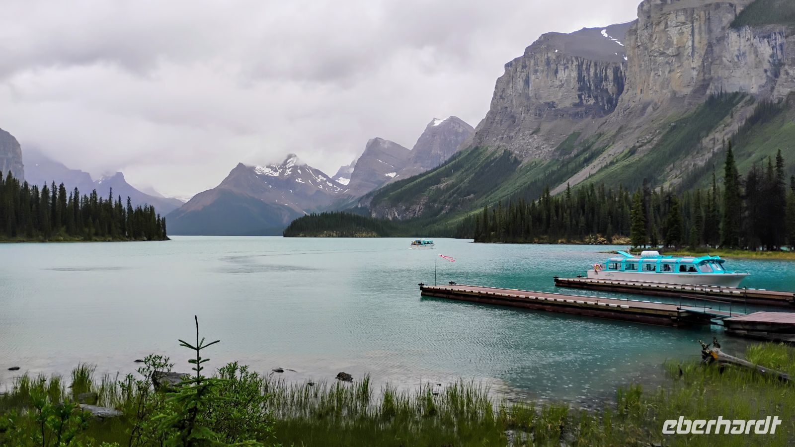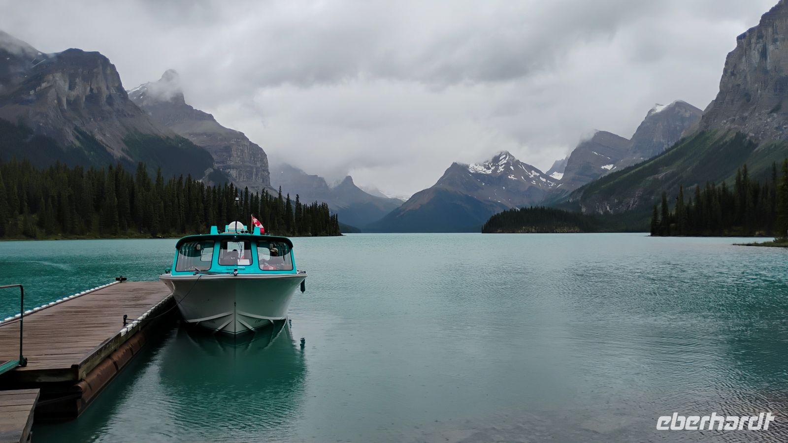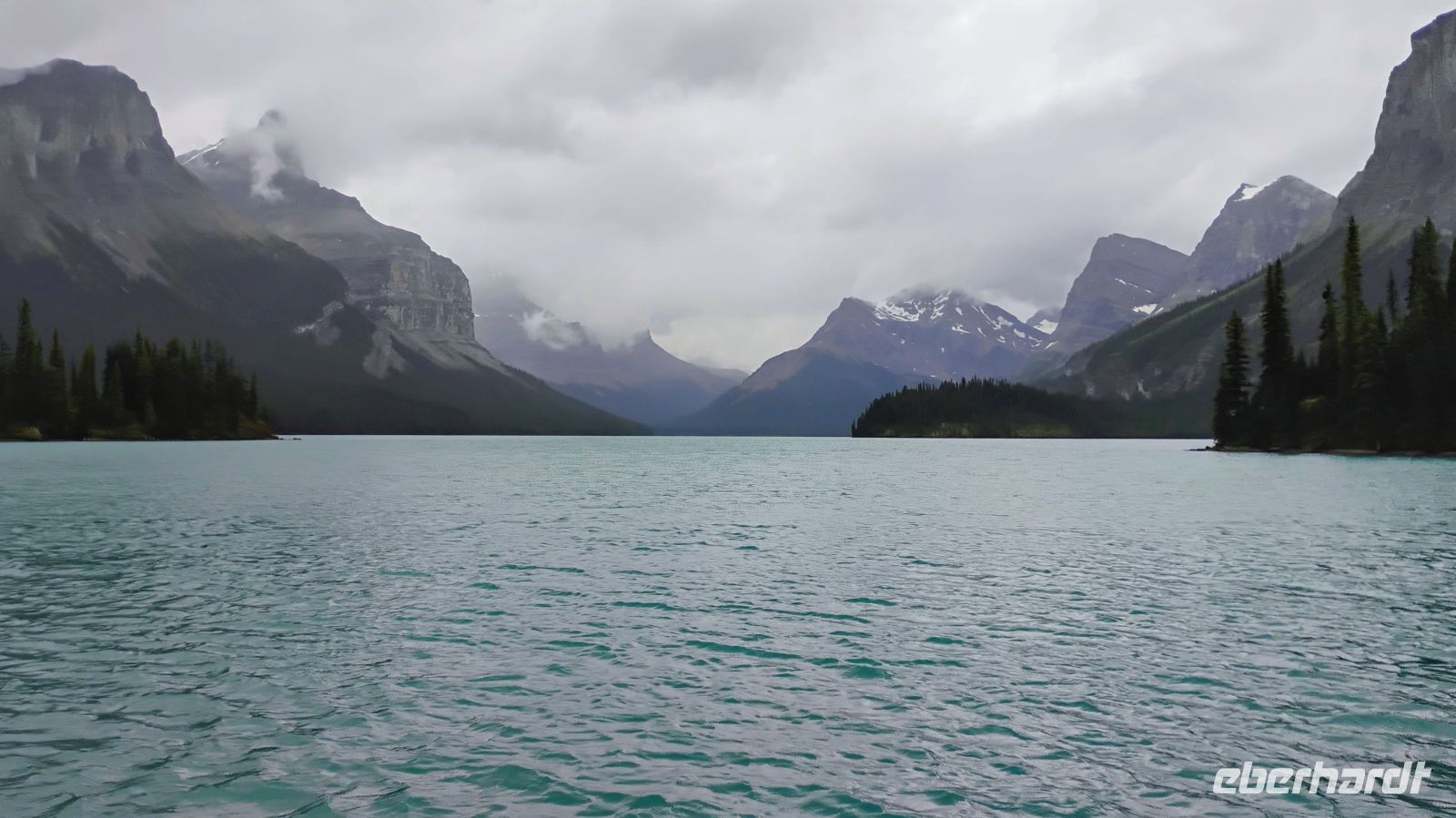 Vorbei am Medicine Lake – dessen Name auf eine alte Legende der First Nations zurückgeht, da sein Wasserspiegel auf geheimnisvolle Weise saisonal verschwindet – erreichen wir den Maligne Lake, einen der größten und schönsten Gletscherseen Kanadas. Der Regen lässt nun langsam nach, nur noch Nebelschwaden hängen in den Bergen.
