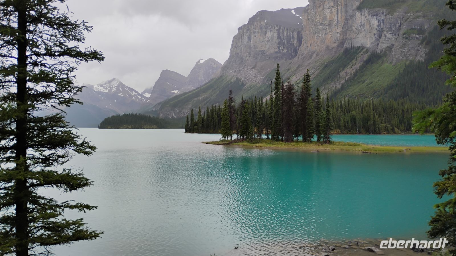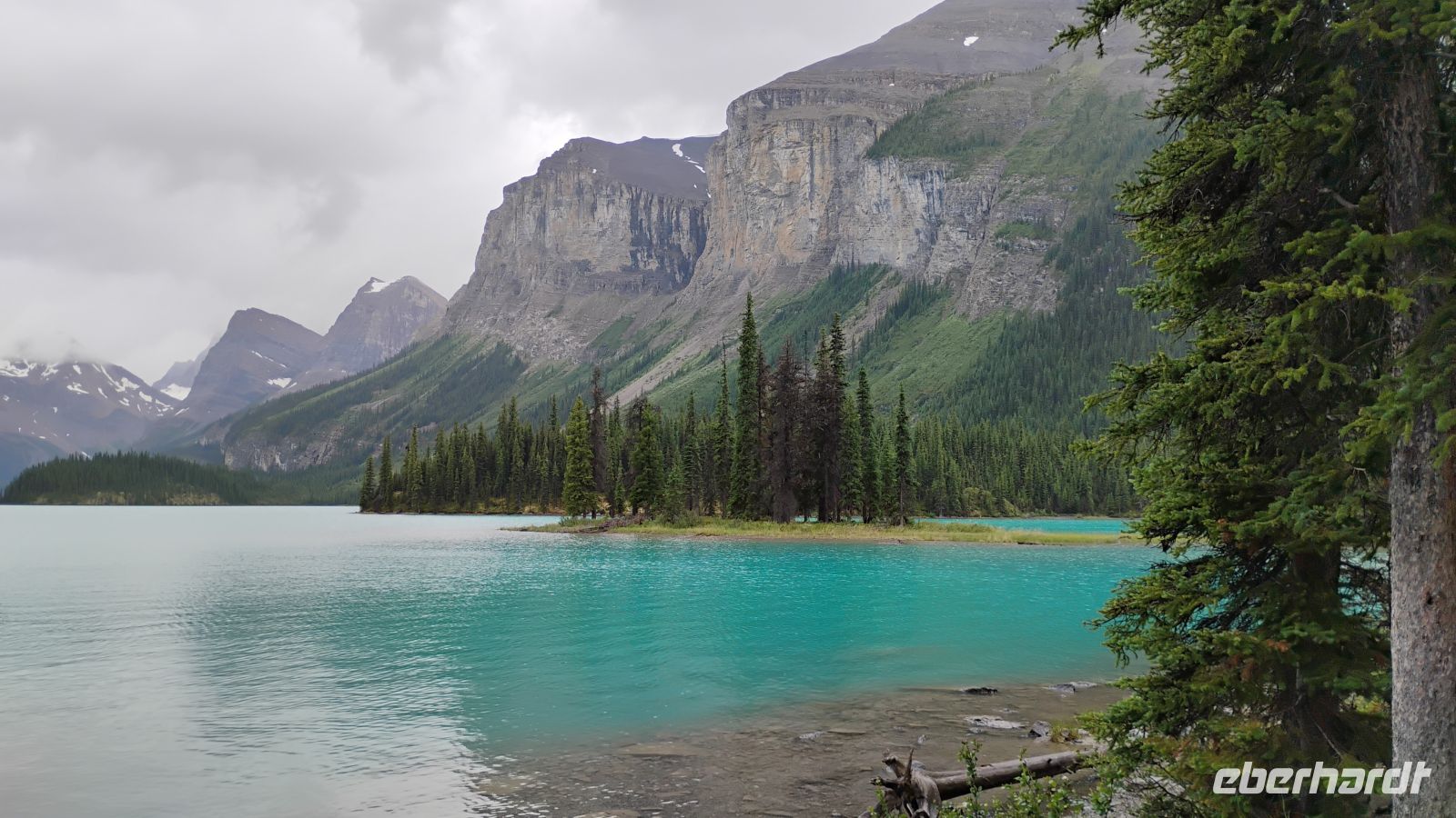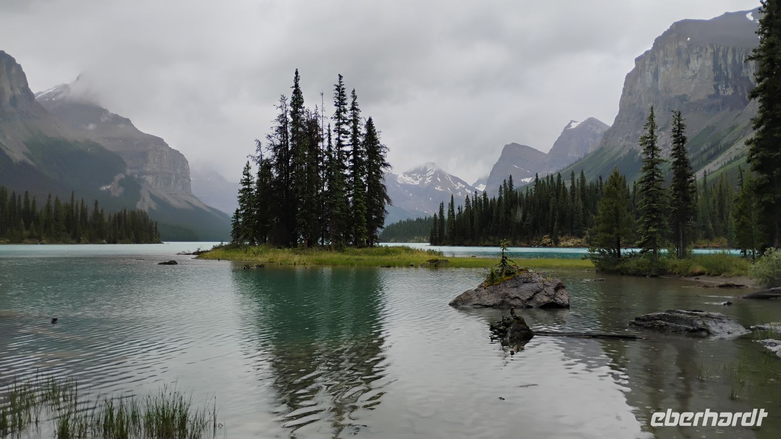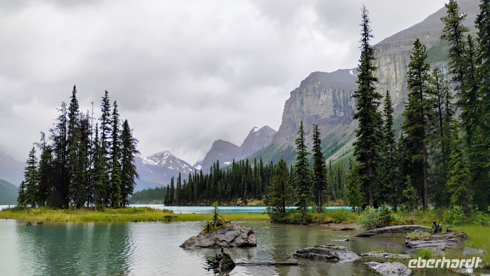 Vorbei am Medicine Lake – dessen Name auf eine alte Legende der First Nations zurückgeht, da sein Wasserspiegel auf geheimnisvolle Weise saisonal verschwindet – erreichen wir den Maligne Lake, einen der größten und schönsten Gletscherseen Kanadas. Der Regen lässt nun langsam nach, nur noch Nebelschwaden hängen in den Bergen.
