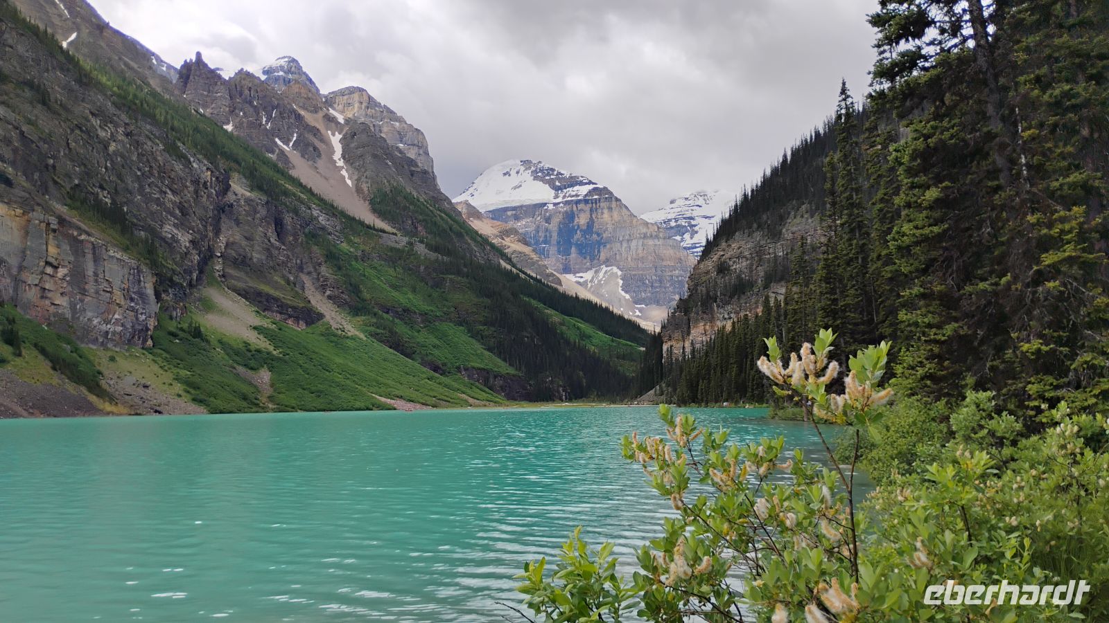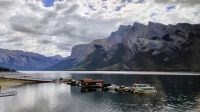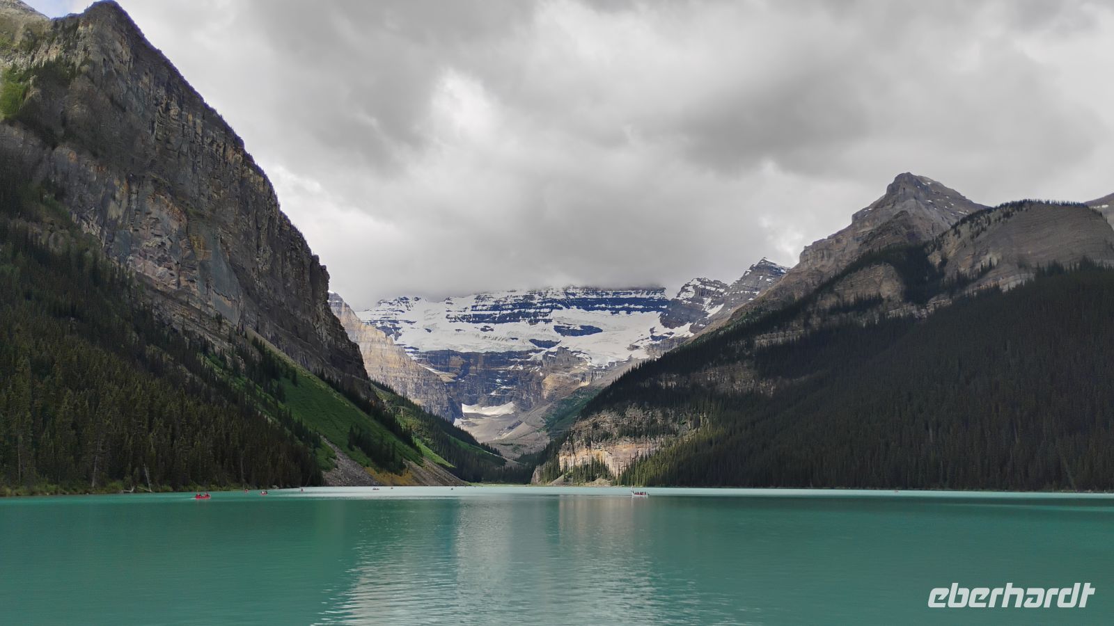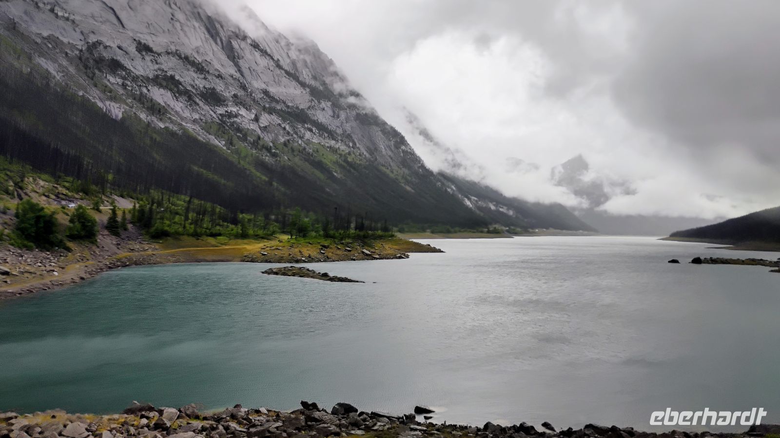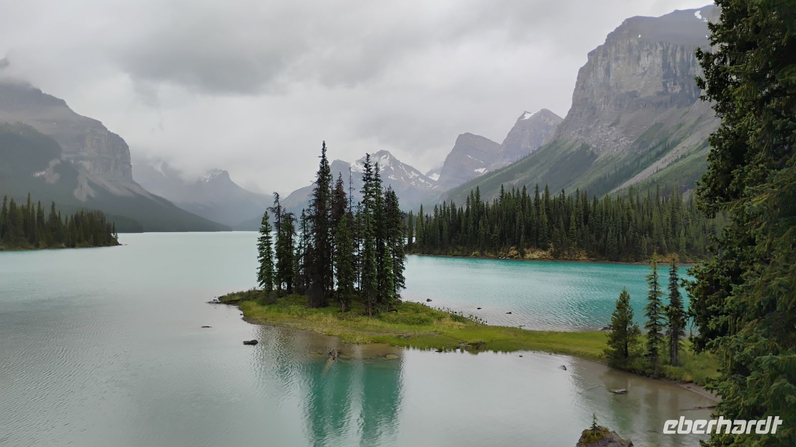 Vorbei am Medicine Lake – dessen Name auf eine alte Legende der First Nations zurückgeht, da sein Wasserspiegel auf geheimnisvolle Weise saisonal verschwindet – erreichen wir den Maligne Lake, einen der größten und schönsten Gletscherseen Kanadas. Der Regen lässt nun langsam nach, nur noch Nebelschwaden hängen in den Bergen.