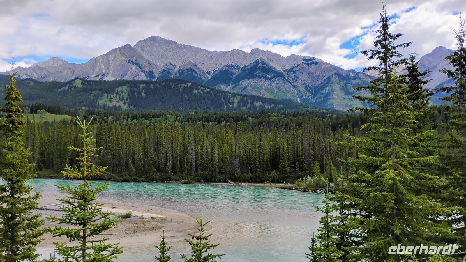 Im kleinen Ort Lake Louise legen wir eine kurze Pause ein. Hier gibt es Gelegenheit, sich für die Mittagsrast mit Snacks und Getränken zu versorgen, bevor wir Alberta verlassen und in die Provinz British Columbia überwechseln. Der Kicking Horse River begleitet uns auf dem Weg – benannt nach einem Vorfall mit einem Pferd, das einst seinen Reiter unsanft abwarf.